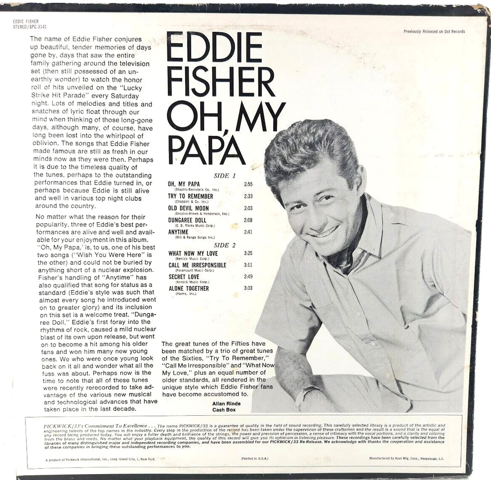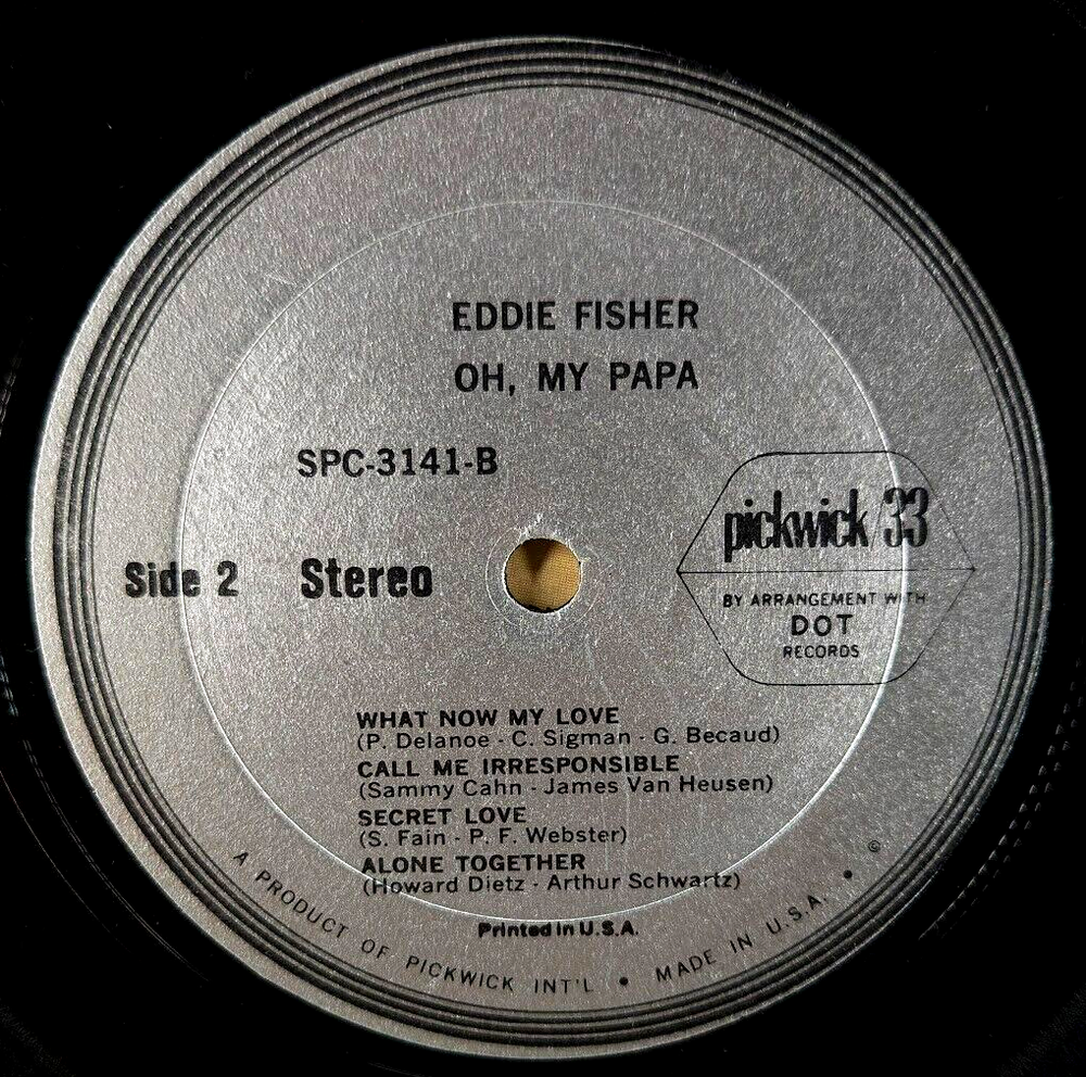 Eddie Fisher Oh My Papa Album Vinyl Pickwick 33 Records Stereo SPC3141 Brand: Pickwick Type: Album Very nice condition Tested. With Case cover. Please see photos for more details Any questions please ask DISCLAIMER: All vinyl records that are between 20-50 vintage yrs. old may show slight minor scratches or smudges but should not affect the quality of the record . We offer 100% customer satisfaction. If your not pleased with your item just return for a full money back guarantee. Thanks for shopping with ViDaMi7 FEEDBACK: Customer satisfaction is very important to us. If you have a problem with your order, please contact us and we will do our best to fix the problem quickly and efficiently. Once you have received and are happy with your purchase, please take a moment to leave us positive feedback and we will leave you a positive feedback in return.