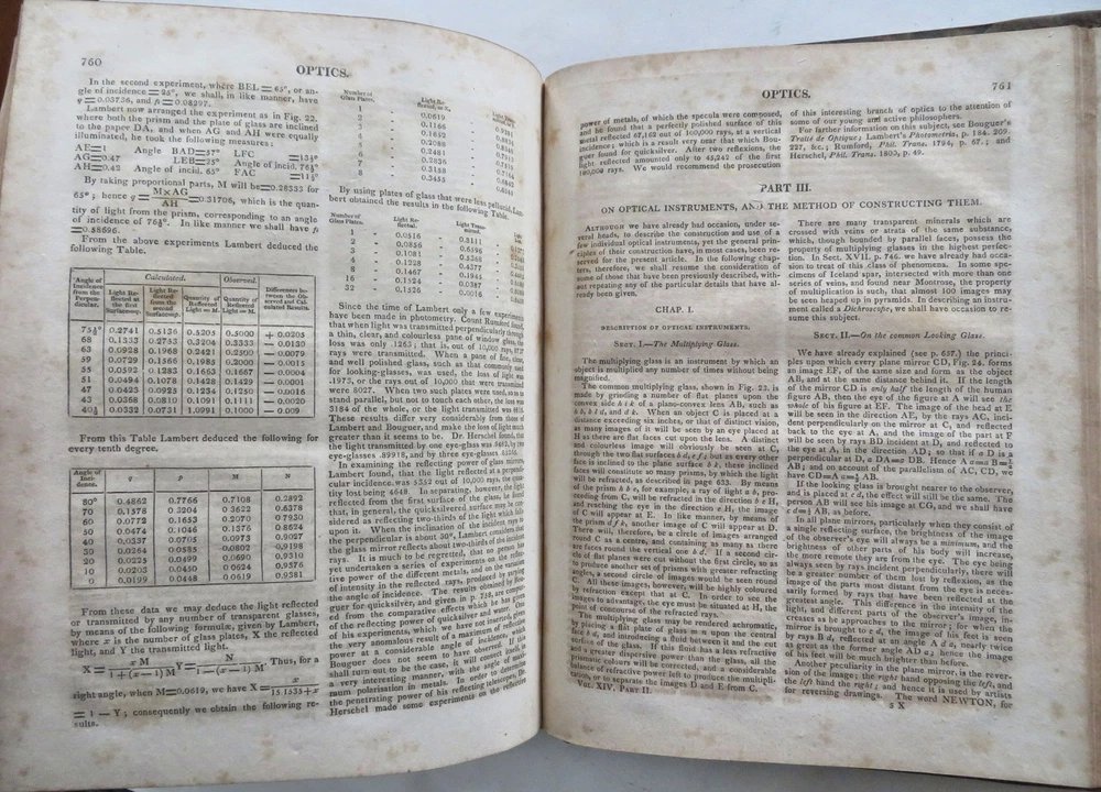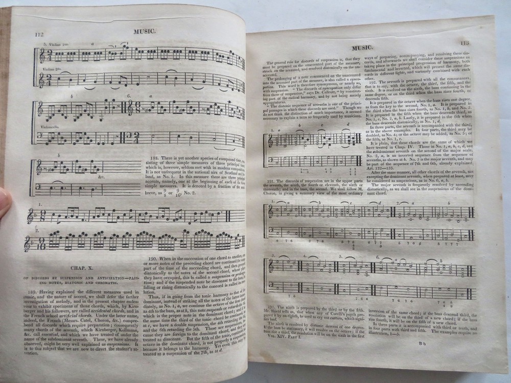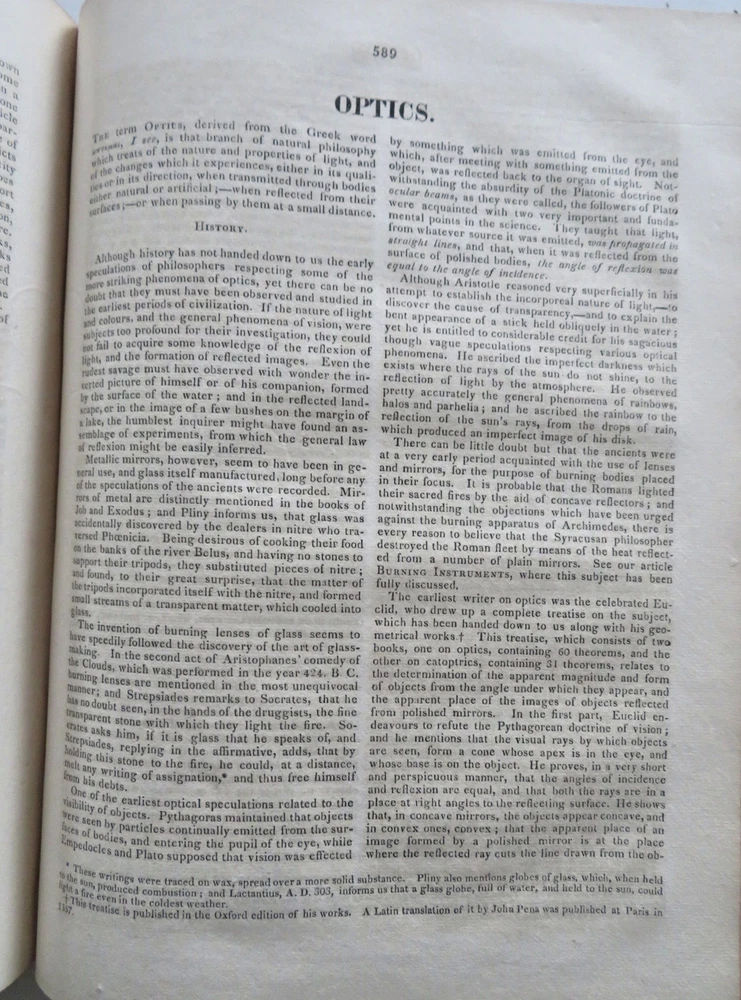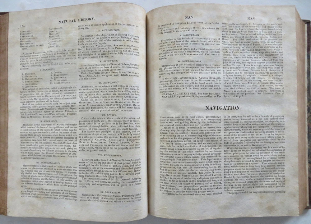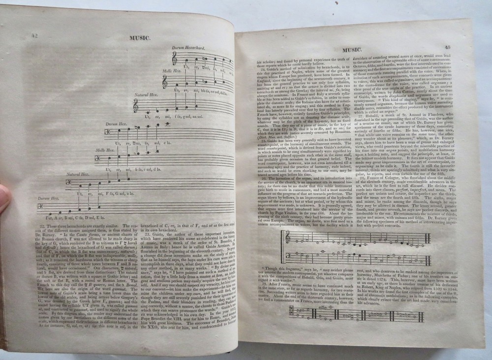 Edinburgh Encyclopedia 1832 Vol. 19 Brewster leather book Edinburgh Encyclopedia 1832 Vol. 19 Brewster leather book (Old Books, 19th Century Books, Leather Books, Reference Books, Edinburgh Encyclopedia, Americana). The Edinburgh Encyclopedia, Conducted by David Brewster. 1st American Edition, published 1832, Philadelphia by John & Edward Parker. 821 pages. Text in English. Attractive antiquarian 1/2 leather binding, slightly raised & gilt bands, gilt title lettering & compartment decorations, marbled covers. Volume 19 of a larger work. Contents of this volume complete unto themselves. The extensive list of contents includes long discussions about Music, Musci, navigation, notations, numismatics (numismatology- 22 pp.), observatories, Ohio, optics (over 200 pp.!, so practically a book unto itself), ordnance, organs and more. Fascinating reading. Book is physically old and shows some signs of handling and time. Binding gently age worn but still appealing, leather and joints dried, scuffed, chipped, joints cracked (but covers still well attached), remains overall attractive as a hand-made object of the era. Text block paper is gently age toned as typical, internally book remains mostly clean, tight and sound. A book which has been taken care of but may/ does not look like new. Still attractive on the shelf. Book displays a pleasing and unique age patina and is in rather nice antiquarian condition, any age flaws seem easy to overlook or forgive. Please review photos for more detailed attempt to present this book as it survives. We often over-describe any flaws that many sellers would not even bother to mention since most people would overlook them as minor and unworthy of comment. Many people tell us the books they receive from us are nicer in person than they appears on the screen. We want you to be clear about what you are buying, so we take numerous photos and try to describe it openly and honestly. Book Measures c. 11 1/4" H x 8 3/4" W. [B11882].