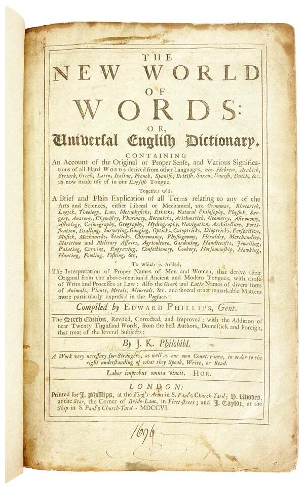 The New World of Words: Or, Universal English Dictionary. Containing An Account of the Original or Proper Sense, and Various Significations of all Hard Words derived from other Languages, viz. Hebrew, Arabick, Syriack, Greek, Latin, Italian, French, Spanish, British, Saxon, Danish, Dutch, &c. as now made use of in our English Tongue Author: Edward Phillips; John Kersey [ed.] Title: The New World of Words: Or, Universal English Dictionary. Containing An Account of the Original or Proper Sense, and Various Significations of all Hard Words derived from other Languages, viz. Hebrew, Arabick, Syriack, Greek, Latin, Italian, French, Spanish, British, Saxon, Danish, Dutch, &c. as now made use of in our English Tongue Publication: London: Printed for J. Phillips, at the King's-Arms in S. Paul's Church-Yard; N. Rhodes, at the Star, the Corner of Bride-Lane, in Fleet-street; and J. Taylor, at the Ship in St. Paul's Church-Yard, 1706 Description: Very Good +. London: Printed for J. Phillips, at the King's-Arms in S. Paul's Church-Yard; N. Rhodes, at the Star, the Corner of Bride-Lane, in Fleet-street; and J. Taylor, at the Ship in St. Paul's Church-Yard, 1706. Folio. Unpaginated; A2 A-Z4 2a-2b4 2A-2L4 2M2 2*M1 3A-3V4 4A-4O4 5A-5Z4; lacks engraved frontispiece. Recently rebound in full Cambridge-style calf with six raised bands to spine, red leather title label, and new endpapers. Tight in binding; marginal spotting and soiling though text remains legible throughout. A handsomely bound, Very Good or better copy. According to Starnes and Noyes, Kersey's revisions to this edition were so extensive that this work should be considered an entirely new dictionary. Moreover, this was a "universal dictionary, so intelligently planned and executed as to constitute a distinguished performance and a worthy forerunner of Johnson." (Starnes and Noyes. The English Dictionary from Cawdrey to Johnson 1604-1705, p. 84) [ESTC No: T101516]. Seller ID: 30172 Subject: 18th Century, England / English Writers, Language, Reference Capitol Hill Books is a used bookstore located on historic Capitol Hill in Washington DC, with three floors of quality used books, first editions, and rare books. [Note: Our online inventory is stored and managed at a separate location from at our brick and mortar shop. If you have a question about an item listed online, please send a direct message here rather than calling the store so that we can make sure someone familiar with the item in question can respond.] Terms Books described only as First Editions are First Printings unless otherwise specified. All items are guaranteed to be as described or they may be returned within 30 days of receipt for a full refund. All orders ship within two business days. Standard mail is USPS Media Mail. Expedited and international shipping are also available (please contact for estimates). We offer combined shipping on multiple orders. This listing was created by Bibliopolis.