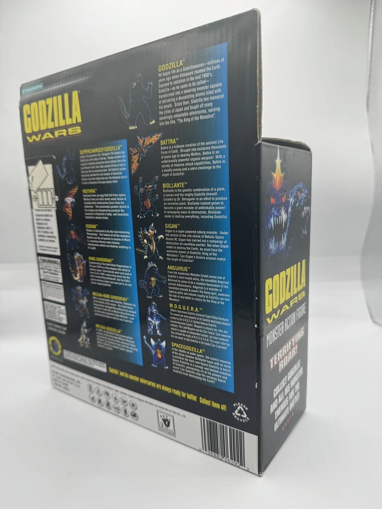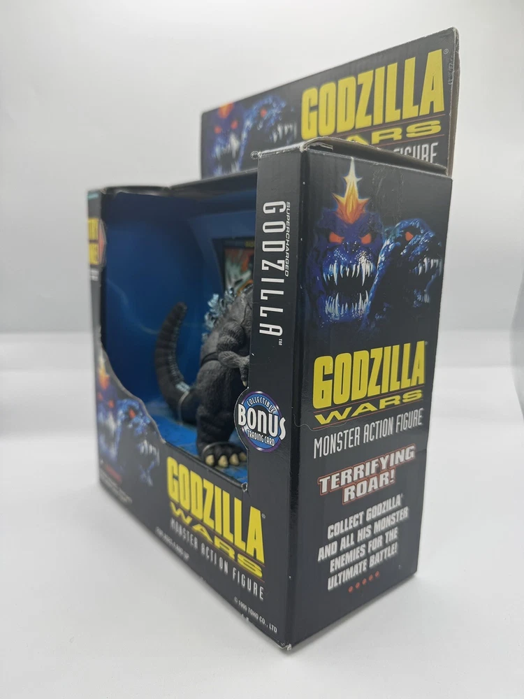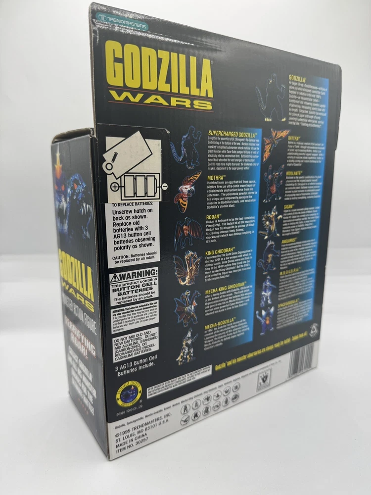 This electronic Godzilla Wars monster action figure, manufactured by Trendmasters in 1995, is a must-have for any fan of the Godzilla franchise. Measuring 5 inches in size, this figure features the iconic Monster character from the popular movie series and comes with a card for safekeeping. The figure is in excellent working order and is sure to impress collectors and enthusiasts alike. With its detailed design and high-quality construction, this Trendmasters Godzilla figure is a true gem. Don't miss your chance to add this rare piece to your collection.