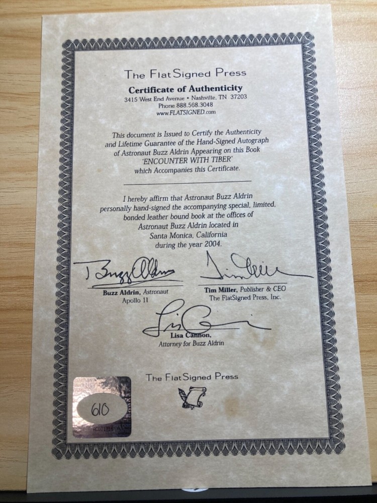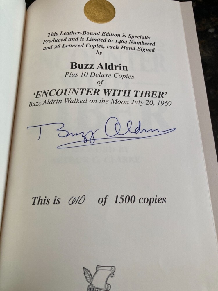This is a limited edition, leather-bound edition #610 of 1500 hand-signed by moonwalker Buzz Aldrin in rich blue ballpoint, includes COA of the private signing which took place at Aldrin’s offices in CA in 2004