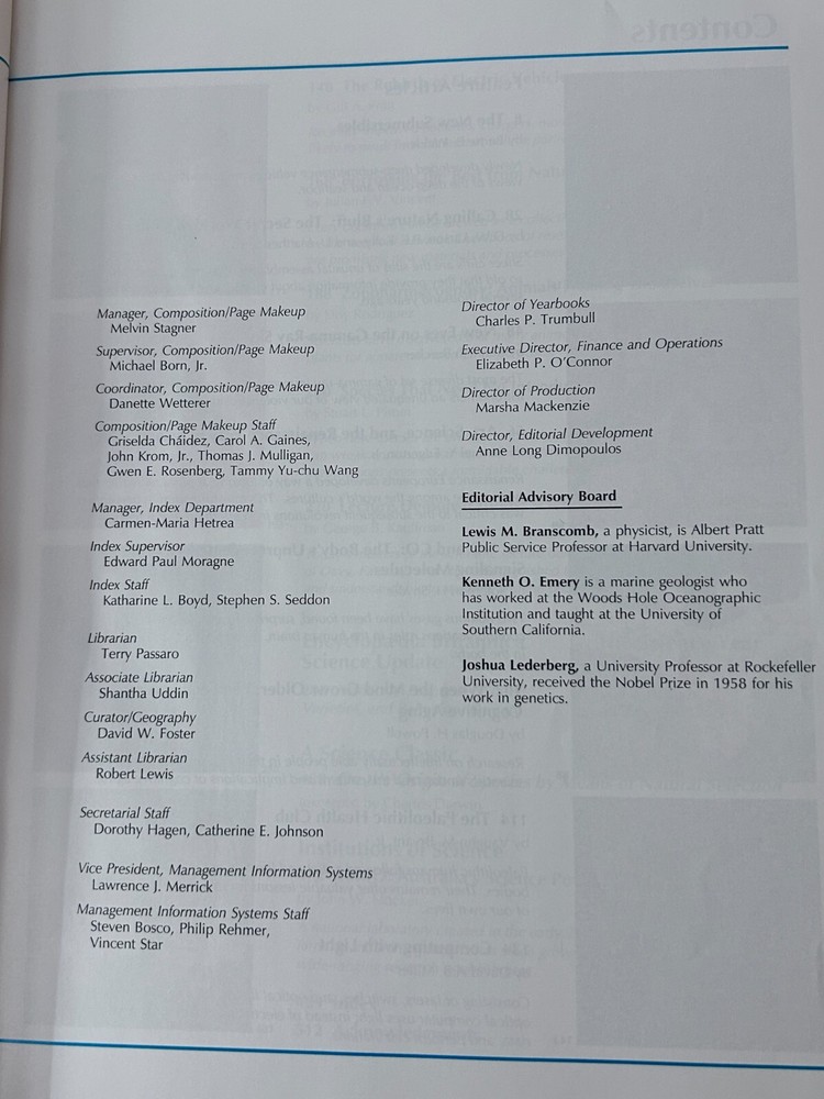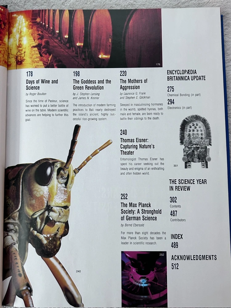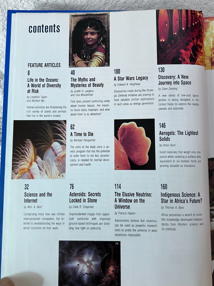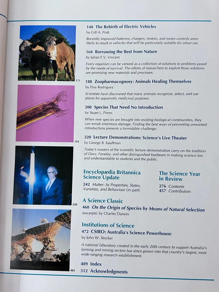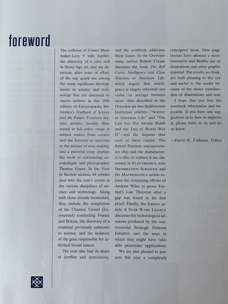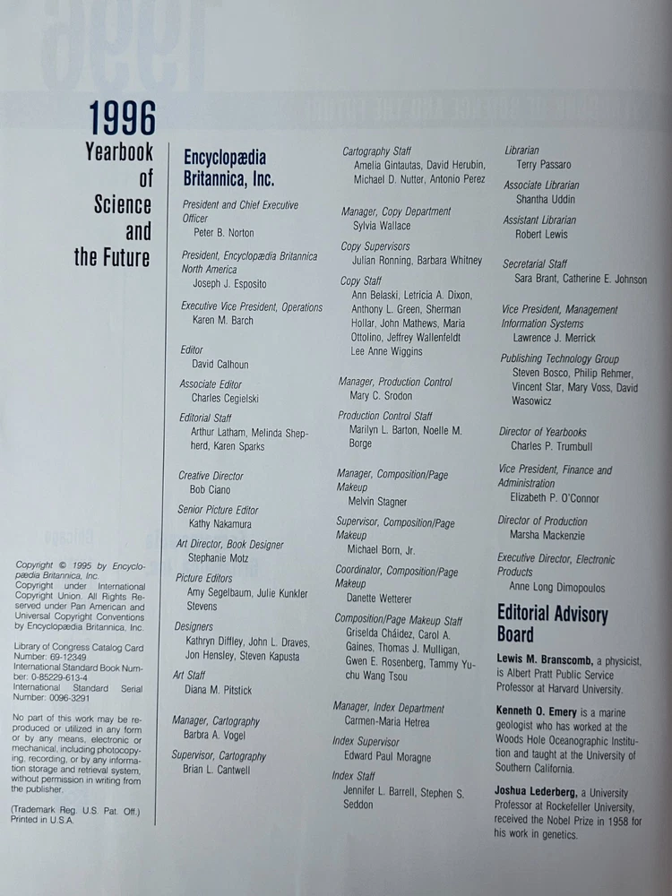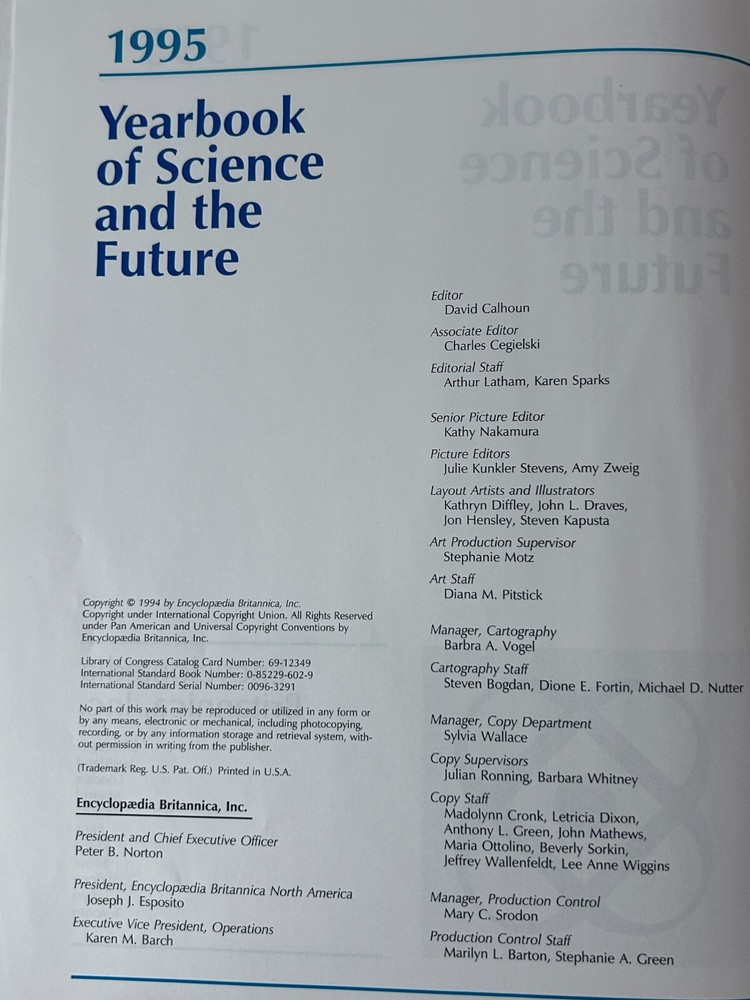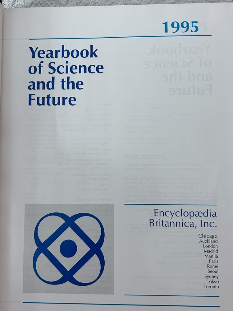 Encyclopaedia Britannica Inc., Yearbook of Science and the Future 1995 The 1995 Yearbook of Science and the Future, published by Encyclopaedia Britannica Inc., likely covered advancements in various scientific fields. It would have included articles on topics such as atomic manipulation on surfaces, the development of new algorithms, and the use of large computing resources in scientific research. The yearbook would have also featured expert-written articles on major scientific topics, aiming to be both a reference book and an educational resource. Here's a more detailed breakdown of what the 1995 Yearbook would have included: Advances in Atomic Manipulation: The year 1993 saw a significant success in the field of atomic manipulation on surfaces, which the yearbook would have highlighted. Computer Science and Algorithms: The development of new algorithms and the availability of larger computing resources enabled researchers to investigate more complex systems, which would have been discussed in the yearbook. "Isotopically Engineered" Samples: The increasing use of experiments on "isotopically engineered" samples would have been discussed as a way to elucidate basic mechanisms and discover new physics, according to the UCSB MRL publication . Expert-Written Articles: The yearbook would have featured carefully edited articles written by credible and identifiable experts in their respective fields, as stated by TCNJ. Reference and Educational Material: The yearbook would have aimed to be both a valuable reference work and a source of educational material, according to Wikipedia . Systematization of Knowledge: The 15th edition of the Encyclopaedia Britannica adopted a third goal, which was to systematize all human knowledge, and the yearbook would have reflected this goal. Encyclopaedia Britannica Inc., Yearbook of Science and the Future 1996 The Encyclopaedia Britannica Yearbook of Science and the Future 1996 was a yearly publication that covered developments in science, technology, and the future, particularly in relation to the then-evolving information age . It likely included articles on various scientific disciplines, emerging technologies like the internet, and speculative predictions about the future. Elaboration: Content: The yearbook likely contained articles on a wide range of scientific fields, such as physics, biology, chemistry, and mathematics. It would also have covered emerging technologies like the internet, mobile phones, and software development. Focus on the Future: A significant portion of the yearbook would have been dedicated to speculating about the future, potentially including predictions about the impact of new technologies on society, the environment, and the economy. Encyclopaedia Britannica's Role: The Britannica's role was to provide a reliable and comprehensive overview of scientific advancements and futuristic trends, contributing to the dissemination of knowledge and fostering public understanding of science and technology. Information Age: Given the year of publication (1996), the yearbook would likely have covered the burgeoning information age, with articles on the development of the internet, computer networks, and digital communications. Target Audience: The yearbook was likely aimed at a wide audience, including scientists, educators, students, and the general public interested in science, technology, and the future.