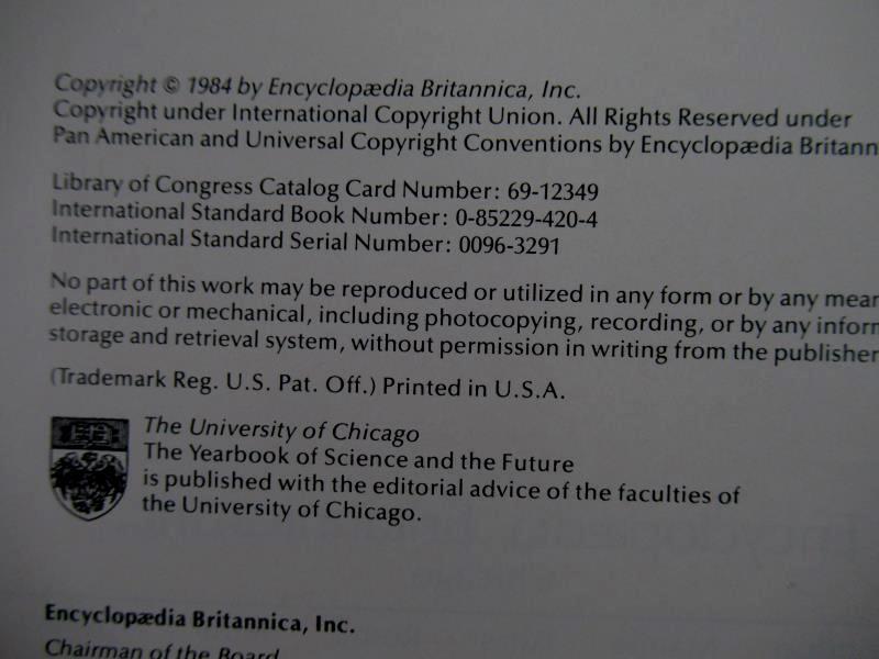 Explore the "Science and The Future 1985 Yearbook" by Encyclopaedia Britannica, published in 1984. This hardcover book boasts 445 pages filled with intriguing insights. It is in good pre-owned condition, perfect for enhancing your collection. Dimensions: 1.5" (length) x 8.75" (width) x 11.25" (height). ISBN: 0-0852294204.