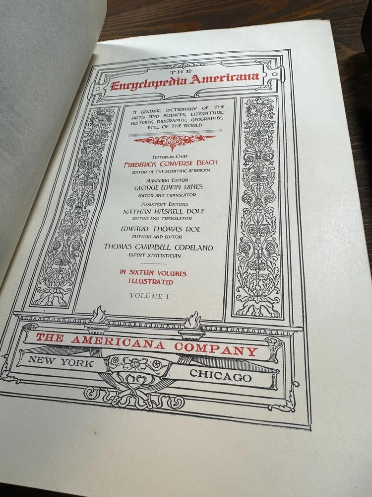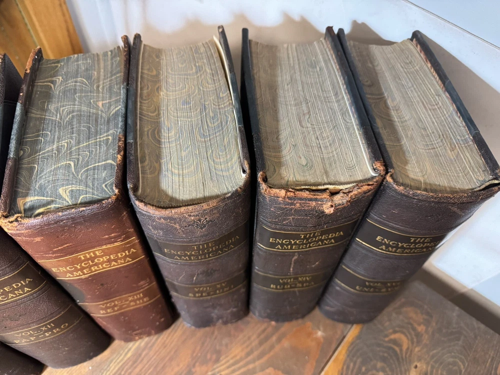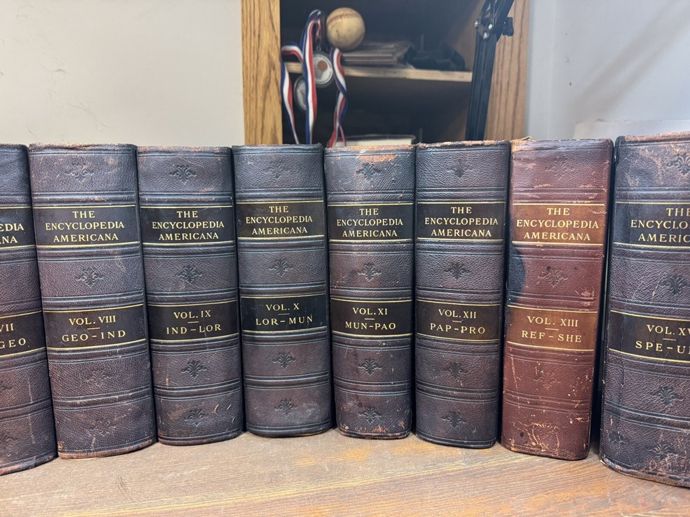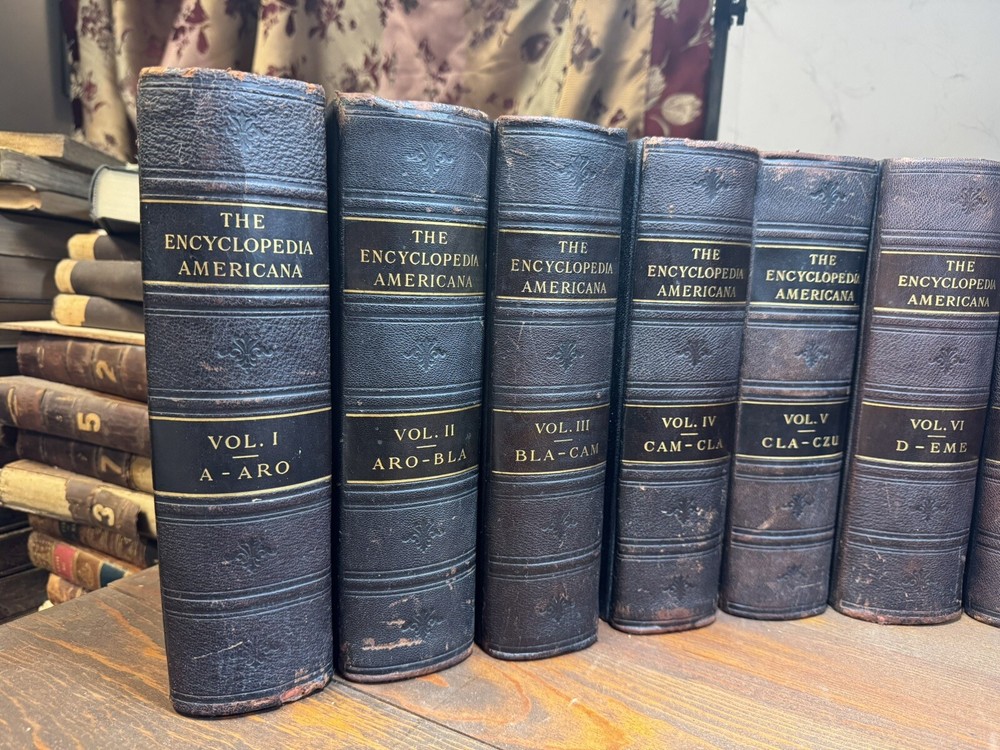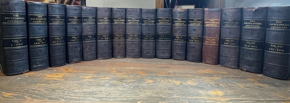 This is a complete set of the Encyclopedia Americana from 1903, consisting of 16 volumes. The bindings are made of leather and the set includes illustrations. It is a valuable reference work for those interested in Americana, and would make a great addition to any collection of antiquarian and collectible books and magazines. 16 volumes complete. A couple of hinges have been reinforced. A gorgeous scarce set. Displays very nicely as seen in photo 1. Free shipping inside US. Will come in 2 heavy boxes.