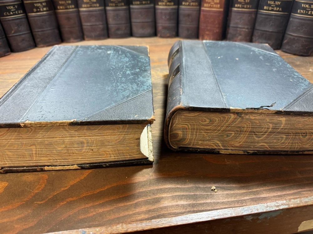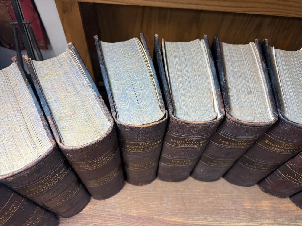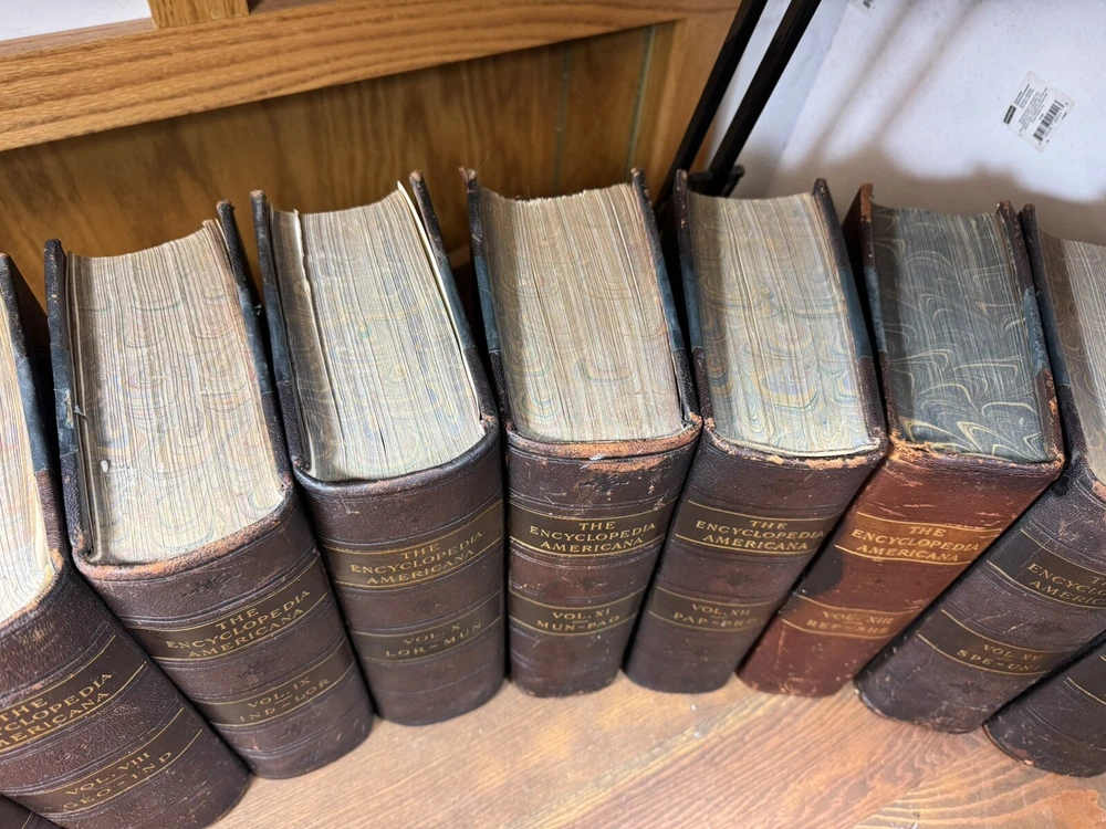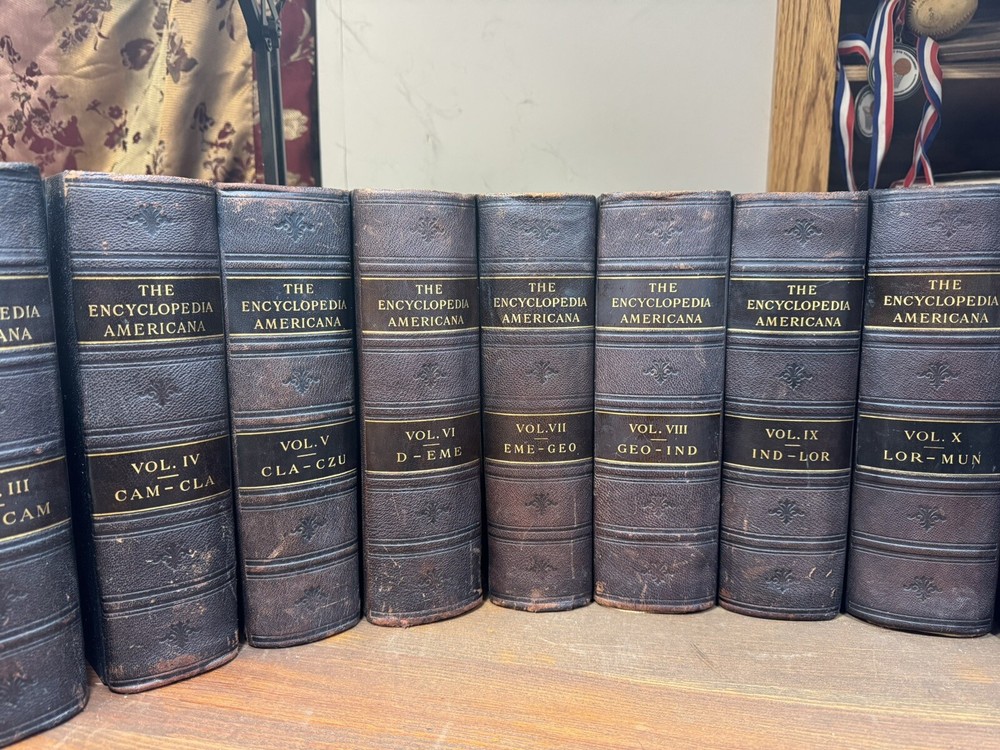 This is a complete set of the Encyclopedia Americana from 1903, consisting of 16 volumes. The bindings are made of leather and the set includes illustrations. It is a valuable reference work for those interested in Americana, and would make a great addition to any collection of antiquarian and collectible books and magazines. 16 volumes complete. A couple of hinges have been reinforced. A gorgeous scarce set. Displays very nicely as seen in photo 1. Free shipping inside US. Will come in 2 heavy boxes.