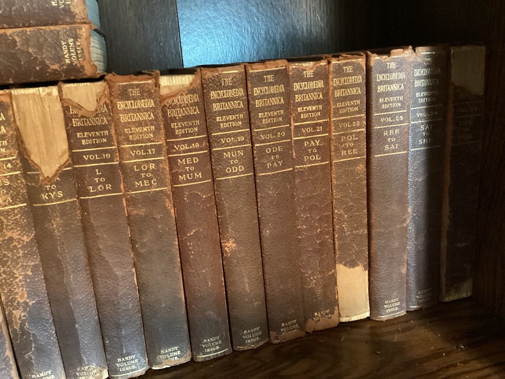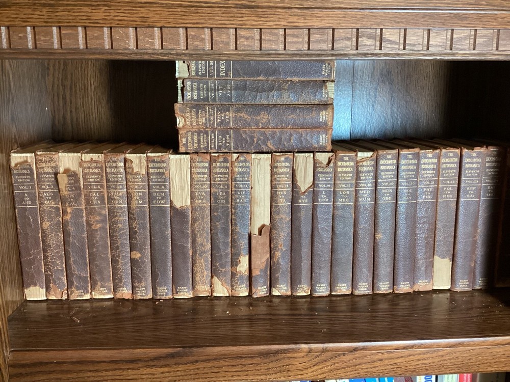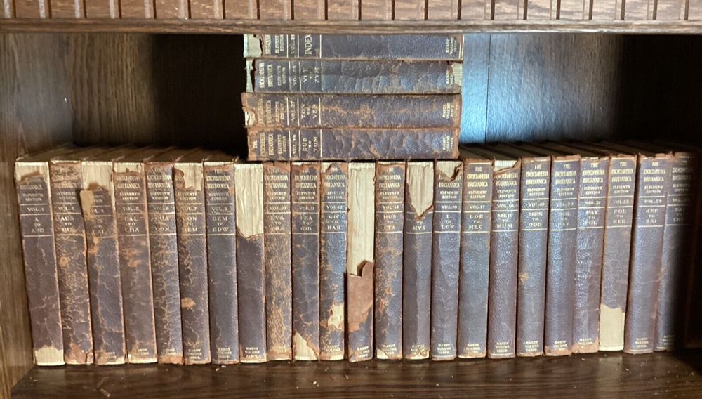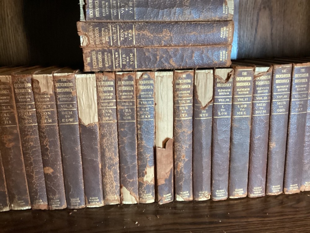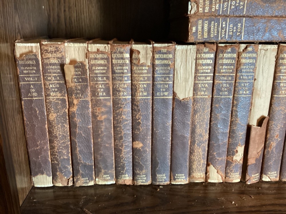 The 11th Edition of the Encyclopedia Britannica is celebrated for its authoritative and comprehensive articles, many of which were written by the leading figures of the early 20th century. This edition captures a pivotal moment in history, offering insights into the world as it was seen by scholars, scientists, and thinkers of that era. The breadth and depth of its content cover every conceivable subject, from the arts and sciences to geography and history, making it an indispensable resource for researchers, historians, and enthusiasts of knowledge. The complete set of the 1910 Encyclopedia Britannica, 11th Edition, bound in leather has matured with time into a distinguished patina. This edition is renowned for its depth of knowledge and range of subjects, written by some of the leading experts of the early 20th century. It offers a snapshot of the world's understanding at a pivotal historical moment, providing valuable insights into the scientific, cultural, and geographical knowledge of that era. The leather binding of each volume bears the marks of age, giving it a unique character and making it a striking feature for any library. The pages are edged with gold leaf, adding a subtle touch of elegance to the weathered exterior. This set combines historical significance with the tangible beauty of aged leather craftsmanship, appealing to those who appreciate the aesthetic of antique books as much as their content. 28 volumes missing only Vol 2. Original binding.