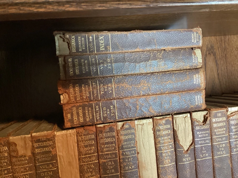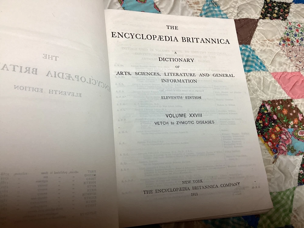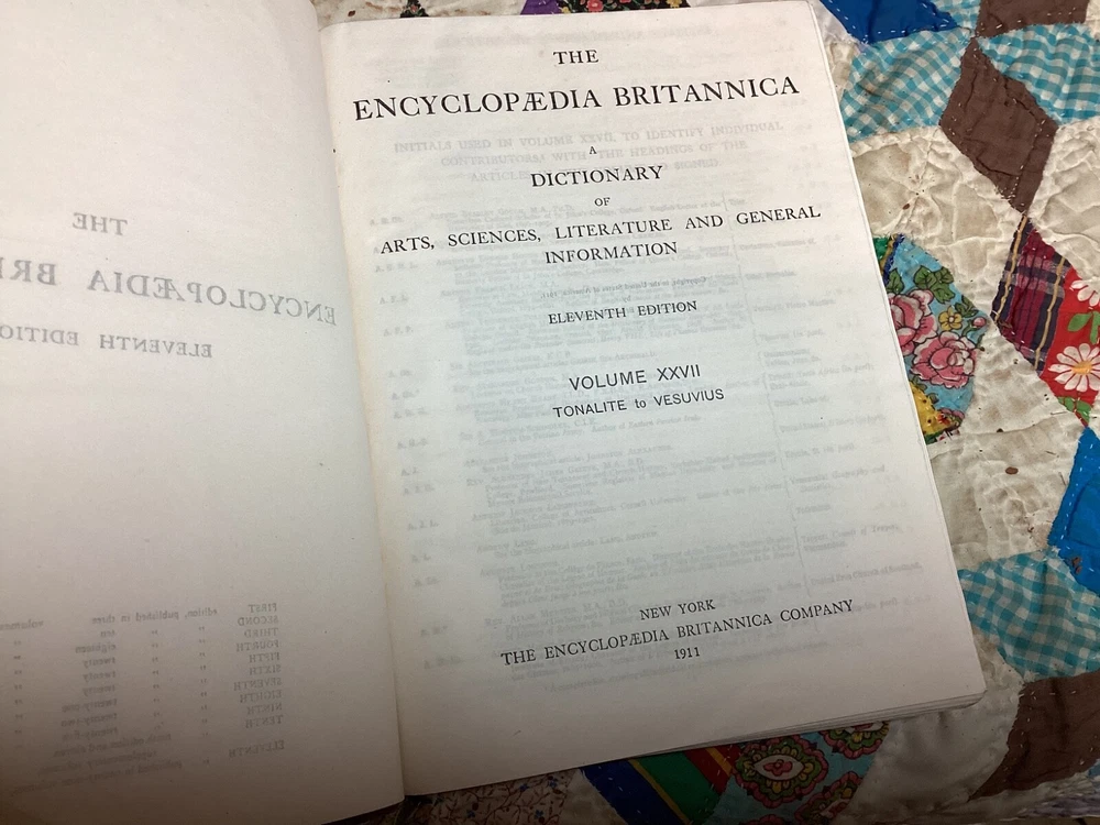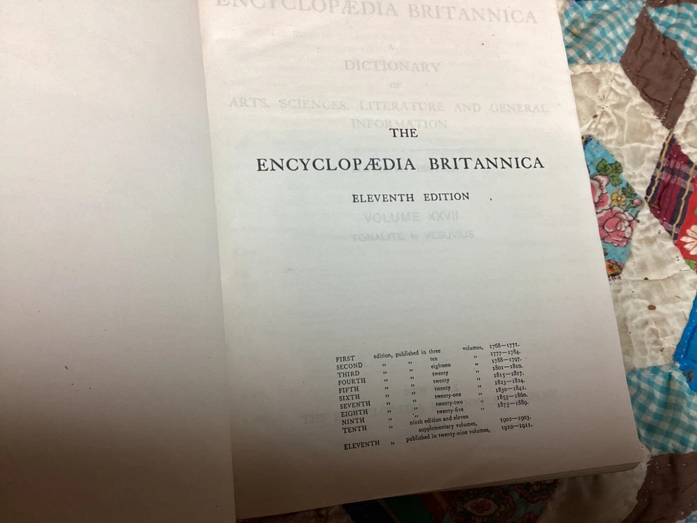 The 11th Edition of the Encyclopedia Britannica is celebrated for its authoritative and comprehensive articles, many of which were written by the leading figures of the early 20th century. This edition captures a pivotal moment in history, offering insights into the world as it was seen by scholars, scientists, and thinkers of that era. The breadth and depth of its content cover every conceivable subject, from the arts and sciences to geography and history, making it an indispensable resource for researchers, historians, and enthusiasts of knowledge. The complete set of the 1910 Encyclopedia Britannica, 11th Edition, bound in leather has matured with time into a distinguished patina. This edition is renowned for its depth of knowledge and range of subjects, written by some of the leading experts of the early 20th century. It offers a snapshot of the world's understanding at a pivotal historical moment, providing valuable insights into the scientific, cultural, and geographical knowledge of that era. The leather binding of each volume bears the marks of age, giving it a unique character and making it a striking feature for any library. The pages are edged with gold leaf, adding a subtle touch of elegance to the weathered exterior. This set combines historical significance with the tangible beauty of aged leather craftsmanship, appealing to those who appreciate the aesthetic of antique books as much as their content. 28 volumes missing only Vol 2. Original binding.
