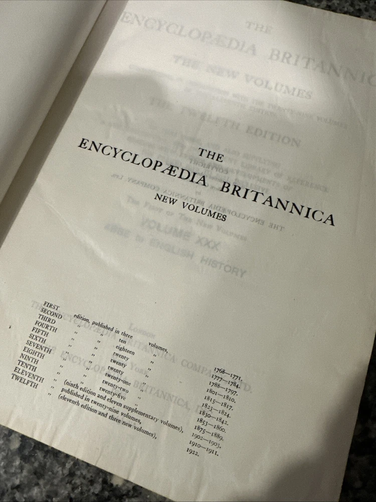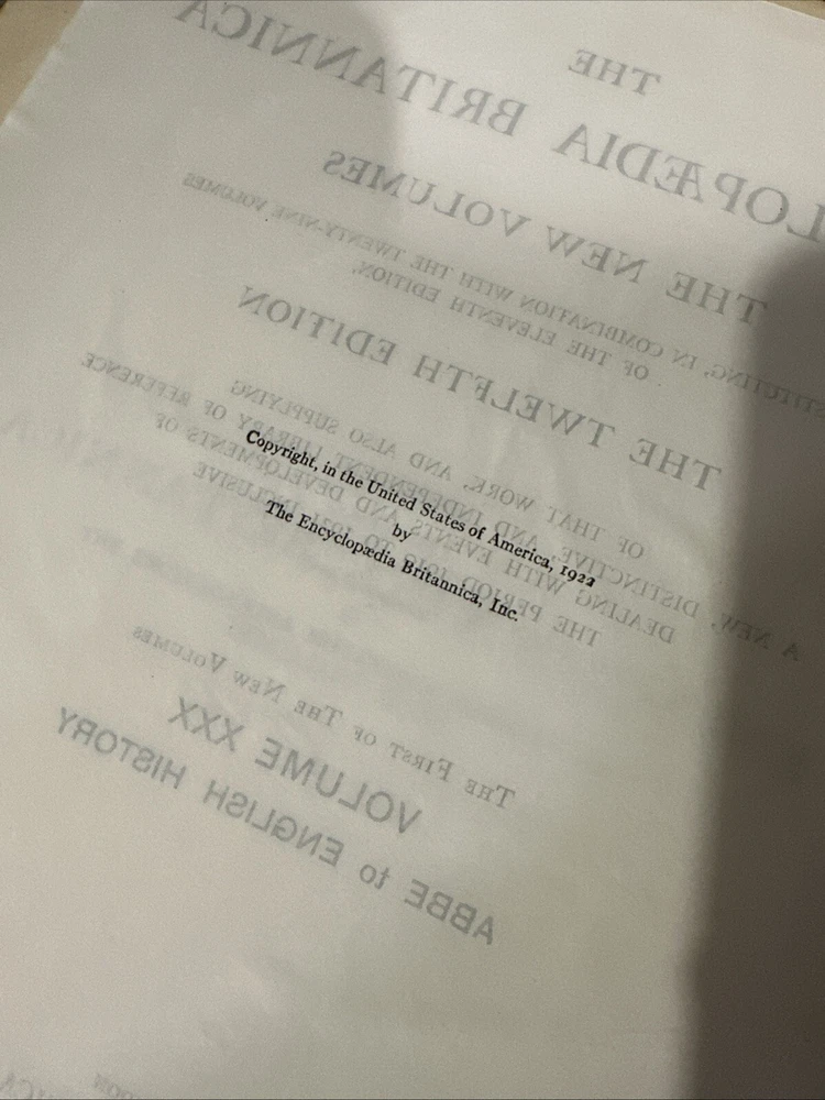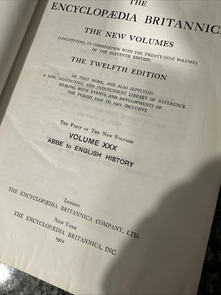 Nice condition book : some signs of wear typical of antique books, such as minor scuffing on the leather covers, slight foxing on some pages, and gentle spine creasing. Despite these age-related marks, the book remain structurally sound, with intact binding and pages free from major tears or stains "The book is encased in protective plastic sleeves, not laminated, to maintain and preserve the integrity of the leather binding and its natural aging process." I have two additional listings within the same volume series. Let me know, and I'll combine shipping for you and offer a discount 1) Encyclopedia Britannica 12th Edition 1922 New Volumes Twelfth Volume XXXI 📚Book https://www.ebay.com/itm/196906111938 2) Encyclopedia Britannica 12th Edition 1922 New Volumes Twelfth Volume XXXII📚Book https://www.ebay.com/itm/196906113674 Encyclopedia Britannica 12th Edition 1922 - Volume XXX 📚 Dive into the wealth of knowledge with this rare 1922 Encyclopedia Britannica 12th Edition - Volume XXX . This volume covers topics from Abbe to English History , offering a comprehensive look at a wide range of subjects. Why This Book is Unique : Historical Insight : Published in 1922, this volume provides a snapshot of the knowledge and perspectives of the early 20th century. Scholarly Content : Authored by experts of the time, it's celebrated for its depth and accuracy. Collector's Item : The classic leather binding and elegant design make this volume a prized possession for collectors and enthusiasts. Condition : Due to its age, the book shows some minor wear, adding to its charm and authenticity. The wear is typical for antique books and does not affect the readability or structural integrity. Add this remarkable piece to your collection and own a slice of intellectual history!