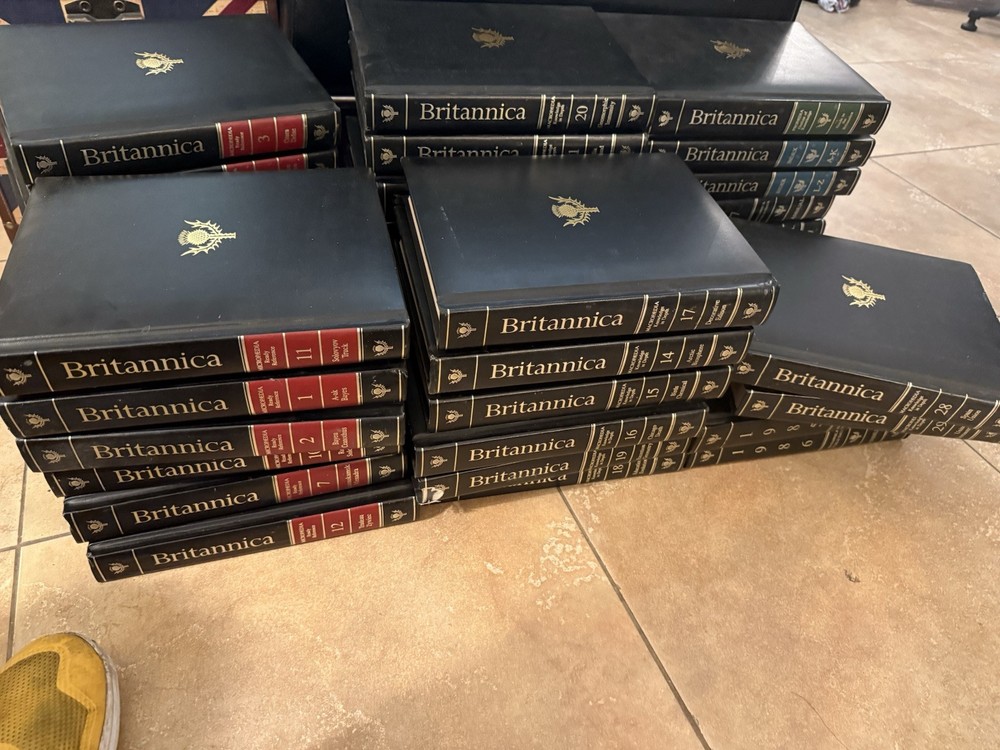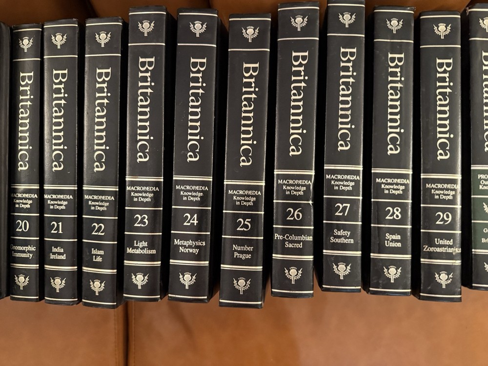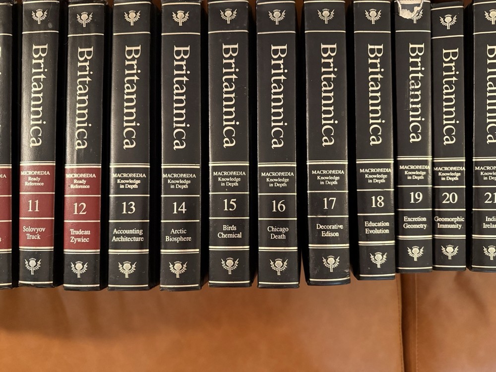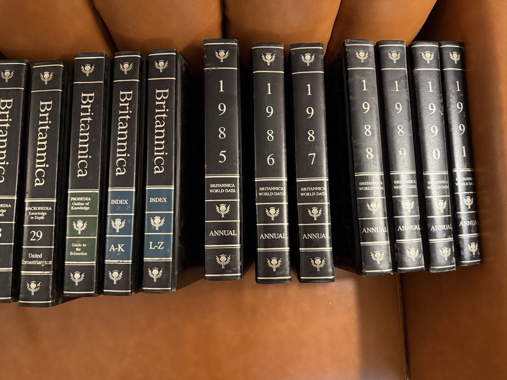 PRICE REDUCED! GRAB THIS BARGAIN NOW! Encyclopedia Britannica 15th Edition, magnificent black leather padded bindings. Excellent condition, published by Encyclopædia Britannica, Inc in 1986 The set also includes the annuals from 1985 to 1991. 39 volumes