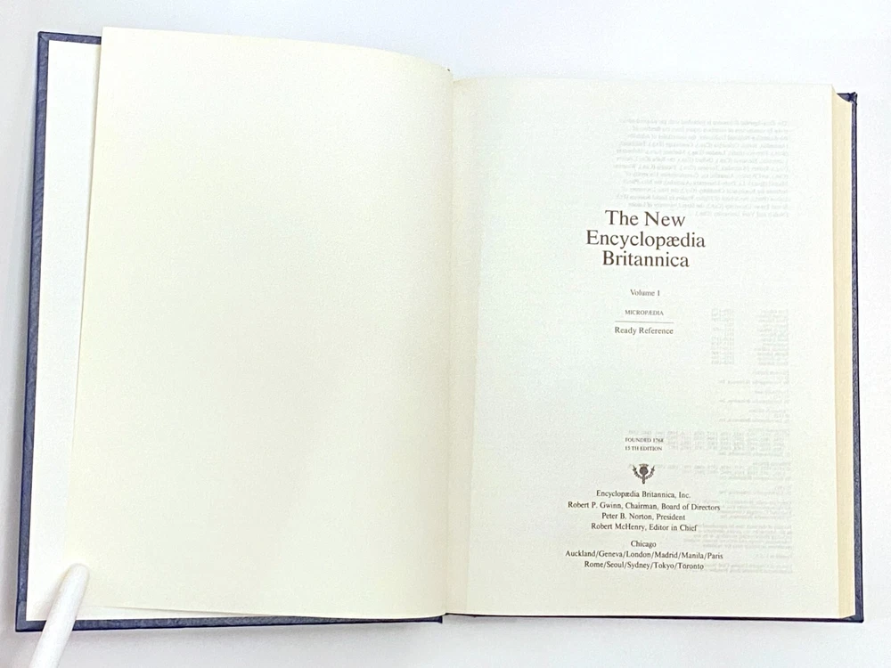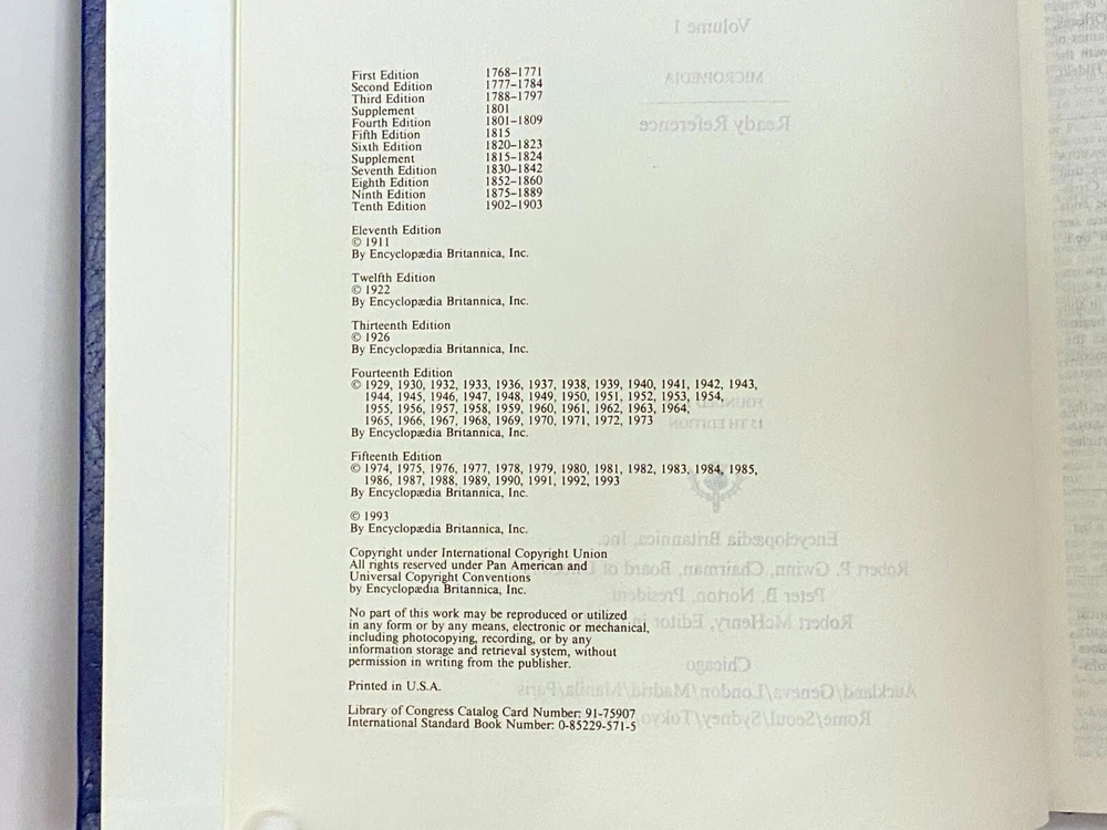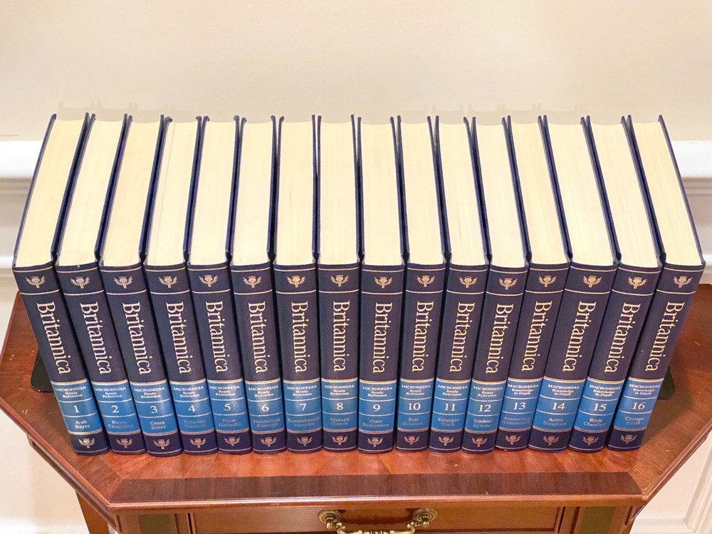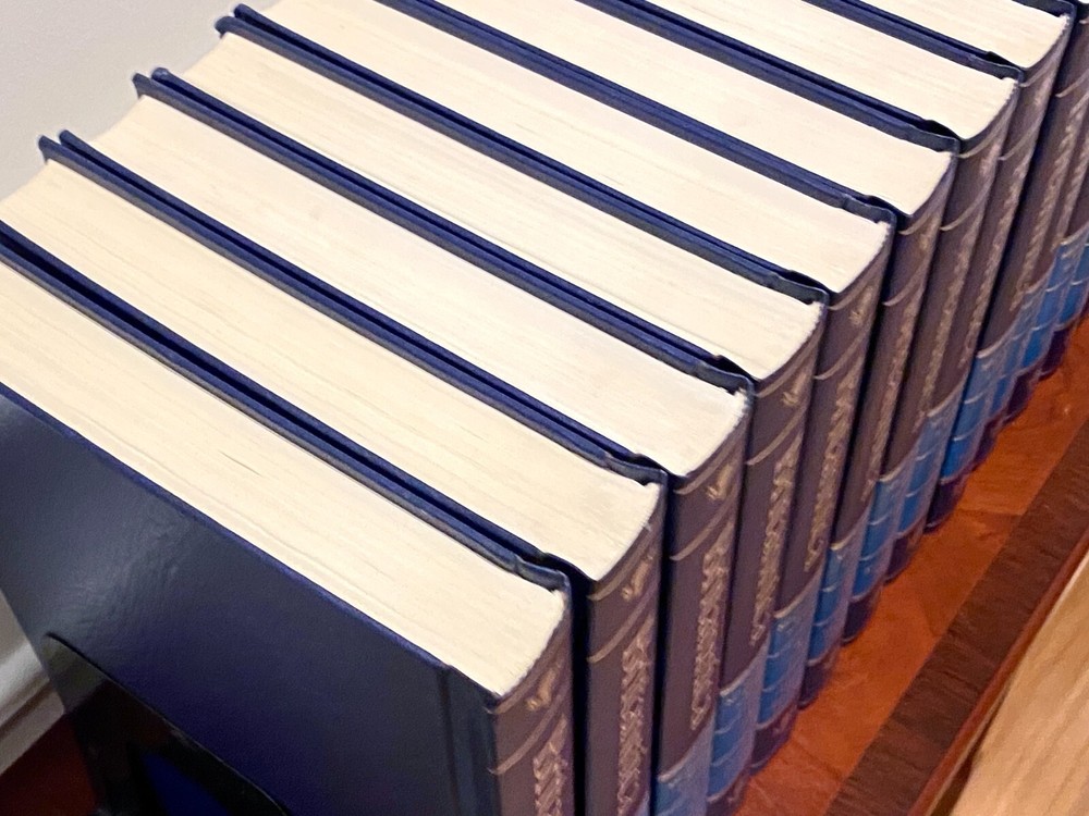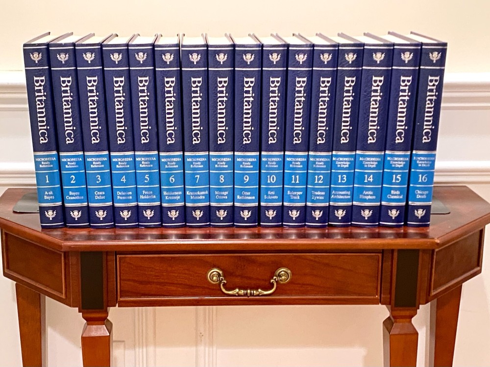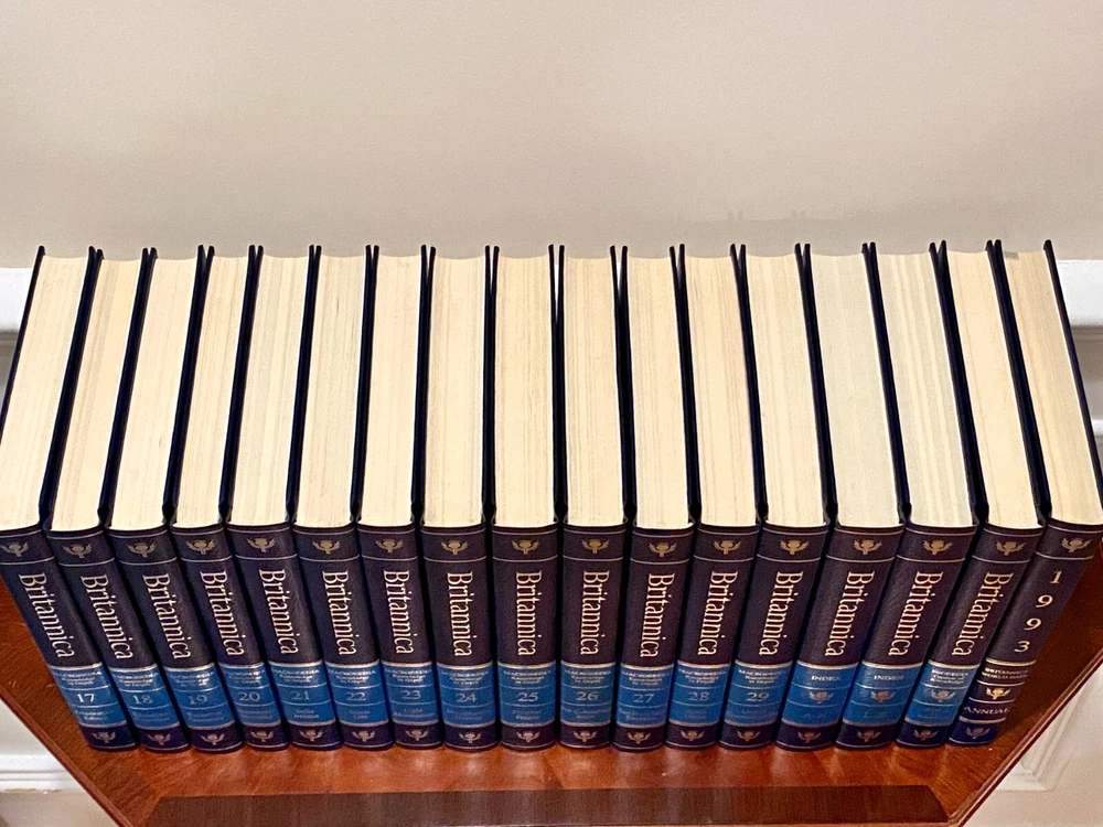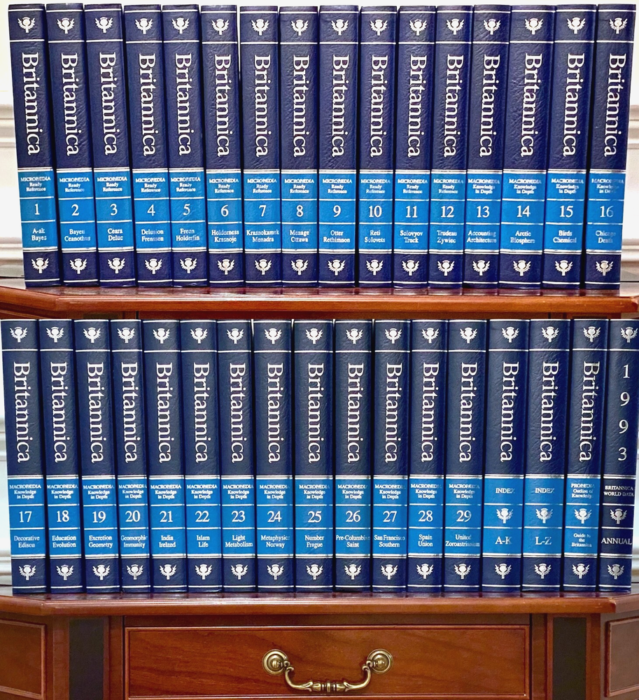 Encyclopedia Britannica 15th Edition 1993 Complete Blue Leather Set 33 books The condition on the books is very good. Each volume is bound in beautiful dark blue faux leather covers with silver lettering. Pages are excellent, with many color illustrations. This is a top quality set in very good condition which appears to have been well cared for and seldom used. They are substantial books, each weighing 3-4 lbs. The only defects noted were some slight indenting of the corners of a few of the volumes from moving and storage. Please see photos. Set includes these 33 books: Micropedia (Ready Reference) - Volumes 1 - 12 Macropedia (Knowledge in Depth) - Volumes 13 - 29 Index (2 volumes) Propedia (Outline of Knowledge & Guide to the Britannica) - (1 volume) 1993 Annual Volume Will be carefully packed and includes free economy shipping in multiple boxes.