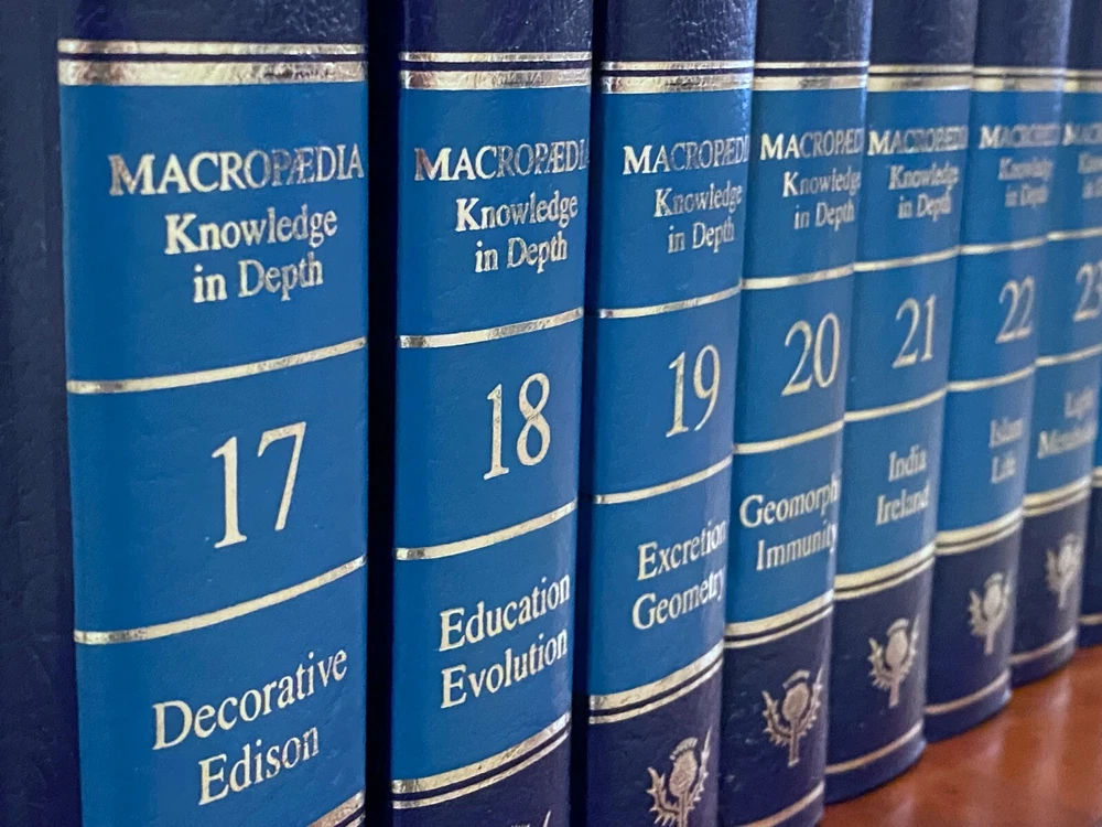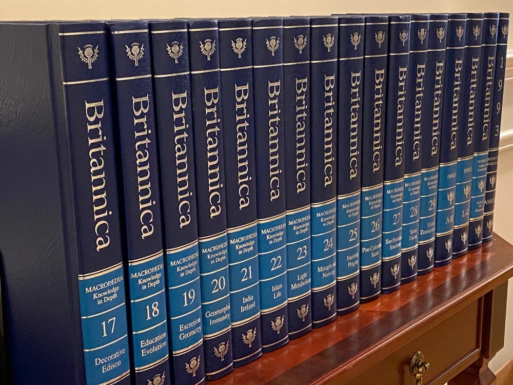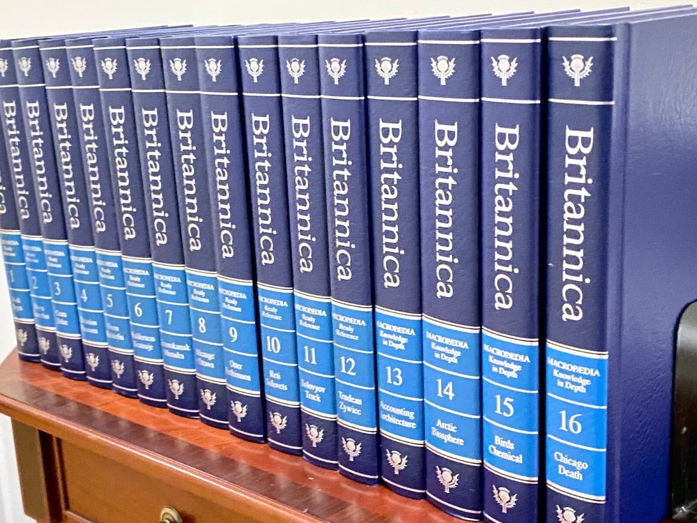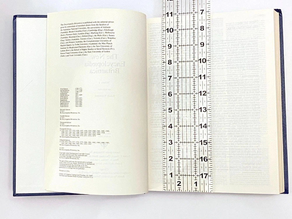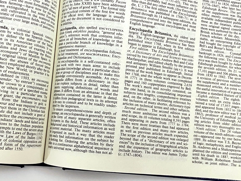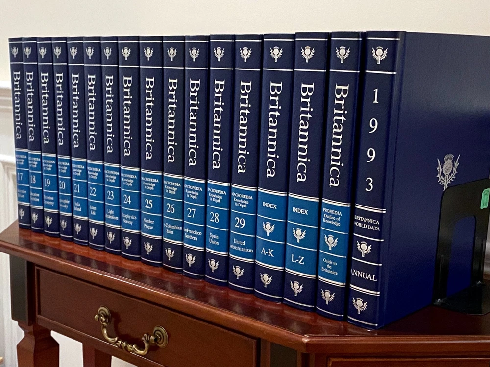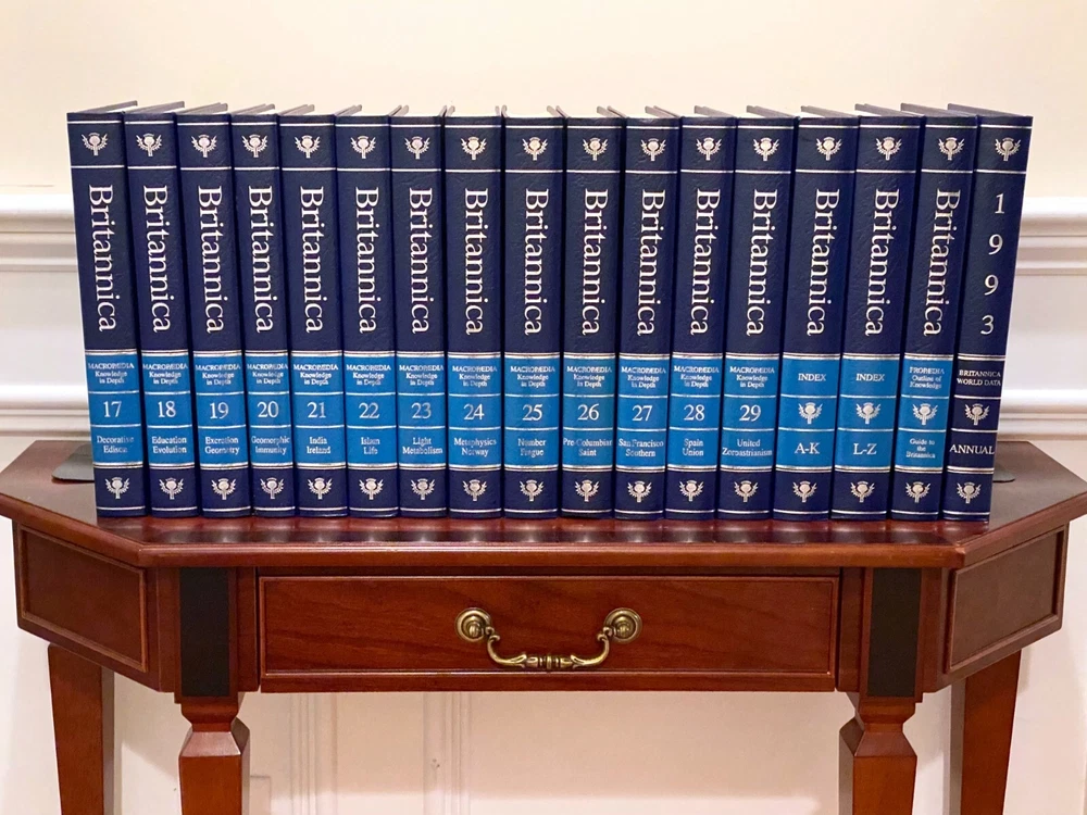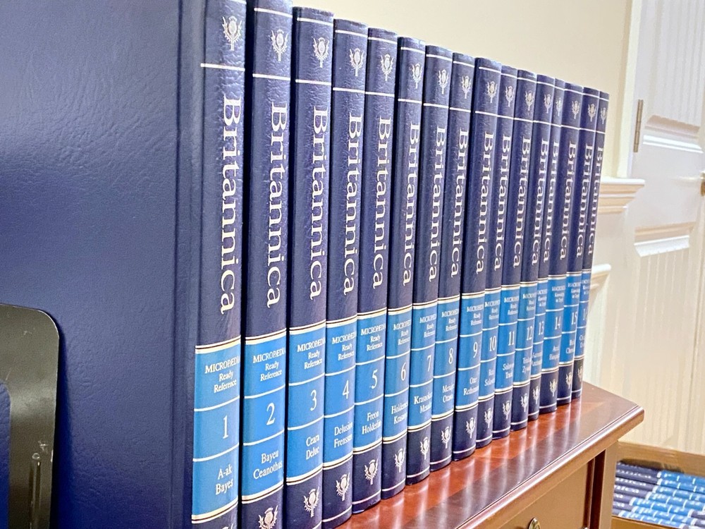 Encyclopedia Britannica 15th Edition 1993 Complete Blue Leather Set 33 books The condition on the books is very good. Each volume is bound in beautiful dark blue faux leather covers with silver lettering. Pages are excellent, with many color illustrations. This is a top quality set in very good condition which appears to have been well cared for and seldom used. They are substantial books, each weighing 3-4 lbs. The only defects noted were some slight indenting of the corners of a few of the volumes from moving and storage. Please see photos. Set includes these 33 books: Micropedia (Ready Reference) - Volumes 1 - 12 Macropedia (Knowledge in Depth) - Volumes 13 - 29 Index (2 volumes) Propedia (Outline of Knowledge & Guide to the Britannica) - (1 volume) 1993 Annual Volume Will be carefully packed and includes free economy shipping in multiple boxes.