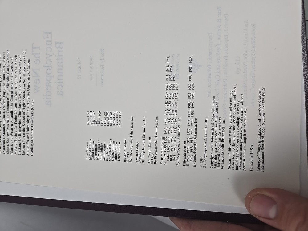 The product is a 15th edition of Encyclopedia Britannica from 1768 to 1994, with a leather binding and published in English by Encyclopædia Britannica, Inc in the United States. It is an original print and not a facsimile, making it a valuable and collectible item for those interested in reference works and encyclopedias. With multiple authors contributing to its content, this edition offers a comprehensive and authoritative guide to a wide range of topics, making it a timeless and informative resource for any individual or institution seeking knowledge and information. Item in Good Pre-Owned condition - Item Doesn't Appear to have any Folded Pages, Water Damage or Rips - See pictures for more details