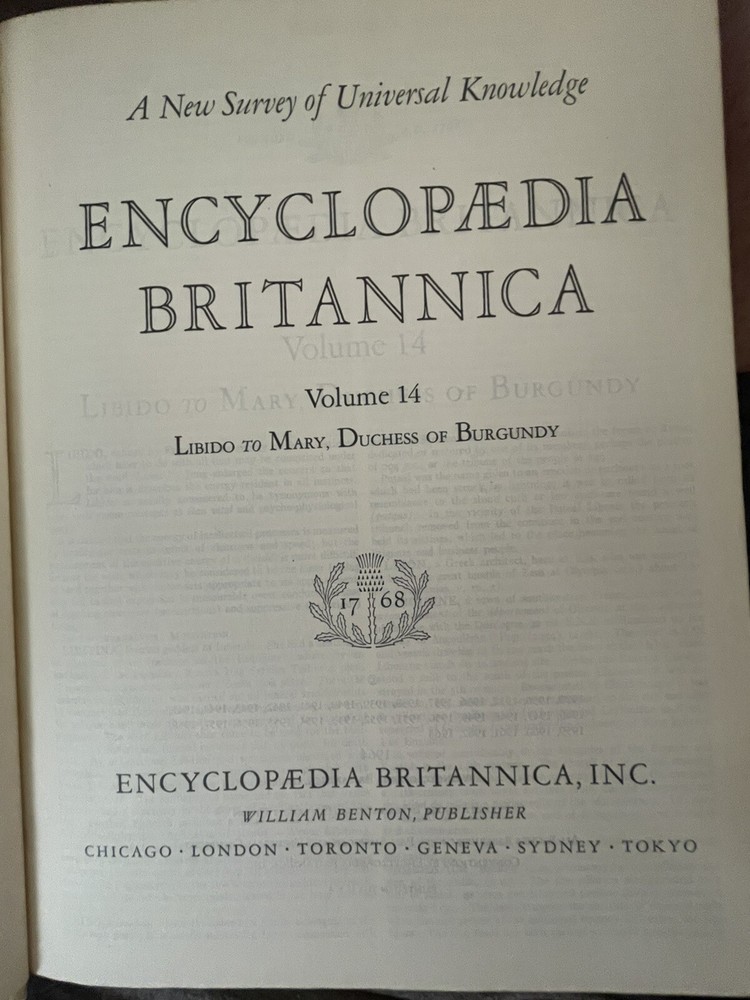 Encyclopedia Britannica 1964 32nd Edition Cream Faux Leather Volume 14. Shipped with USPS Media Mail.