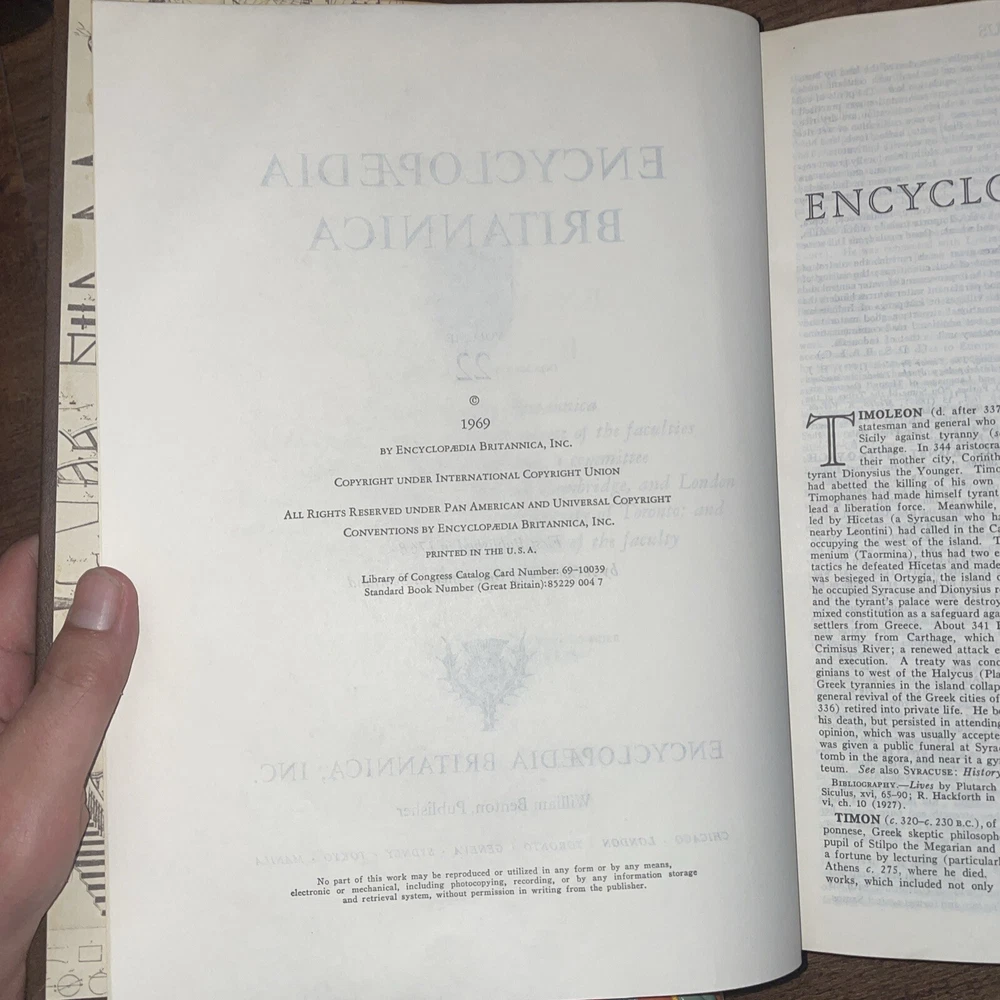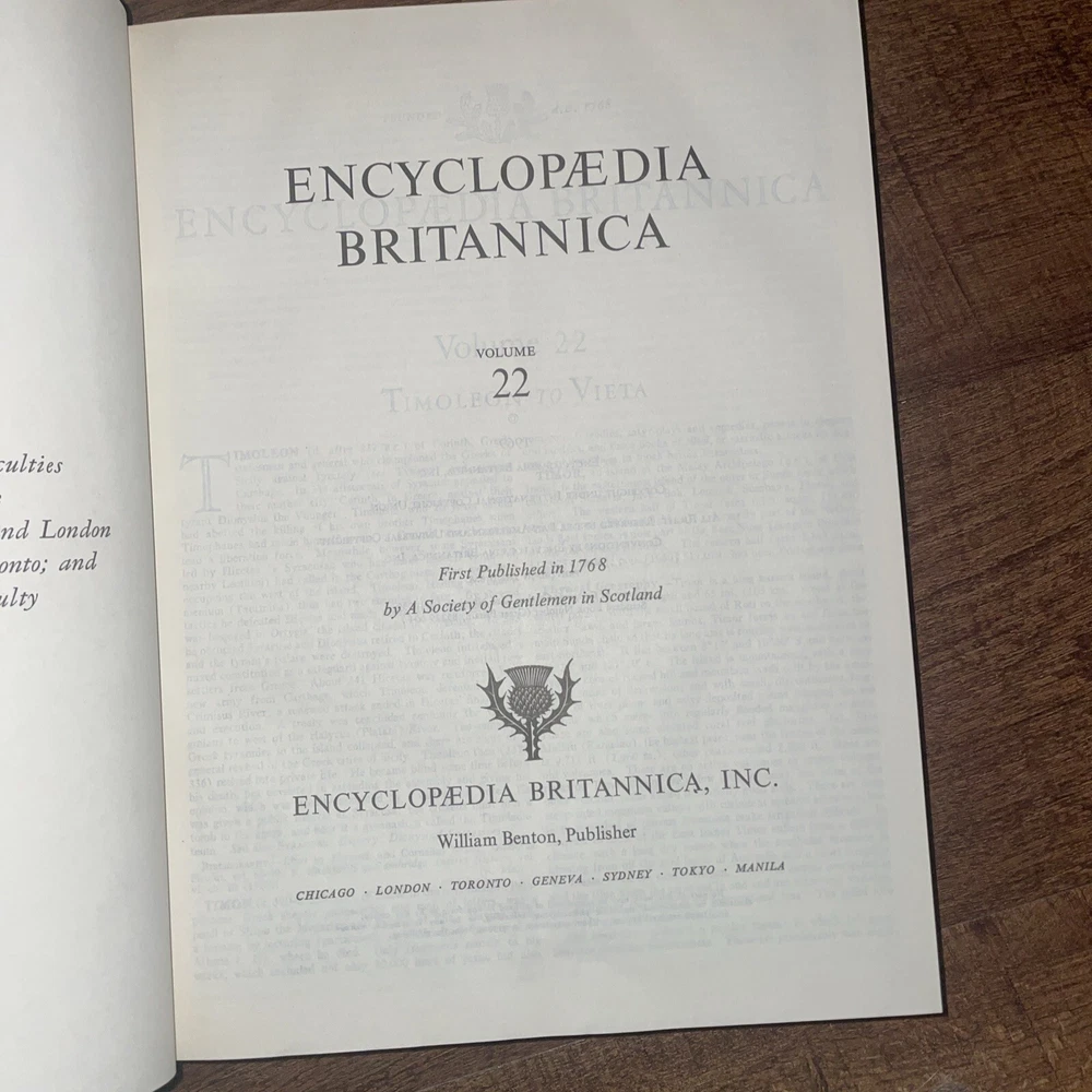The Encyclopedia Britannica 200th Anniversary Edition 23 Book Set from 1969 is a comprehensive collection of encyclopedias in English, published by Encyclopædia Britannica, Inc. The set includes an index for easy reference and covers a wide range of topics, making it a valuable resource for anyone interested in reference materials. Authored by various contributors, the set is bound in leather and is an original edition, making it a desirable item for collectors and those seeking a wealth of knowledge in one convenient package.