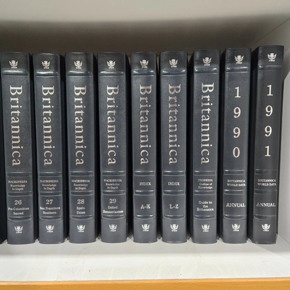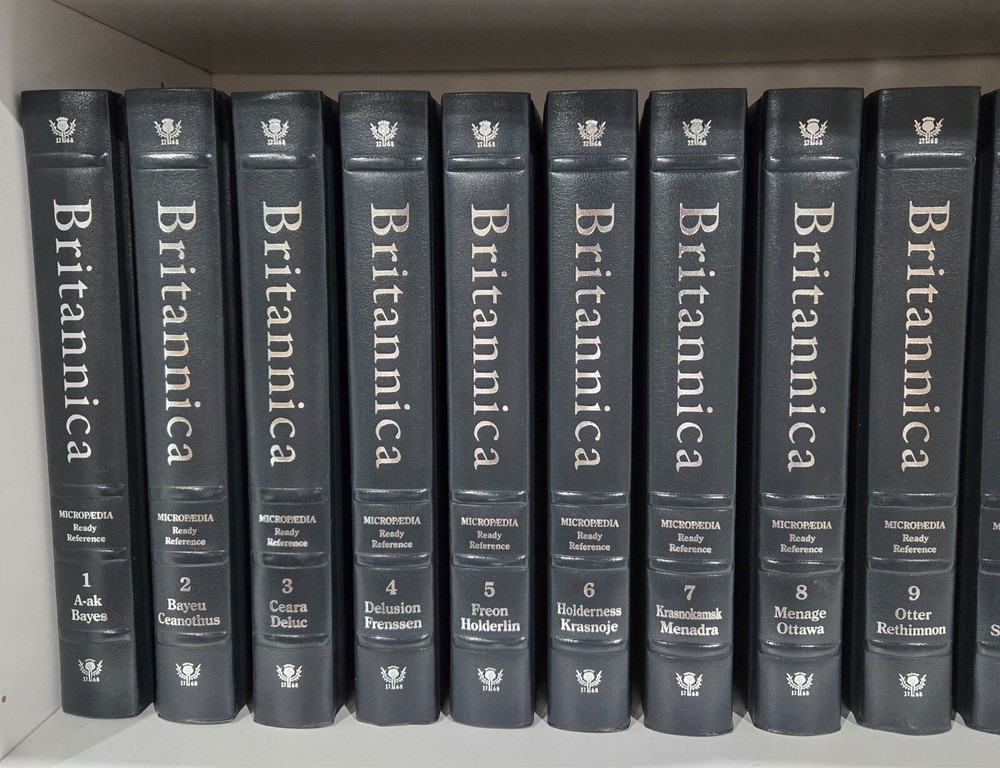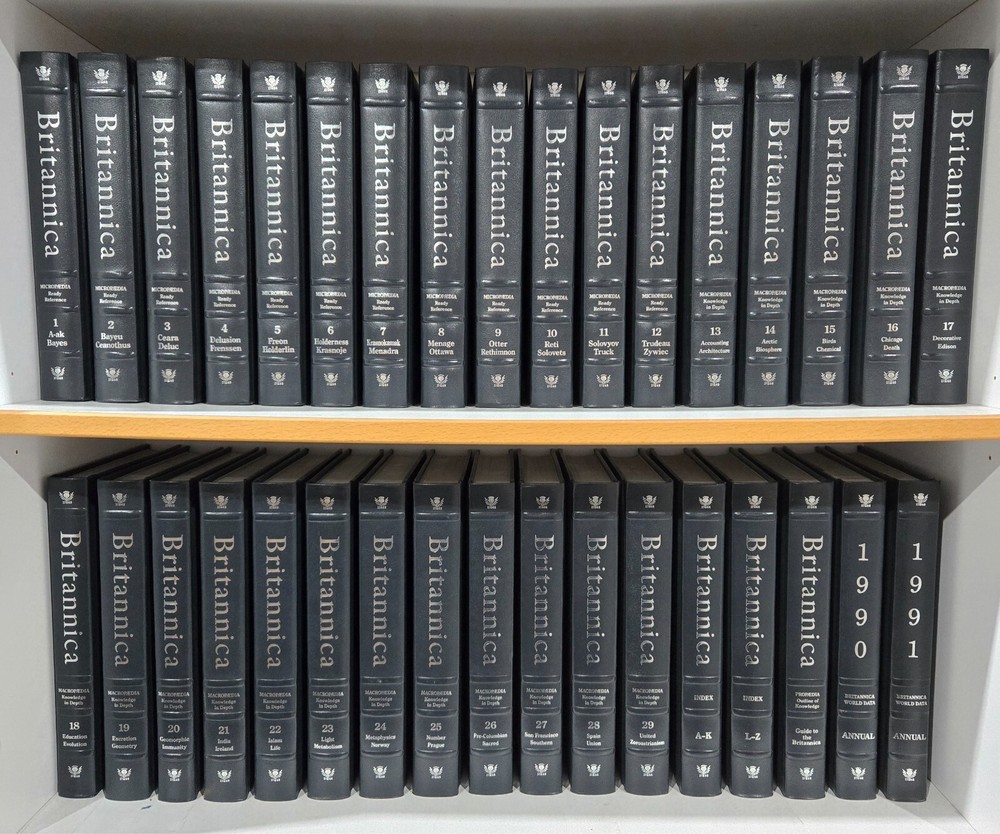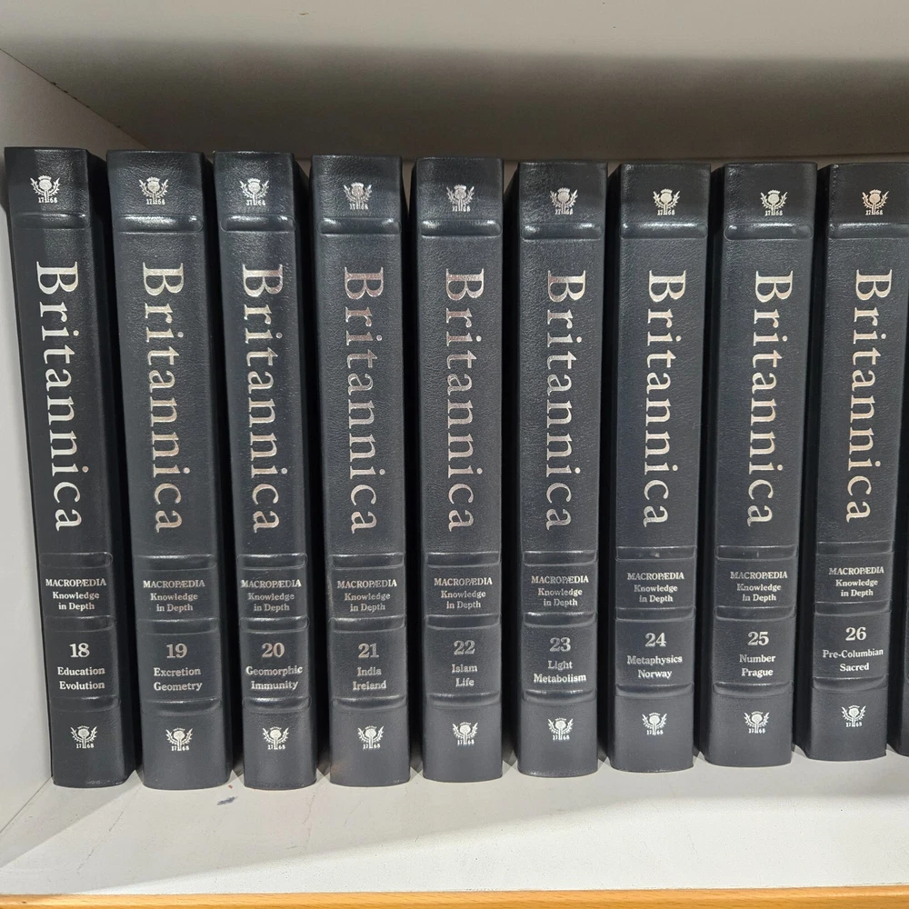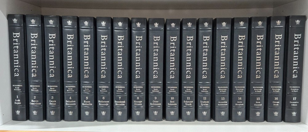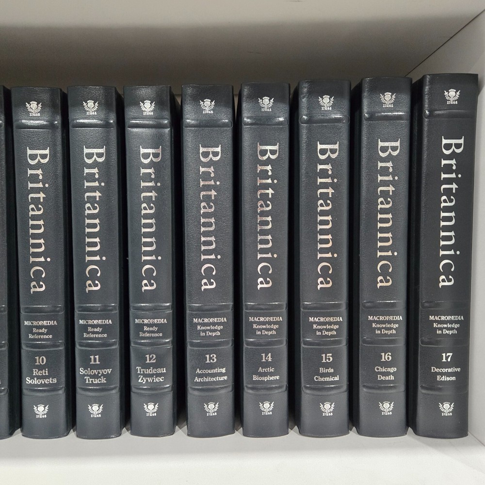 A very fine padded leather edition of Encyclopedia Britannica with gilt top page edges, 34 Vol. This 15th Edition set was published in 1990 in 32 volumes, including volumes 1-12 Micropaedia (ready reference), volumes 13-29 Macropaedia (knowledge in depth), 2 volumes index, and 1 volume Propaedia (outline of knowledge, guide to Britannica) Included are the succeeding 2 Annuals, 1990-1991 The condition of this set is in New-Mint condition. Please see pictures for reference. Feel free to ask any questions. PAL 2 - SHELF 3 - ITEM 5