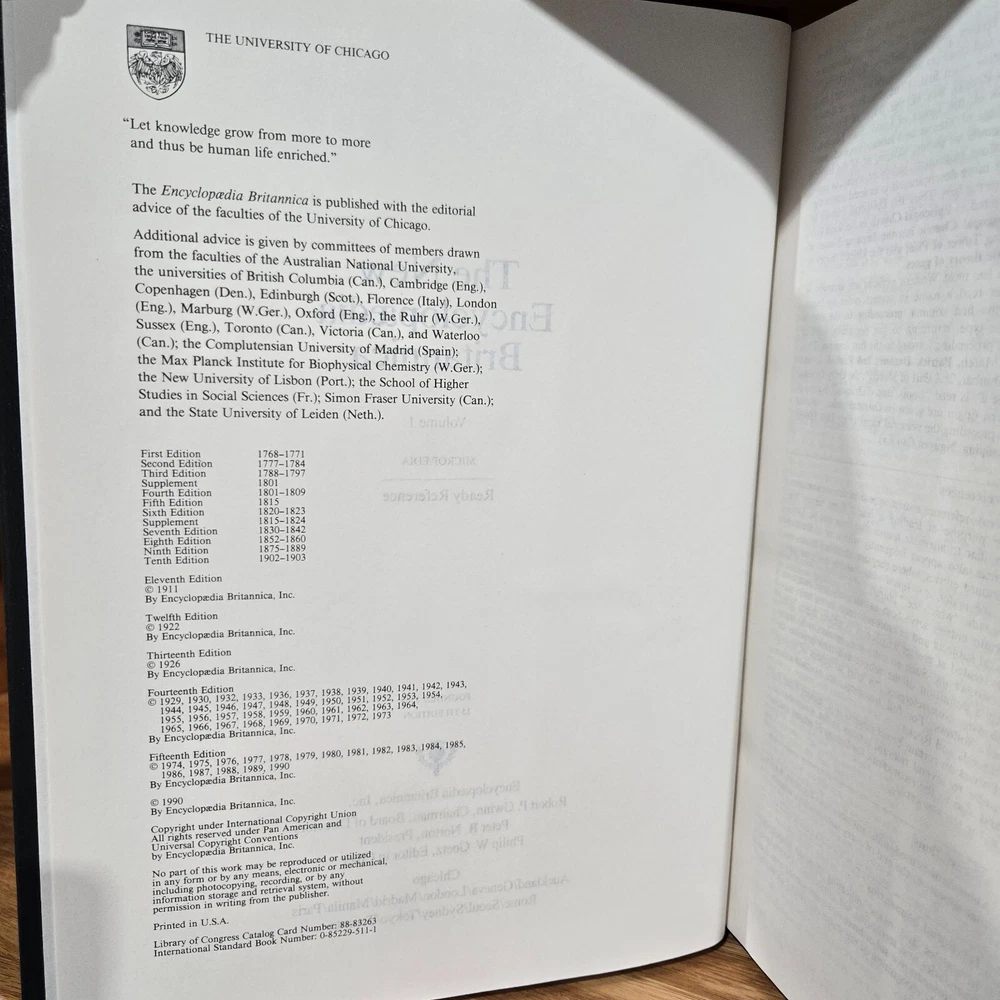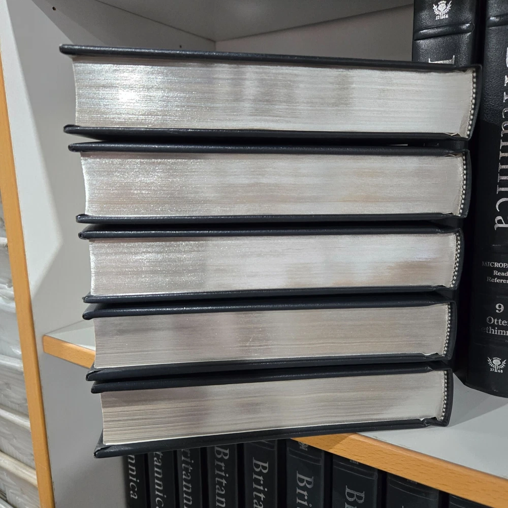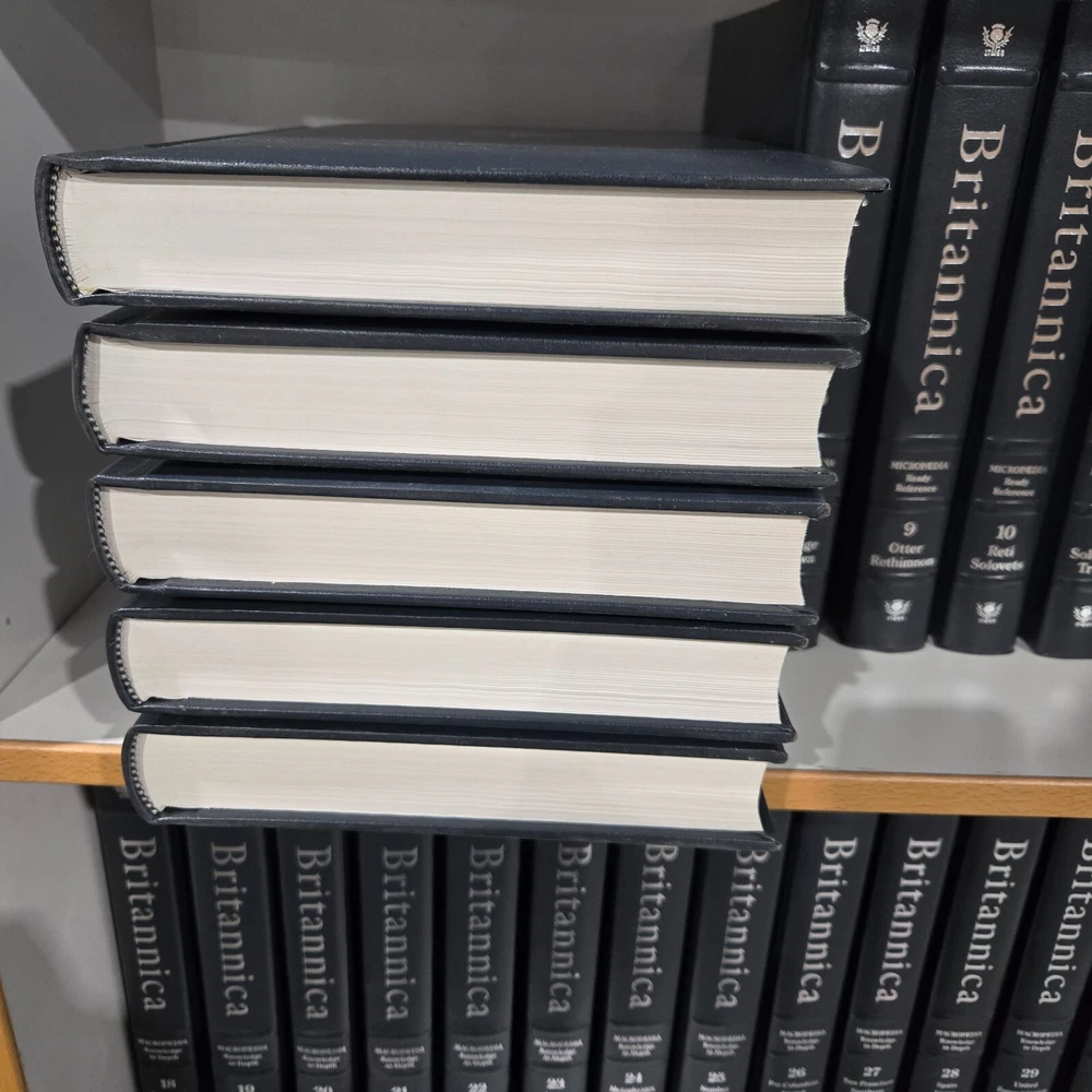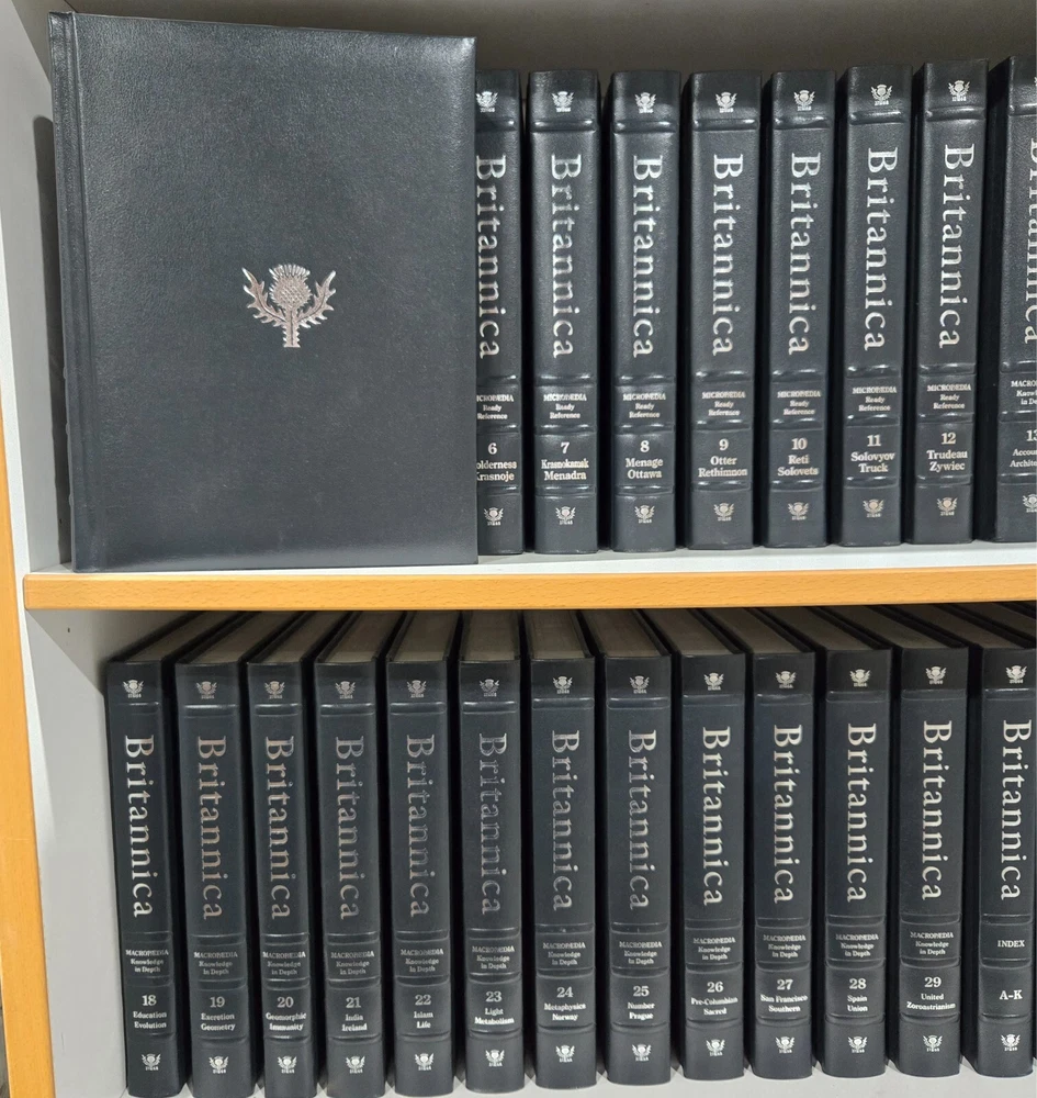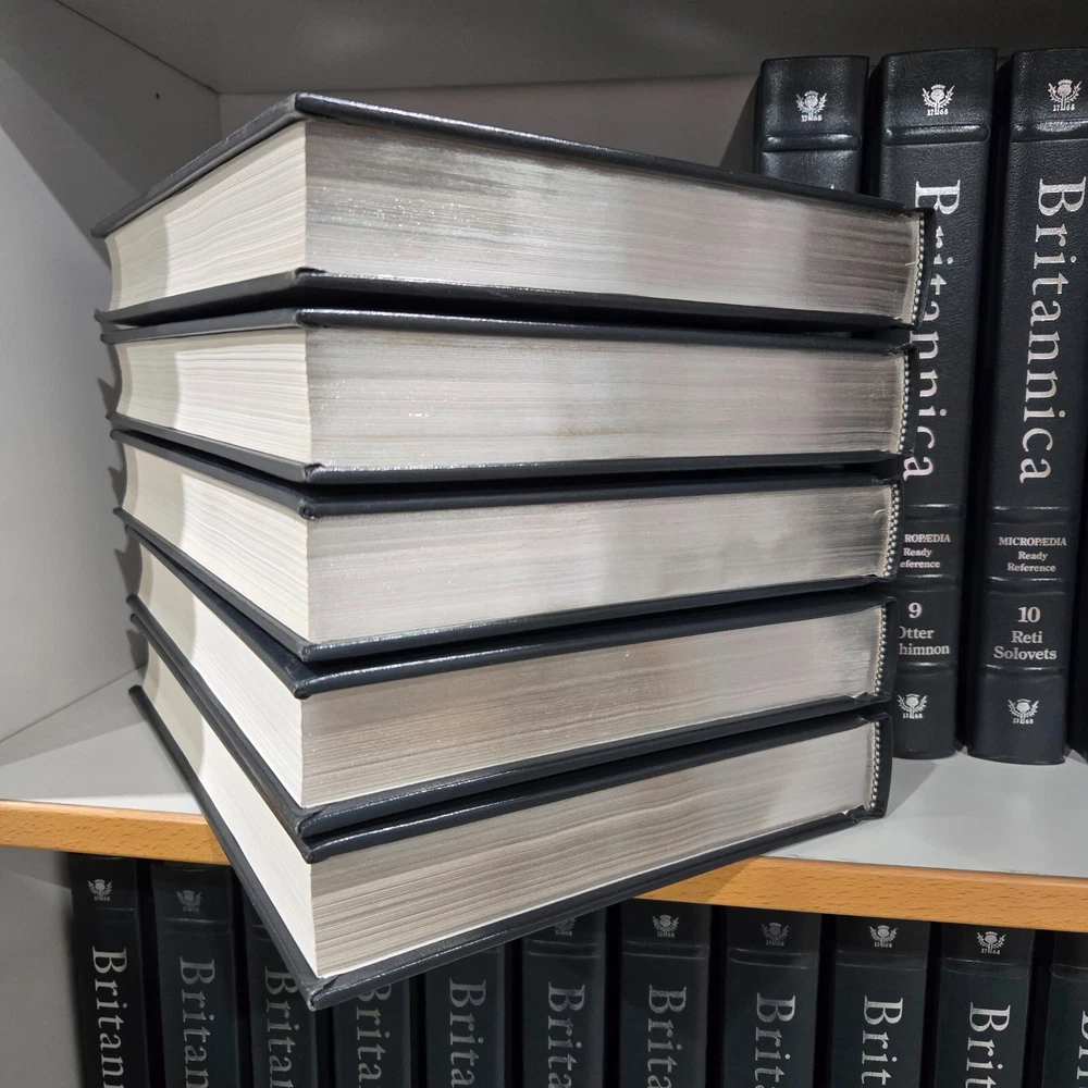 A very fine padded leather edition of Encyclopedia Britannica with gilt top page edges, 34 Vol. This 15th Edition set was published in 1990 in 32 volumes, including volumes 1-12 Micropaedia (ready reference), volumes 13-29 Macropaedia (knowledge in depth), 2 volumes index, and 1 volume Propaedia (outline of knowledge, guide to Britannica) Included are the succeeding 2 Annuals, 1990-1991 The condition of this set is in New-Mint condition. Please see pictures for reference. Feel free to ask any questions. PAL 2 - SHELF 3 - ITEM 5