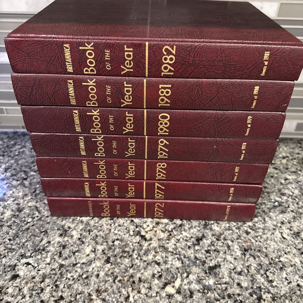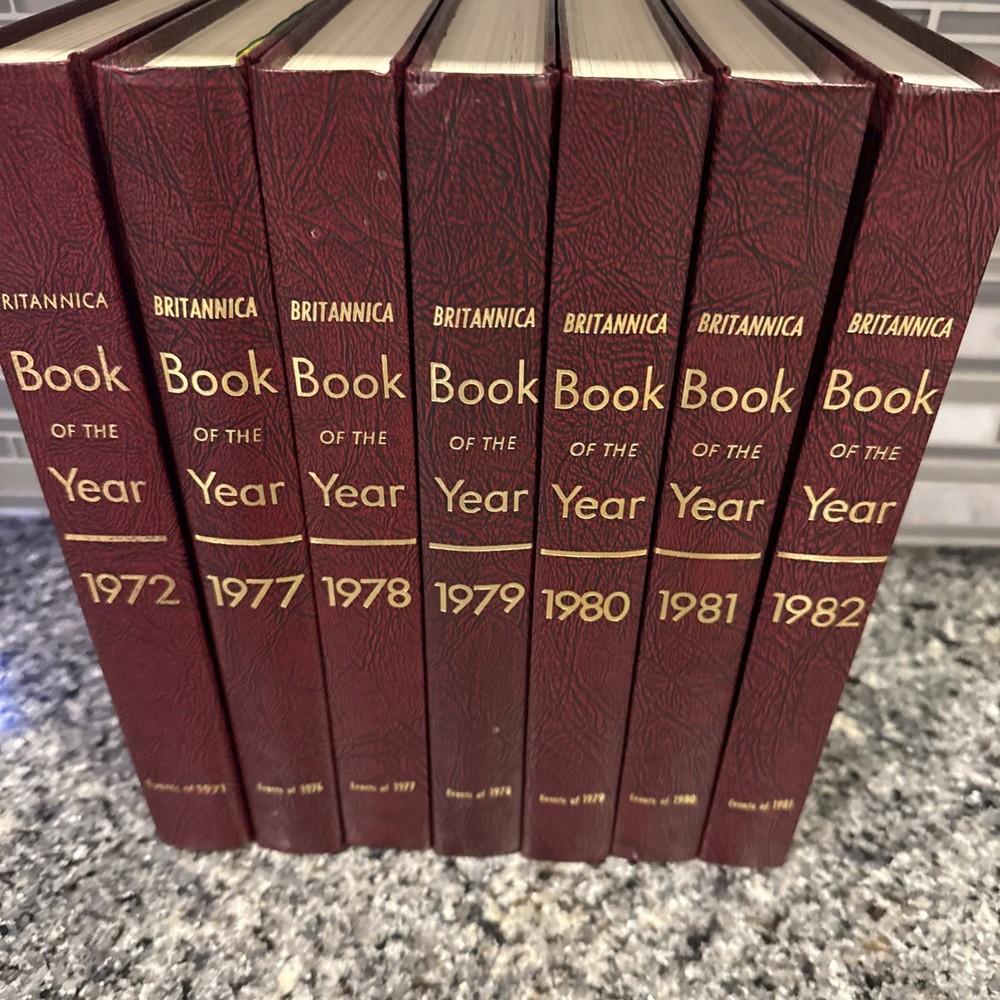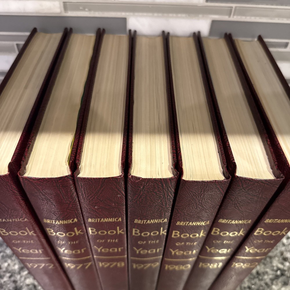 eBay Title: Britannica Book of the Year Lot (1972, 1977–1982) – 7 Vol Set – Excellent Condition eBay Description: This listing is for a 7-book Britannica “Book of the Year” lot, including the following volumes: 1972, 1977, 1978, 1979, 1980, 1981, and 1982. These beautifully bound yearbooks provide a detailed chronicle of the major global events, scientific achievements, politics, and culture of each year. A perfect addition to any Britannica collection, educational library, or vintage book lover’s shelf. Condition Notes: All volumes are in excellent condition with unread, unmarked pages. The maroon leatherette covers are vibrant, and the gold embossed titles and thistle emblems show no fading. Light shelf wear on a few edges only—overall, a very clean and well-preserved set. Please Note: This is an incomplete set—volumes for 1973 through 1976 are missing. However, missing volumes are readily available on eBay and other marketplaces, making this a great opportunity to complete your run affordably. Bonus Offer: Check out my store for more curated vintage book deals, and subscribe so you don’t miss new listings. I also offer bundle discounts for returning buyers—message me before checkout!