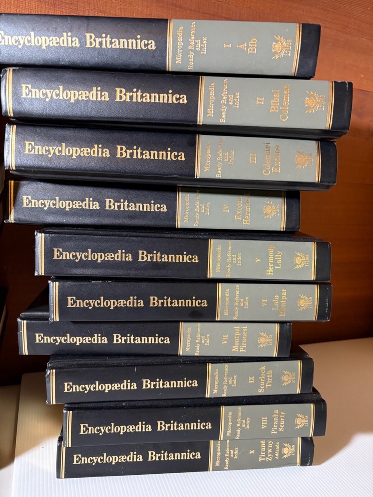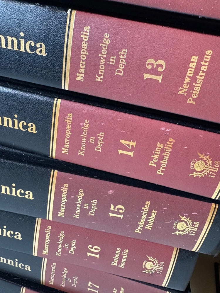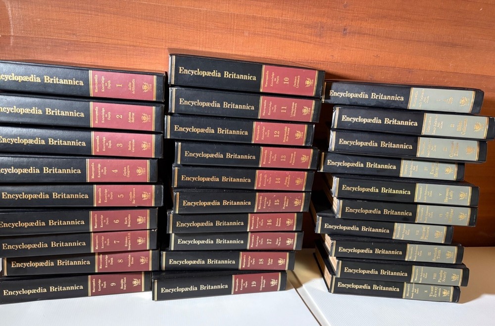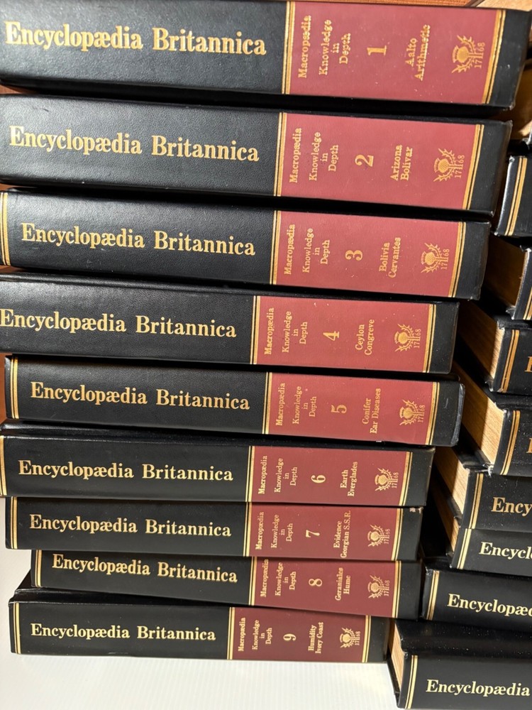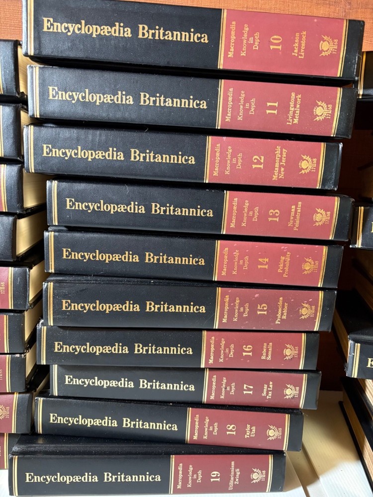 This vintage 15th Edition 1982 Encyclopedia Britannica set features timeless padded leather-bound volumes in striking red and black. Embark on a journey through knowledge and history with this beautifully crafted collection. A captivating addition to any library or study, showcasing cherished craftsmanship and intellectual heritage. This listing includes 29 volumes: volumes 1-19 + 10 Micropedia volumes. This set is in good condition with minor scuffs on some spine edges and corners. A handful of volumes have additional wear such as cover creases or marks on the leather. Pages are unmarked and in very nice condition. Inside cover pages show a little bit of yellowing. Flaws are documented in the pictures, so please review all photos before purchase. • Includes 29 volumes • Leather-bound covers with embossed gold lettering • Red and black spine design • Comprehensive reference material • Durable construction for long-lasting use Top to bottom = 10.5 inches. Encyclopedia set, Britannica books, vintage reference, leather-bound books, historical books, library collection, intellectual gift, complete set, academic books, antique Britannica, red black books, 15th edition books, collectible volumes This set is in good condition with minor scuffs on some spine edges and corners. A handful of volumes have additional wear such as cover creases or marks on the leather. Pages are unmarked and in very nice condition. Inside cover pages show a little bit of yellowing. Flaws are documented in the pictures, so please review all photos before purchase. Sold as pictured. Thanks for looking! ✨ FREE 30-day domestic returns ✨ We love offers ✨ Quick & careful shipping ✨ Smoke-free ✨ Follow us