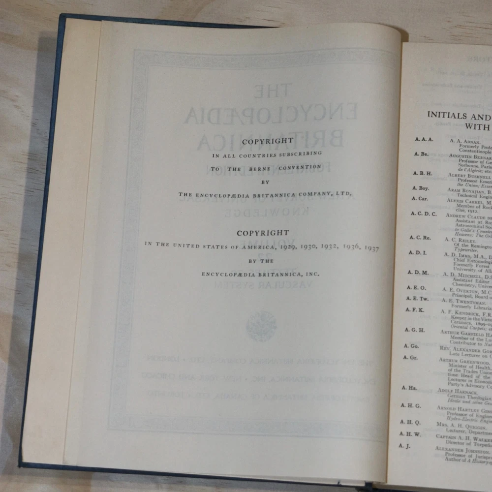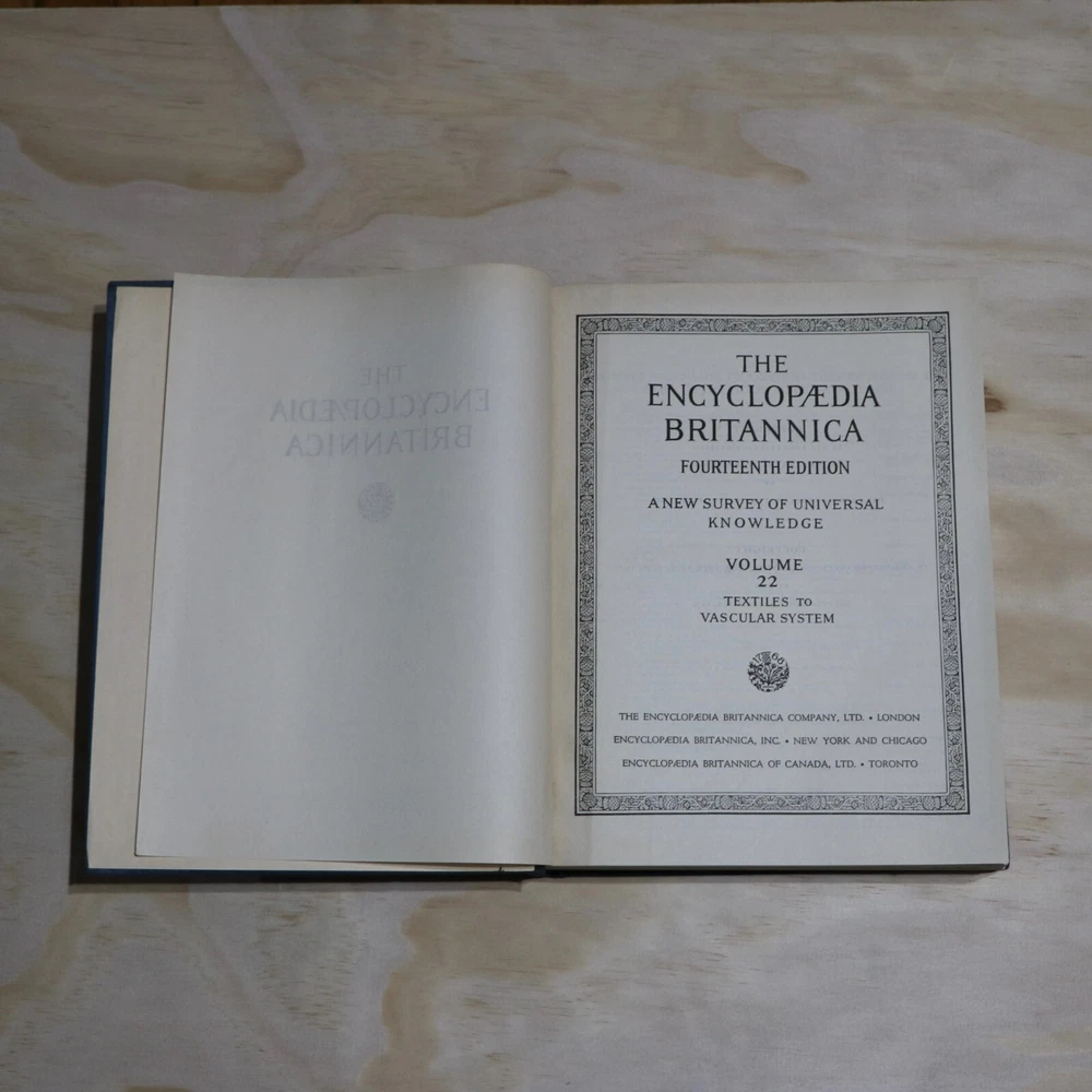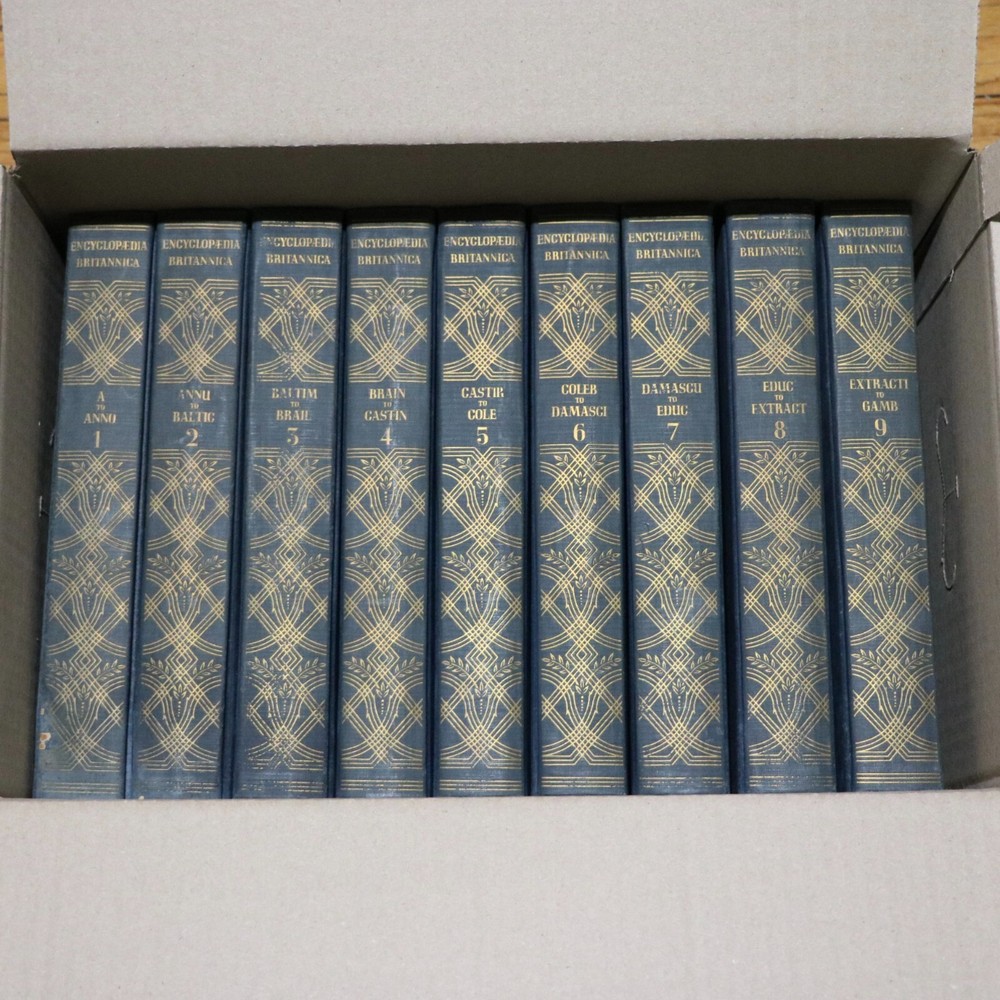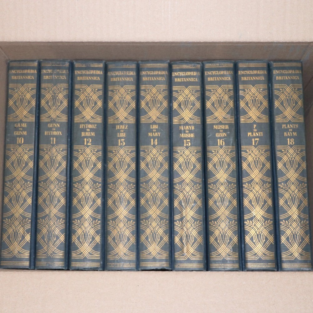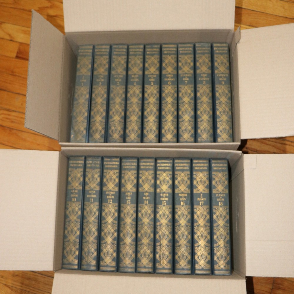 Encyclopedia Britannica Full Set 14th Edition 1929 Published 24 Volumes Complete. Some of the covers show signs of damage. A few examples shown in the photos. The pages in all of the books are intact, clean and readable. Inside the books are in very good condition. This set is complete and original. Total 24 books. About 1000 pages in each book. Seller is offering flat rate shipping. Books will bee shipped in multiple boxes. Please feel free to reach out to the seller with any questions that you may have. Thank You!