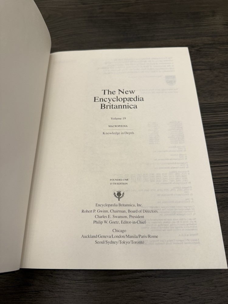 The "Encyclopedia Britannica Macropedia Volume 19 (15th Edition)" is a limited edition English reference book published by Chicago University Press in 1993. This volume is part of the Encyclopedia Britannica series and focuses on a wide range of topics in an encyclopedic format. The book features a leather binding and is padded for a luxurious feel, making it a collector's item for those interested in encyclopedias and academic reference materials.