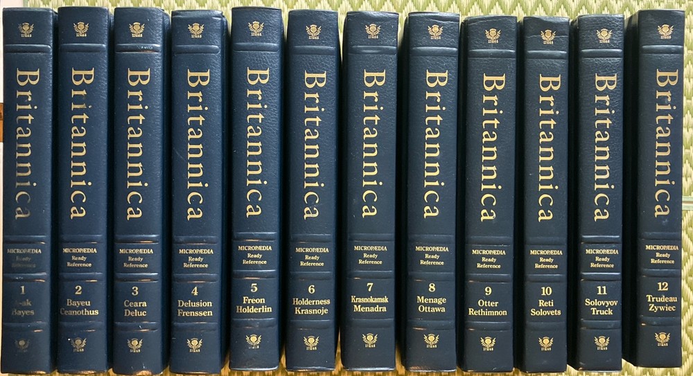 All 12 books of the Encyclopedia Britannica Micropedia. Gold topped pages and leather bound. 1988, 15th Edition