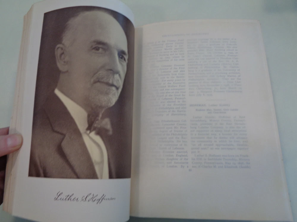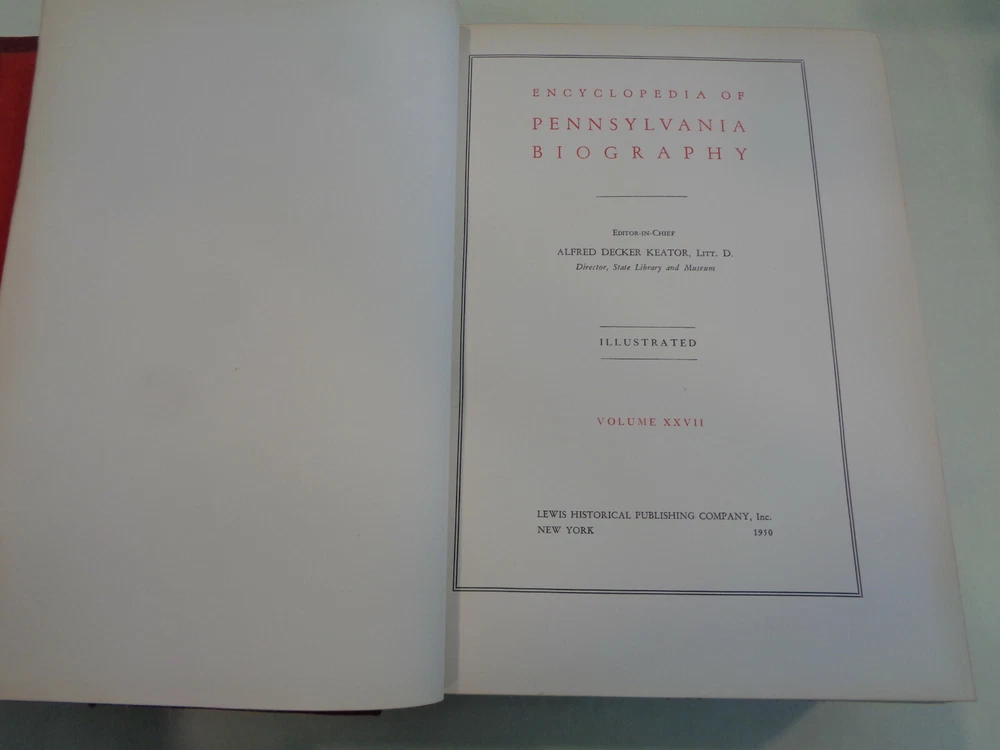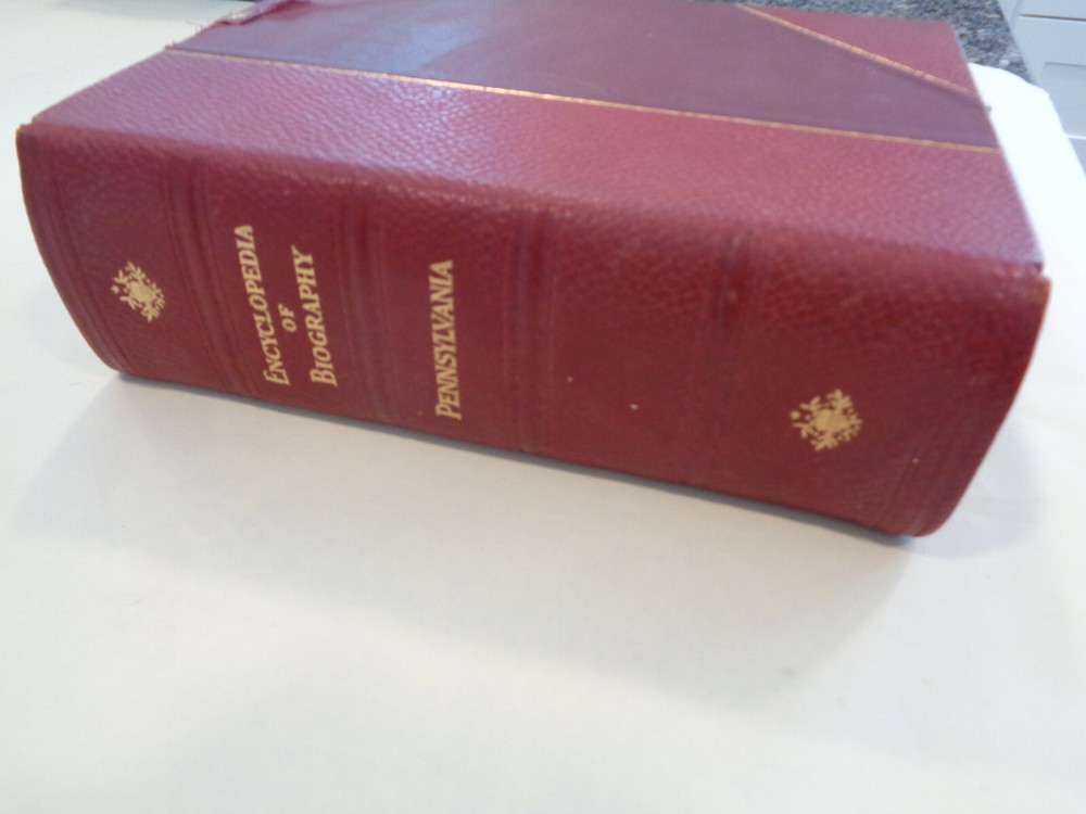 Encyclopedia of Pennsylvania Biography 1950 Vol XXVII Leather Bound HUGE!! Encyclopedia of Pennsylvania Biography 1950 Vol XXVII edited by Alfred Decker Keator The book features a unique look at famous and prominent Pennsylvanians, plenty of charm and insight, hard to find title, nice illustrations, will look great in your collection. Copyright: 1950 Pages: 471 pages Publisher: Lewis Historical Publishing Company The book measures approx. 11 by 8 inches. The hardcover is nice with some gentle wear and rubbing, some scuffing and light wear. The spine end is good with light wear and rubbing. The boards and corners are in good shape. The hinges and binding are tight and strong. The pages are very nice with some minor wear, slight old book or basement smell from long storage, book is nice. Shipping weight is 14 pounds Inventory: 0422YA165