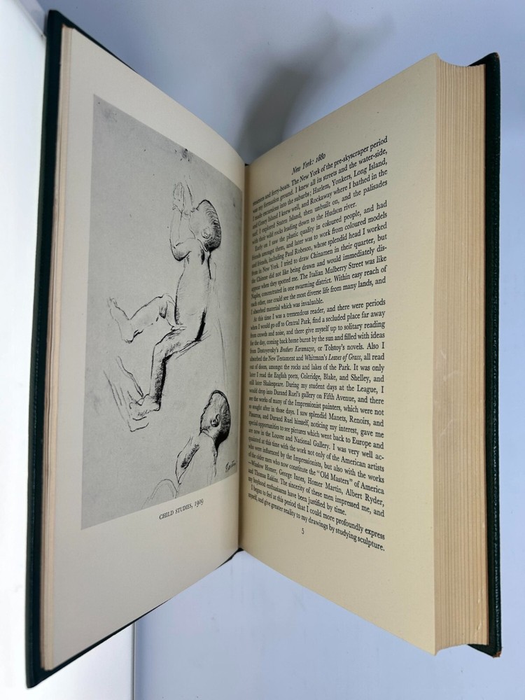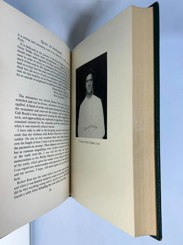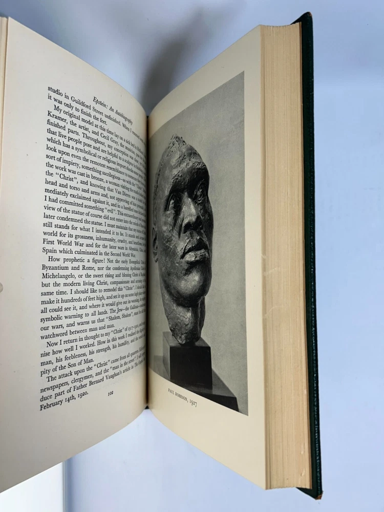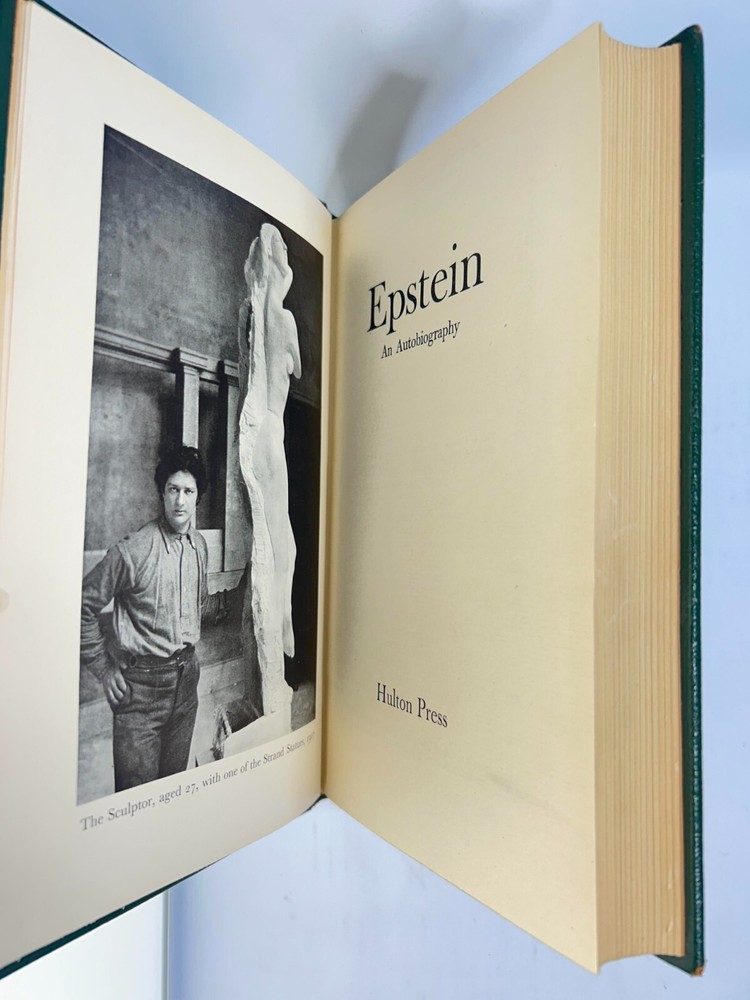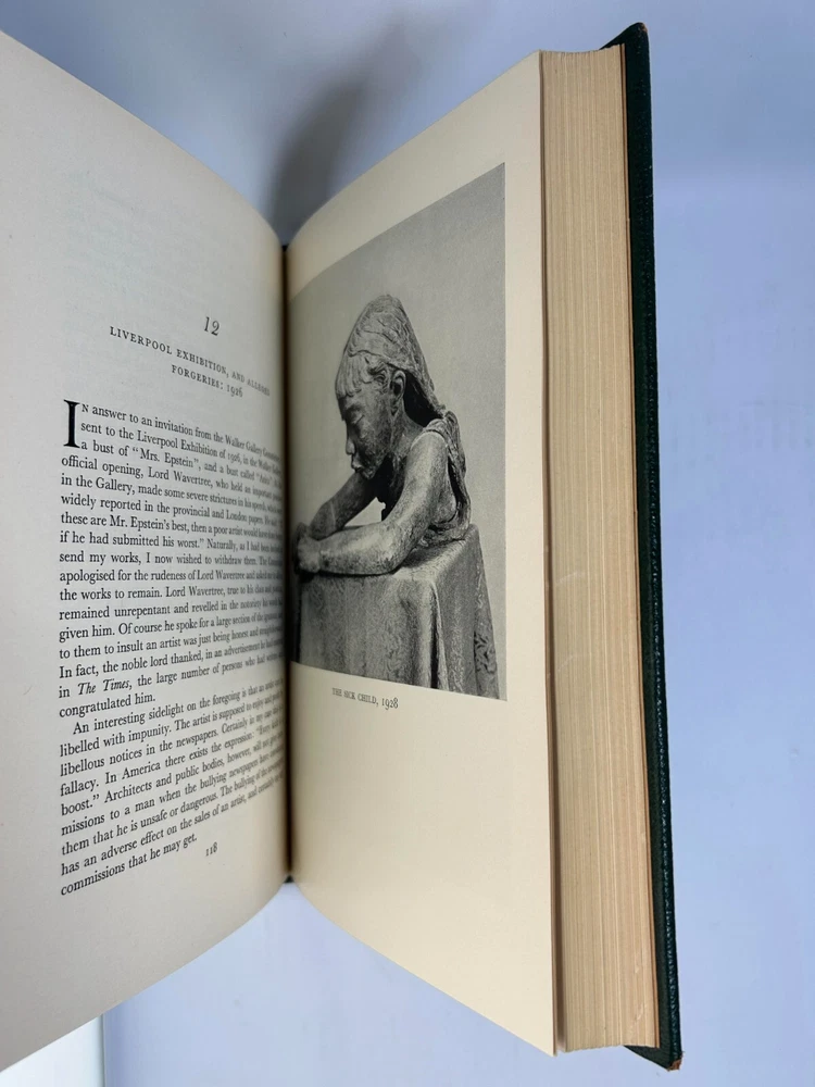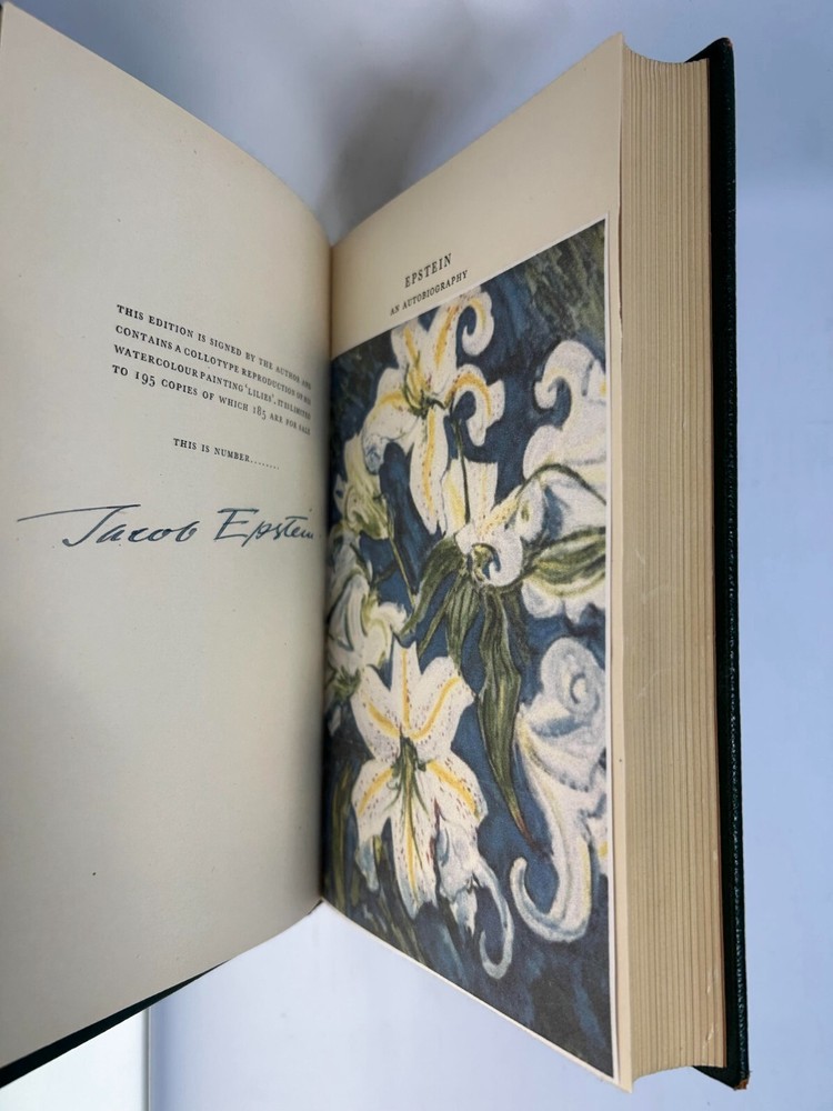 Epstein, Jacob. Epstein: An Autobiography. London: Hutton Press, 1955, revised and extended edition, signed by Epstein on fly leaf, limitation __ of 195 copies. 4to: [x] 294 pp. Full green leather, gilt lettered spine, a few soft impressions and rubbed extremities, contains a tipped-in photocopy of his watercolor painting 'Lilies' [Absent original collotype reproduction], text interspersed with 95 black and white illustrations. Very good. No more appropriate observation could be made about this book than the one implied in Epstein’s own statement: “Surely the best communication of the sculptor or the painter is through his work and in no other manner.”
