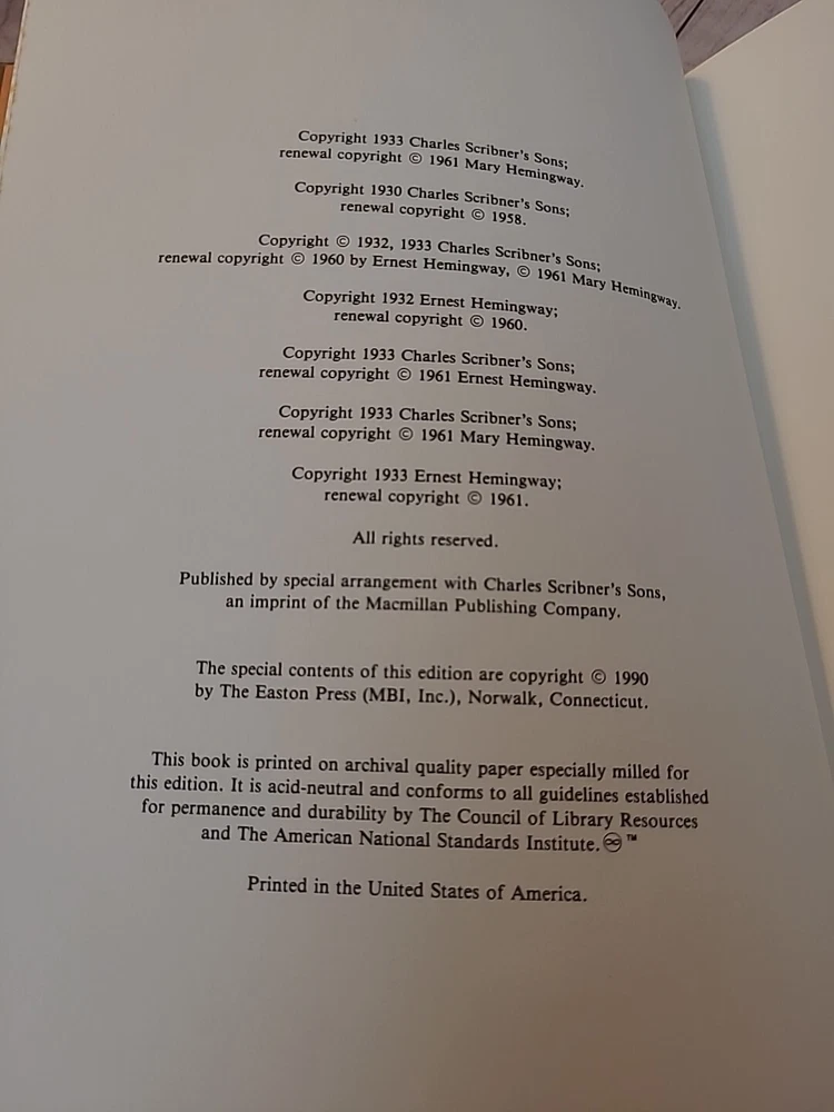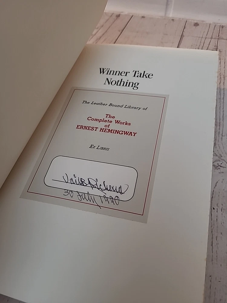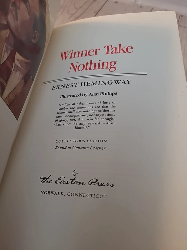 This Easton Press Collector's Edition 1990 of "WINNER TAKE NOTHING" by Ernest Hemingway is a must-have for any literature enthusiast. The book, published in Connecticut, features a leather binding and is a first edition. It is illustrated by Alan Phillips and includes special attributes such as being a collector's edition and personalized. The book is written in English and covers the topic of biography and autobiography. It is a perfect addition to any collection of antiquarian and collectible books. The book is not signed, but it is a great piece of literature that will be a valuable addition to any library.