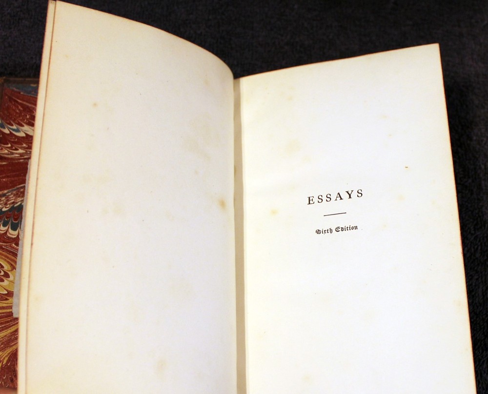 Essays - Written in the Intervals of Business Sir Arthur Helps Published 1853 - John W. Parker, London Sixth Edition Separated Leather Covers 4.25" X 6.75" Some minor foxing. Fair condition. Difficult to find in any condition.