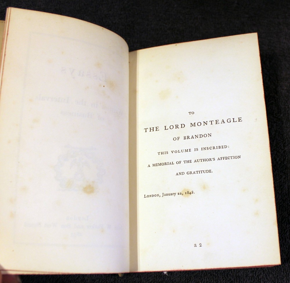 Essays - Written in the Intervals of Business Sir Arthur Helps Published 1853 - John W. Parker, London Sixth Edition Separated Leather Covers 4.25" X 6.75" Some minor foxing. Fair condition. Difficult...