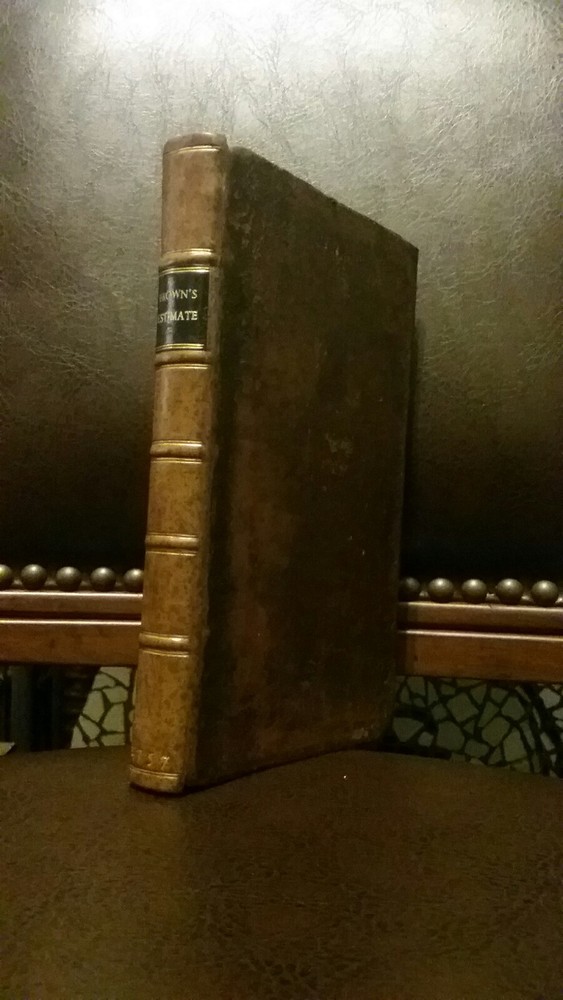 Brown, John. Estimate of the Manners and Principles of the Times. London: Printed for L. Davis, and C. Reymers, against Grays-Inn-Gate, Holborn; Printers to the Royal Society, MDCCLVII [ 1757 ] . Sixth Edition. Octavo . Text in English. Bound in full leather, this book has been sympathetically rebacked with brighter leather on the spine, new endbands, and the earlier contemporary leather boards have been retained; the boards are scuffed on the surface and worn with age, and the corners have been repaired in a dark brown leather to match the original. The edges are bumped and a little nicked. The binding is firm. The endpapers are browned and foxed. The front free endpaper is a little creased and nicked to the edges. The title page has the author's name written by someone in ink. The contents are browned and foxed throughout, in varying degrees, heavier to some sections. In reasonable and readable condition throughout - a beautiful copy. Estimate of the Manners and Principles of the Times was Brown's most successful work. A bitter satire on the "vain, luxurious and selfish effeminacy of England's higher ranks, in the wake of the loss of Minorca to the French at the opening of the Seven Years' War", this treatise "pleased a public depressed by the ill-success in the conduct of the war, and ready to welcome an attack on luxury and kindred evils.” Brown wrote about what he saw as the decline in manners and principles of British citizenry, particularly the ruling class, all of which was leading, he maintained, to the eventual self-destruction of the British Empire. Although praised by some and derided by others, Brown’s Estimate was quite popular in its time, running through six editions in its first year of publication (this copy being of the sixth). If you are someone who is interested in English history this would be an excellent addition to your collection.