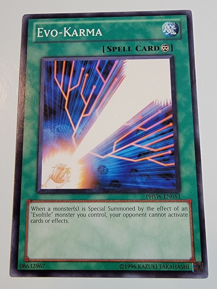 Evo-Karma PHSW-EN053 Common Unlimited Yugioh. Overall NM-M condition. (Please reference pictures for c osmetic condition). Take advantage of our multi item discount!!! When you buy 2 items you will have the opportunity to select a 3rd item of equal our lesser value for free from our whole inventory. (Must use Ebay's shopping cart feature in order to take advantage of this discount). If you have any inquiries please feel free to message us and we will respond as soon possible, usually within 24 hours. SHIPPING We almost always use USPS as our primary SHIPPING service. We ship within 24 hours of receipt of payment and will always provide tracking, unless otherwise stated in the listing. (We reserve the right to use a different carrier or service). FEEDBACK Your FEEDBACK is important to us as a growing small business. If for any reason you are unhappy with your transaction, please message us and we will do everything in our power to make it right. Returns Returns are accepted within 30 days of confirmation of delivery. If there is anything you are unhappy about with your purchase please message us and we will respond within 24 hours to your concerns. Thank you for supporting our small business. We appreciate your valued business with us and look forward to serving you in the future. Dan & Tonya Dio's Eclectic Treasures