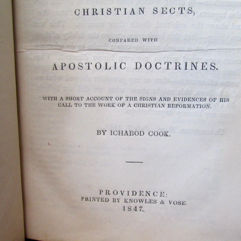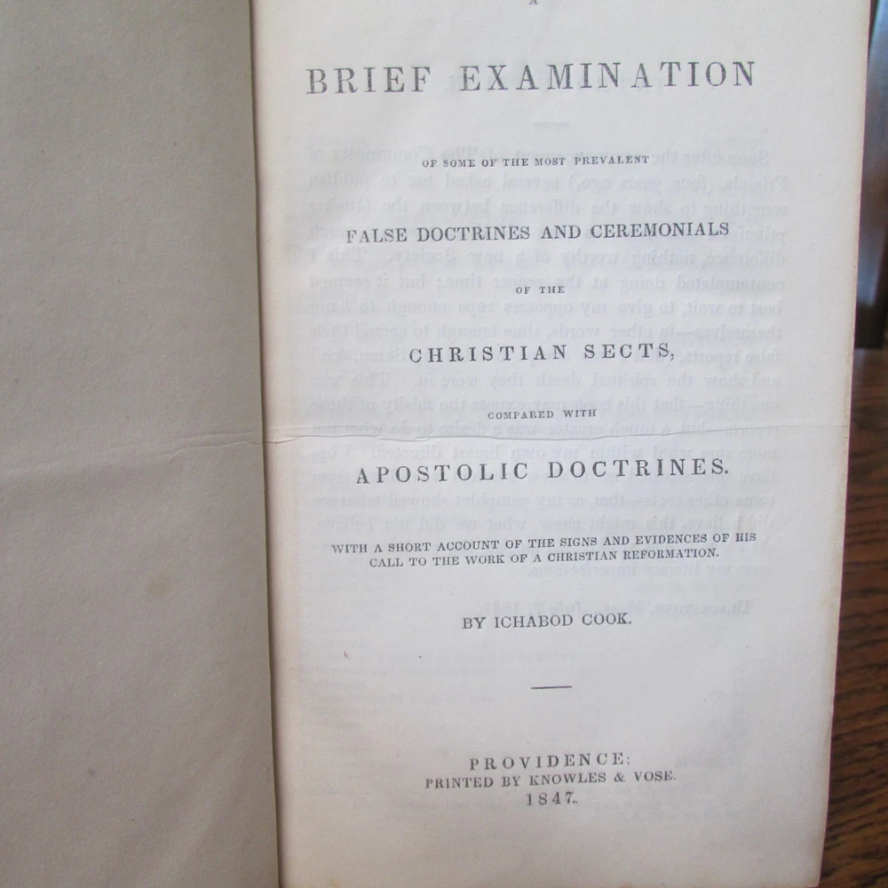 Brief Examination of False Doctrines Ceremonials of the Christian Sects; Containing the Apostolic Doctrines By: Ichabod Cook Published by Providence 1847 Quarter leather bound Marbled cover else Good: Rubbing to extremities. Fold line at spine leather separating, hinge paper inside is holding the cover on. There is a tear to the leather mid spine. No name inside. Unmarked text. General age toning, handling wear.