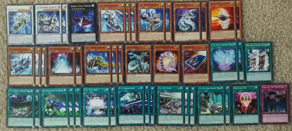 You will receive cards in following list with sleeves The pictures were taken directly from the item. The Super Rare and Parallel Rare are counted as Ultra Rare in the title for convenience. Monsters: 20 3 x F.A. Sonic Meister 2 x Solar Wind Jammer 2 x F.A. Whip Crosser 3 x F.A. Hang on Mach 2 x F.A. Auto Navigator 3 x F.A. Turbo Charger 1 x Cardcar D 2 x Cyber Dragon 1 x Cyber Valley 1 x Cyber Dragon Vier Spell: 19 3 x Air Cracking Storm 2 x F.A. Circuit Grand Prix 3 x F.A. Pit Stop 2 x F.A. City Grand Prix 2 x F.A. Off-Road Grand Prix 3 x F.A. Downforce 2 x F.A. Test Run 1 x One for One 1 x Machine Duplication Trap: 1 1 x Call of The Haunted Extra Deck: 4 Synchro 2 x F.A. Motorhome Transport 1 x F.A. Dawn Dragster (Rare) XYZ 1 x Number 42: Galaxy Tomahawk Card condition: Mint/Near Mint. Card in hand and ready to ship. Ship only within US. Free shipping by USPS First Class Mail. Payment Method: Paypal only.