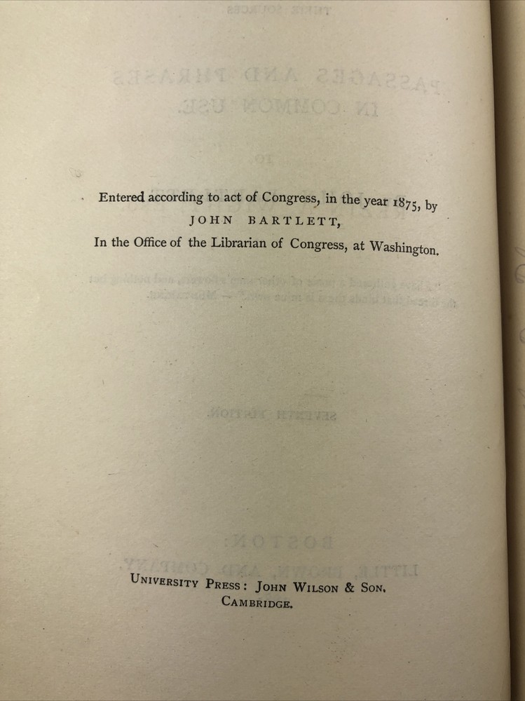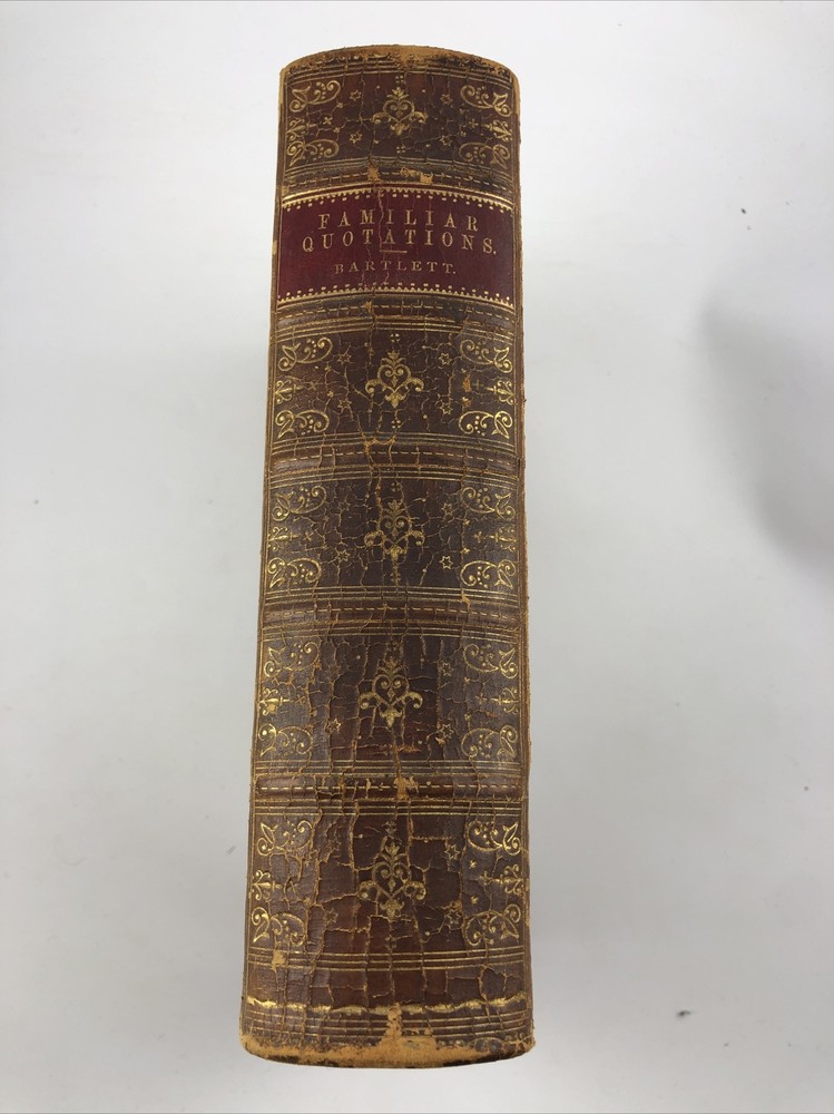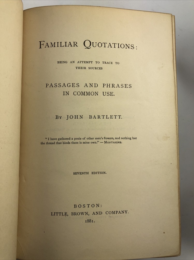 Familiar Quotations: Being an attempt to trace to their sources passages and phrases in common use. By John Bartlett. Published by Little, Brown, and Company, Boston MA, 1881. Hardcover. Condition: Good+. Seventh edition. Very nice copy in three quarter leather with marbled boards and endpapers. Some wear to leather at edges, but overall very good condition. 5.5"x7.25". 864pp. Binding tight and hinges intact. One very small moist(?) spot in center of book (see pictures), but otherwise unmarked. Please see pictures and ask any questions before bidding! Dimensions given, if any, are approximate. Condition as shown. Pictures show actual item, never a stock image. Shipping via USPS unless otherwise noted.