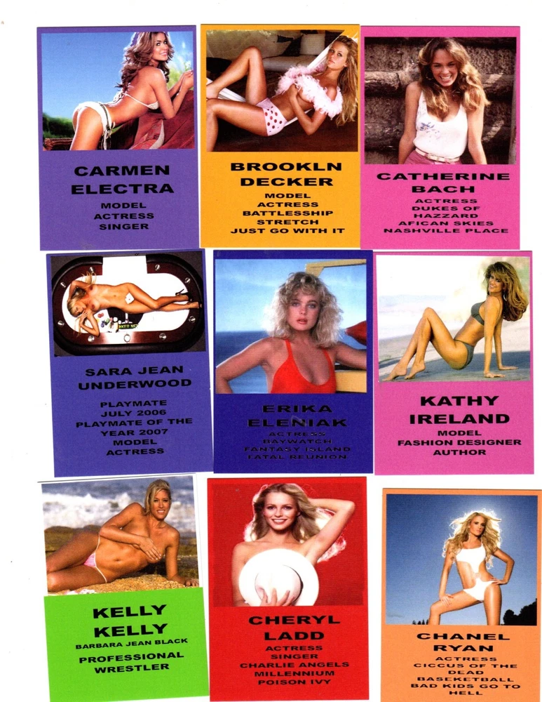 FEMALE SEX SYMBOLS CUSTOM TRADING CARD 18 CARDS SEIRES FOUR SET THIS IS A NOVELTY CARD THAT IS CUSTOM MADE. THESE CARDS ARE ON NEW THICKER CARD STOCK. FIRST TO PHOTO ARE THE FRONT THE LAST TWO PHOTO ARE THE BACK.