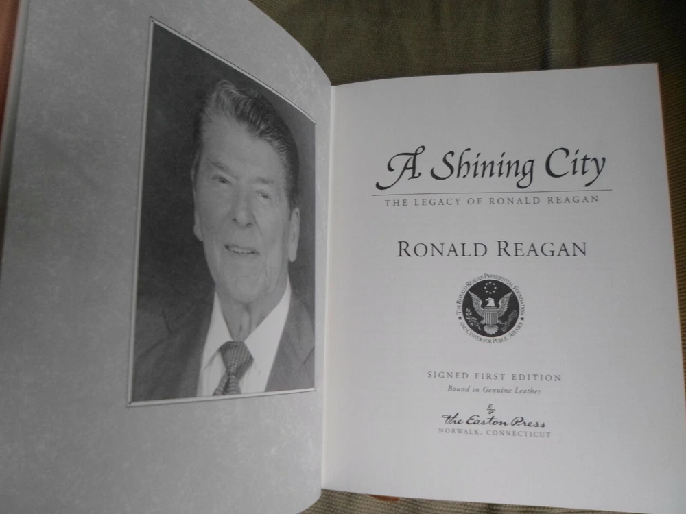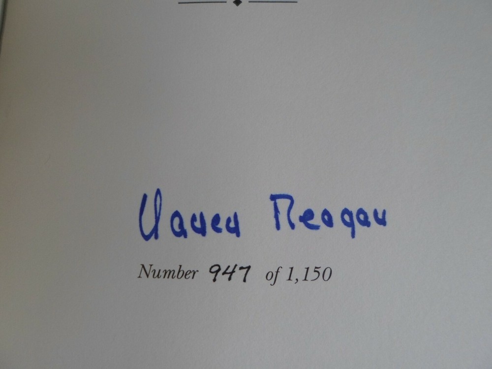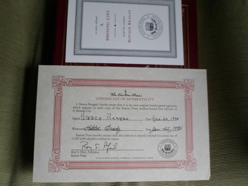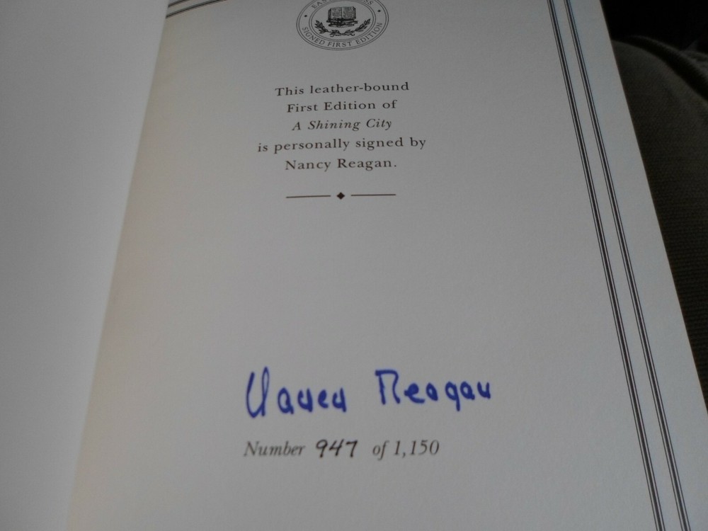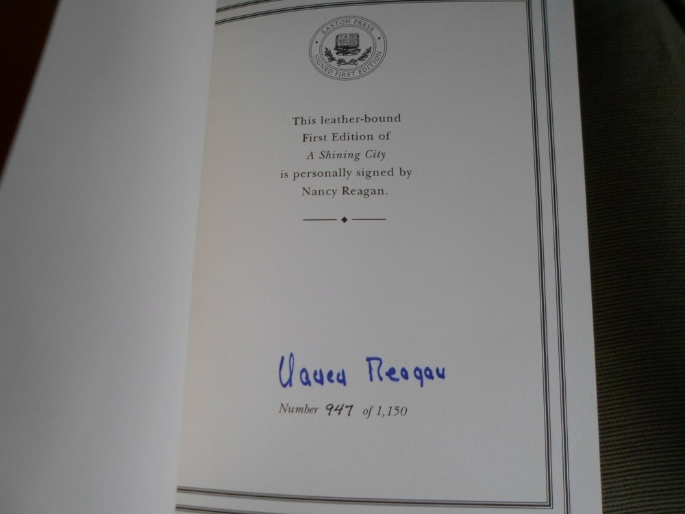This is a leather bound signed first edition of former First Lady Nancy Reagan's best seller - "A Shining City - The Legacy of Ronald Reagan" . This collection of heartfelt tributes and post-Presidential remarks captures the legacy of the fortieth President and invokes the spirit of those significant years by revisiting the challenges, victories, struggles and defeats that he faced in the course of two administrations. His inspirational remarks, from his Farewell Address to the Nation in January 1989 to his moving Letter to the American People in November 1994, in which he acknowledged that he had been diagnosed with Alzheimer's Disease, reiterate the principles he stood for as President. From his Address to the Oxford Union Society, in which he reprimands England and "a Europe moving toward union" for "refrain[ing] from action" in Bosnia, to his Remarks to the Captive Nations Week Conference, in which he underscores the importance of keeping our commitments to Taiwan, his post-Presidential speeches examine and pronounce upon the political developments in the United States and abroad since he left office. The never-before-published tributes, written by more than forty world leaders and prominent public figures -- including the four other living U.S. Presidents, Mikhail Gorbachev, Margaret Thatcher, George Will, Colin Powell and Billy Graham -- describe, often in moving detail, their greatest memories of the fortieth President. Their anecdotes and reflections conjure up his greatest attributes, from his "soaring sense of possibilities" (George Will), to his "courage to act on principle and take the heat" (Robert Dole), to his "indomitable faith in the promise of freedom" (Jack Kemp) and "in the greatness of our country" (Henry Kissinger). In so doing, they truly capture his legacy. The book is unread and in great condition, with just some minor gold gild imperfections on the side of the pages (see pictures). Signed by the former First Lady on the limitation page, this is copy number 947 of only 1150 ever printed. It also has the signed and dated certificate of authenticity and the publisher's note card. Easton Press books are the golden standard in the publishing industry, highly collectible and lasting generations. Easton Press Full Genuine Leather Dubbed Spine Accented Wit 22 kt. Real Gold Satin Ribbon Page Marker Distinctive Cover Design Gilded Page Edges To Protect Against Humidity High Quality Acid - Free paper Smyth-Sewn Pages Silk-Moire Endleaves I combine multiple items for savings on shipping charges. I ship worldwide. Please ask about international shipping charges and/or different shipping options.Thank you!