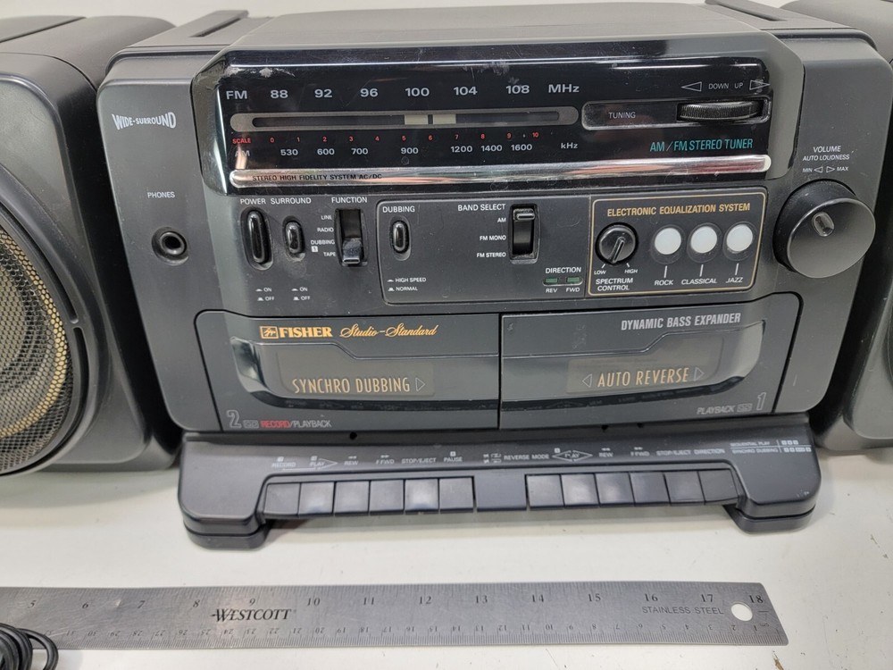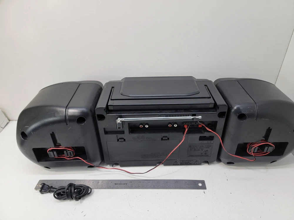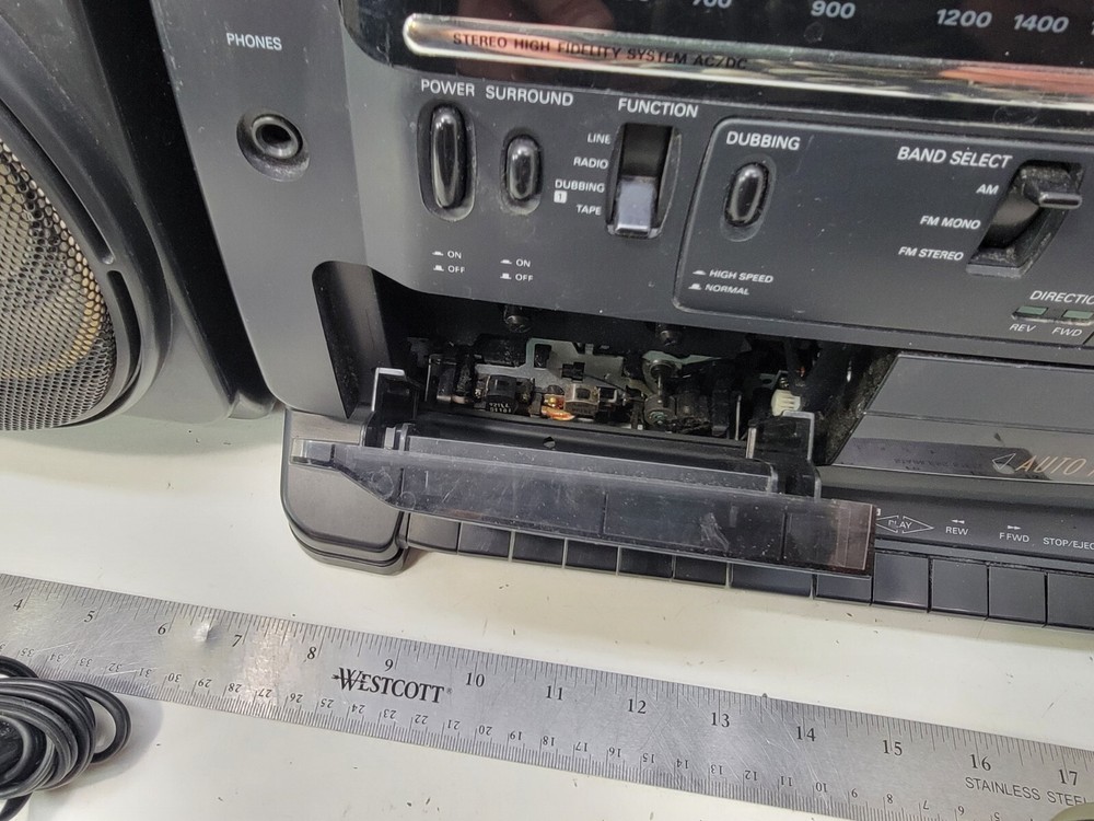 THIS BOOMBOX IS IN GOOD CONDITION LIGHT WEAR AS SHOWN. ONE SPEAKER HAS SOME PLASTIC DAMAGE PLEASE SEE PHOTOS I WILL COMBINE SHIPPING ON MULTIPLE ITEMS I AM ALWAYS AVAILABLE IF YOU HAVE ANY QUESTIONS THANKS FOR LOOKING!