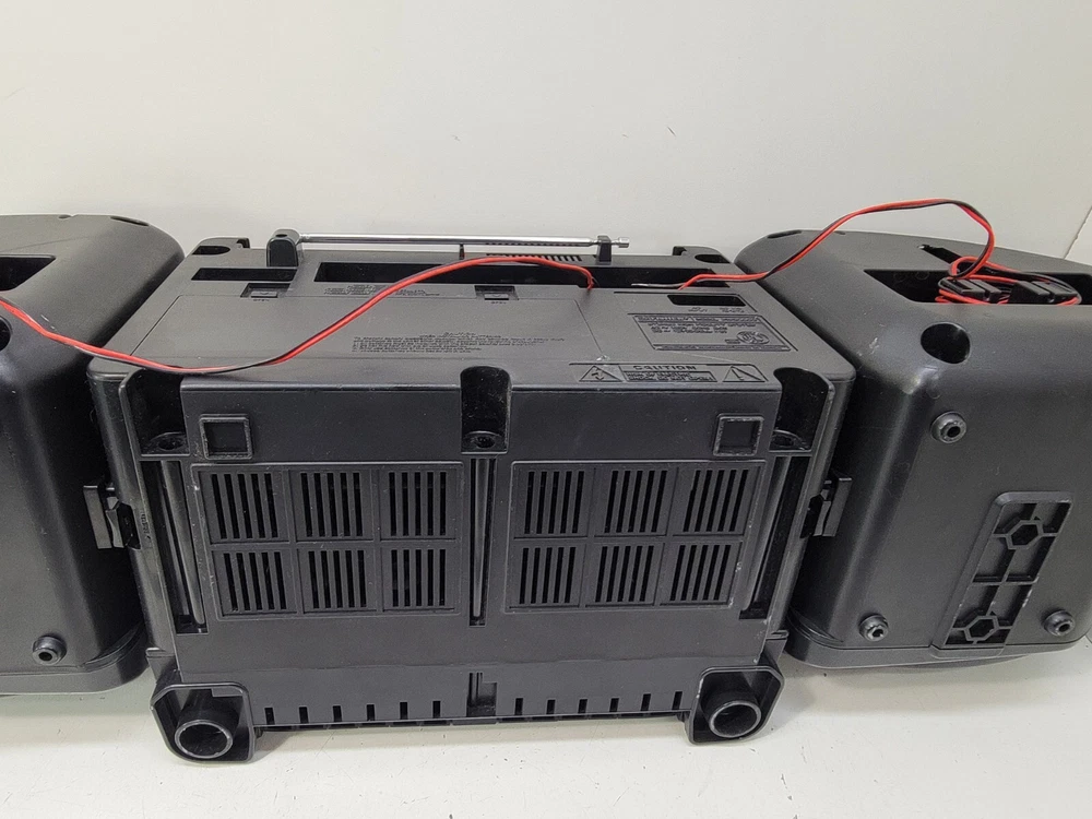 THIS BOOMBOX IS IN GOOD CONDITION LIGHT WEAR AS SHOWN. ONE SPEAKER HAS SOME PLASTIC DAMAGE PLEASE SEE PHOTOS I WILL COMBINE SHIPPING ON MULTIPLE ITEMS I AM ALWAYS AVAILABLE IF YOU HAVE ANY QUESTIONS T...