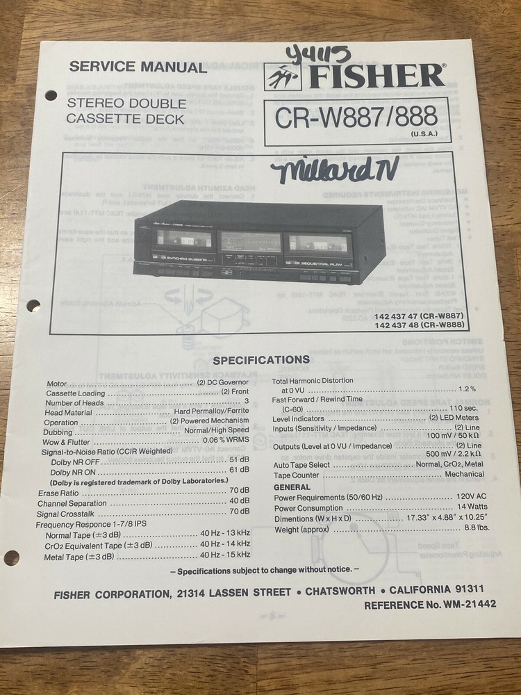This is for an original FISHER service MANUAL, includes REPAIR INFO, part numbers and SCHEMATIC DIAGRAMS MODEL - CR-W887 CR-W888 STEREO DOUBLE CASSETTE DECK Manual is in VERY GOOD CONDITION, Doesn't look like it was ever used. WE HAVE NO STEREO UNITS, OR AMPLIFIERS LEFT!!! THESE ARE ALL THE FISHER MANUALS WE HAVE LEFT. IF YOU DON'T SEE IT i DON'T HAVE IT. We closed out our electronic Service Shop a few years ago and are selling off the manuals we have left, some of which are manuals we acquired from other service centers that have closed.. Please check our other auctions for other closeout clearance items. I will be listing them as quick as I can but will probably take several months to list everything we have left. Item will be shipped in an envelope. Shipping is FREE in the 48 States only. $14.02 I nternational shipping. PLEASE check our other auctions. We Give free shipping in the U.S. for each additional manual purchased. Item will be shipped USPS economic shipping and may take 1-9 days. If you want faster shipping please let me know. ITEM IS SOLD "AS IS"! Thank You for the bid, and GOD BLESS THE U.S.A .