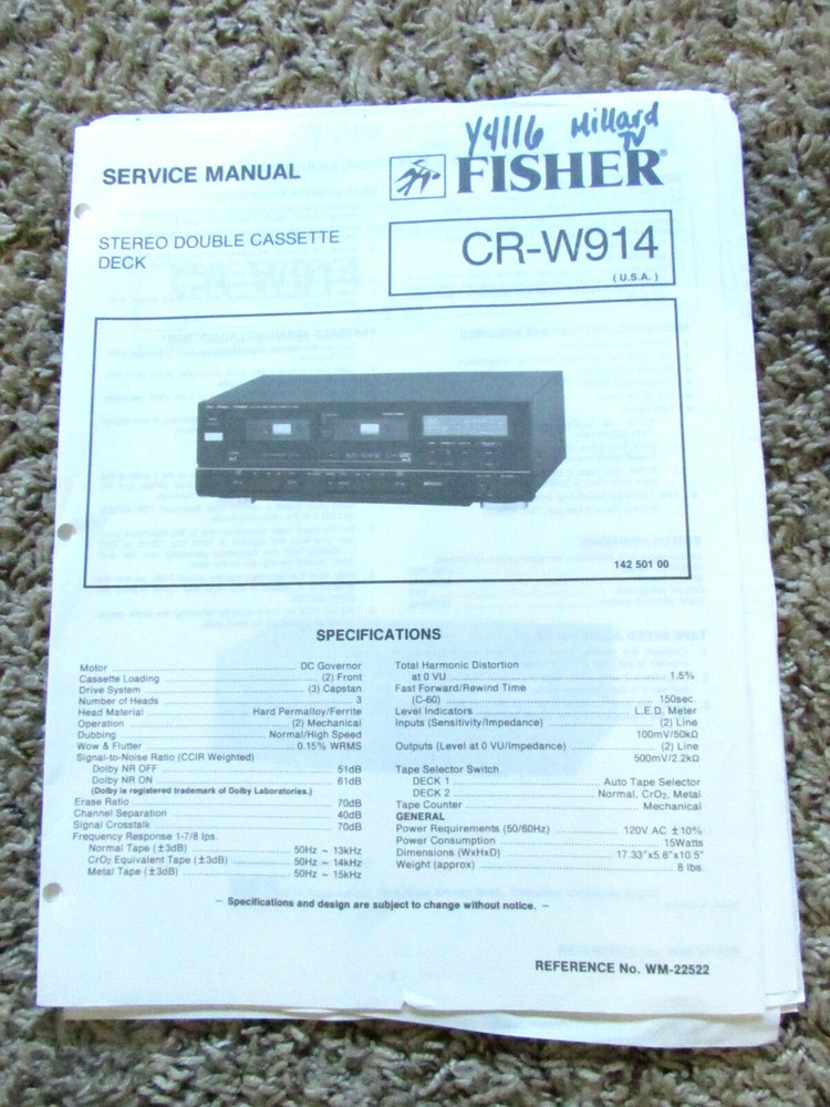 This is for an original FISHER service MANUAL, includes REPAIR INFO, part numbers and SCHEMATIC DIAGRAMS MODEL - CR-W914 STEREO DOUBLE CASSETTE DECK Manual is in VERY GOOD CONDITION, Doesn't look like it was ever used. WE HAVE NO STEREO UNITS, OR AMPLIFIERS LEFT!!! THESE ARE ALL THE FISHER MANUALS WE HAVE LEFT. IF YOU DON'T SEE IT i DON'T HAVE IT. We closed out our electronic Service Shop a few years ago and are selling off the manuals we have left, some of which are manuals we acquired from other service centers that have closed.. Please check our other auctions for other closeout clearance items. I will be listing them as quick as I can but will probably take several months to list everything we have left. Item will be shipped in an envelope. Shipping is FREE in the 48 States only. $14.02 I nternational shipping. PLEASE check our other auctions. We Give free shipping in the U.S. for each additional manual purchased. Item will be shipped USPS economic shipping and may take 1-9 days. If you want faster shipping please let me know. ITEM IS SOLD "AS IS"! Thank You for the bid, and GOD BLESS THE U.S.A .