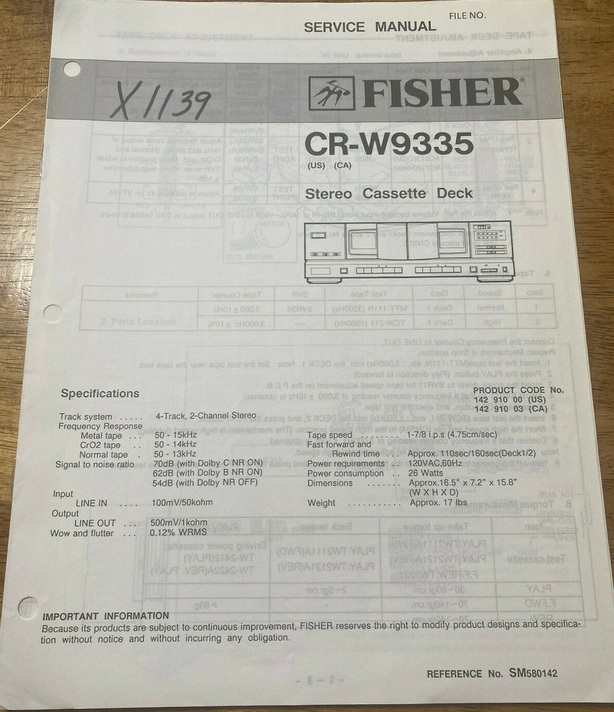 This is for an original FISHER service MANUAL, includes REPAIR INFO, part numbers and SCHEMATIC DIAGRAMS MODEL - CR-W9335 STEREO CASSETTE DECK VERY GOOD CONDITION, Doesn't look like it was ever used. WE HAVE NO STEREO UNITS, OR AMPLIFIERS LEFT!!! THESE ARE ALL THE FISHER MANUALS WE HAVE LEFT. IF YOU DON'T SEE IT i DON'T HAVE IT. We closed out our electronic Service Shop a few years ago and are selling off the manuals we have left, some of which are manuals we acquired from other service centers that have closed.. Please check our other auctions for other closeout clearance items. I will be listing them as quick as I can but will probably take several months to list everything we have left. Item will be shipped in an envelope. Shipping is FREE in the 48 States only. $14.02 I nternational shipping. PLEASE check our other auctions. We Give free shipping in the U.S. for each additional manual purchased. Item will be shipped USPS economic shipping and may take 1-9 days. If you want faster shipping please let me know. ITEM IS SOLD "AS IS"! Thank You for the bid, and GOD BLESS THE U.S.A .