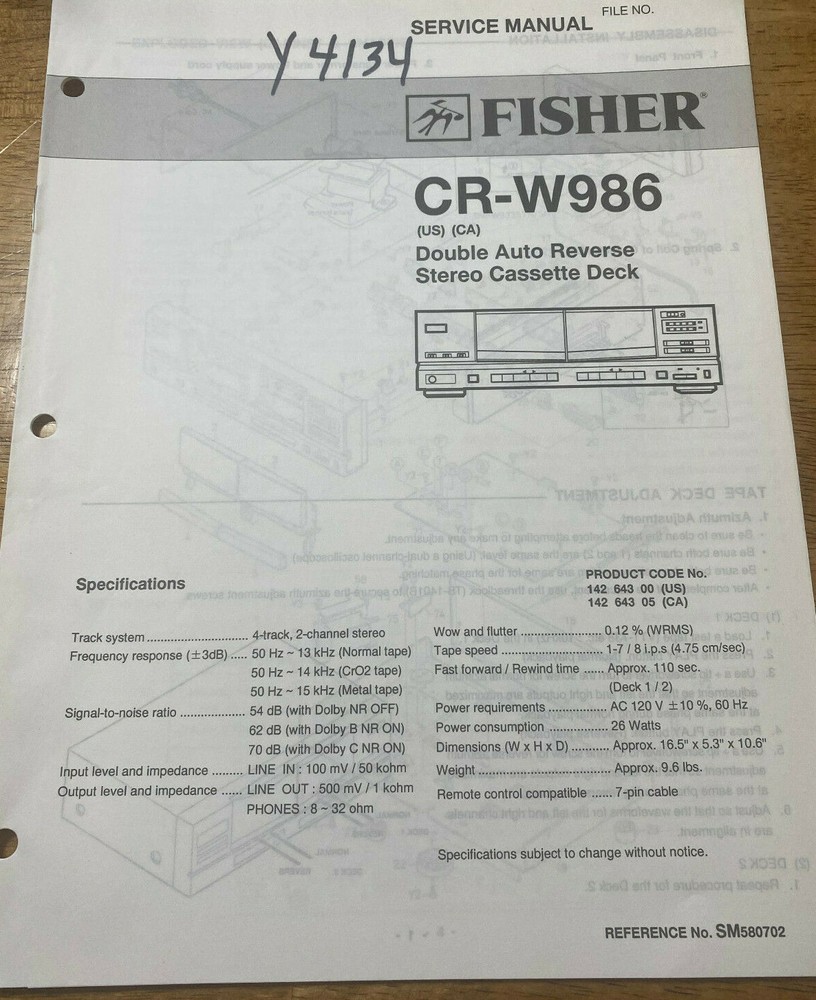 This is for an original FISHER service MANUAL, includes REPAIR INFO, part numbers and SCHEMATIC DIAGRAMS MODEL - CR-W986 STEREO DOUBLE CASSETTE DECK VERY GOOD CONDITION, Doesn't look like it was ever used. WE HAVE NO STEREO UNITS, OR AMPLIFIERS LEFT!!! THESE ARE ALL THE FISHER MANUALS WE HAVE LEFT. IF YOU DON'T SEE IT i DON'T HAVE IT. We closed out our electronic Service Shop a few years ago and are selling off the manuals we have left, some of which are manuals we acquired from other service centers that have closed.. Please check our other auctions for other closeout clearance items. I will be listing them as quick as I can but will probably take several months to list everything we have left. Item will be shipped in an envelope. Shipping is FREE in the 48 States only. $14.02 I nternational shipping. PLEASE check our other auctions. We Give free shipping in the U.S. for each additional manual purchased. Item will be shipped USPS economic shipping and may take 1-9 days. If you want faster shipping please let me know. ITEM IS SOLD "AS IS"! Thank You for the bid, and GOD BLESS THE U.S.A .