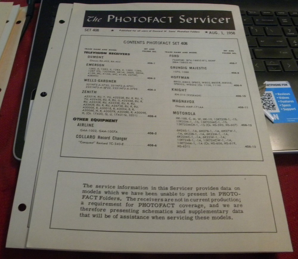 YOU ARE BIDDING ON AN AUGUST 1, 1958 ELECTRONIC SCHEMATIC FOR FISHER FM TUNER MODEL: FM-90 , PUBLISHED BY HOWARD W. SAMS & CO., INC., INDIANAPOLIS, IN. THIS IS PHOTOFACT SERVICER FROM SAM'S PHOTOFACT SET 408! THE SERVICE INFORMATION IN THIS SERVICER PROVIDES DATA ON MODELS WHICH WERE UNABLE TO BE PRESENTED IN PHOTOFACT FOLDERS. THE RECEIVERS WERE NOT IN CURRENT PRODUCTION; A REQUIREMENT FOR PHOTOFACT COVERAGE. THIS SERVICER CONTAINS SCHEMATICS AND PROPER WAVEFORMS ONLY. EXCELLENT CONDITION; NORMAL SHELF WEAR! All schematics will be shipped via First Class Shipping with delivery confirmation. I accept payment via Paypal! IF YOU KNOW ANYONE WHO WOULD LIKE ANY OF MY MERCHANDISE, PLEASE FEEL FREE TO USE THE "SHARE" FEATURE IN THE LISTING. I HAVE SEVERAL THOUSAND DOLLARS WORTH OF DIECAST CARS AND ELECTRONIC SCHEMATICS THAT I HAVEN'T LISTED YET, SO IF YOU DON'T SEE WHAT YOU ARE LOOKING FOR IN MY EBAY STORE, PLEASE LET ME KNOW AND I WILL SEE IF I HAVE IT IN MY INVENTORY. IF I DO HAVE IT, I WILL LIST IT AS A "BUY IT NOW" AND SEND YOU A MESSAGE LETTING YOU KNOW. THANKS, AND HAPPY SHOPPING!