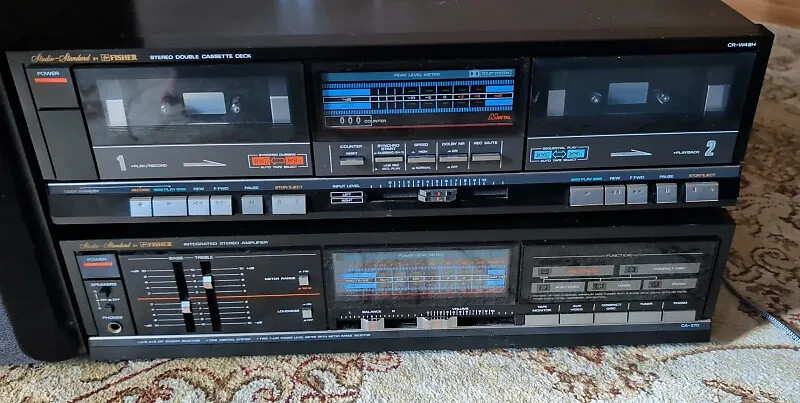 Amplifier tested and fully worked. Cassette deck: When I press the play button, I hear sound but it doesn't spin. I don't have a cassette so I can't test it. I tried to show it in the video. Fisher Studio-Standard stereo system, which consists of a stereo double cassette deck (CR-W48H) and an integrated stereo amplifier (CA-270) . Cassette Deck (Fisher CR-W48H) Dual Cassette Mechanism: Two tape compartments for recording and playback. Dolby System: Noise reduction feature for improved sound quality. Peak Level Meter: LED display showing audio levels. Auto Tape Select: Automatically selects the tape type (e.g., normal, metal). Play, Rewind, Fast Forward, Pause, Stop: Standard tape deck controls. Sequential Play: Allows automatic playback from one deck to another. Record Function: Allows dubbing and recording from external sources. Stereo Amplifier (Fisher CA-270) Bass & Treble Equalizers: Slider controls for adjusting sound frequencies. Power Level Meter: LED display showing wattage output. Volume & Balance Controls: Manual sliders for volume adjustment and left/right channel balancing. Speaker Outputs: Options to connect multiple speaker sets. Input Selection: Supports multiple audio sources (Tape, CD, Tuner, Phono, AUX/Video). Headphone Jack: 3.5mm or 6.3mm input for private listening. Loudness Button: Enhances bass and treble frequencies at low volume. This setup is a great example of classic home audio equipment, offering both cassette playback/recording and amplifier functionality for various input sources.