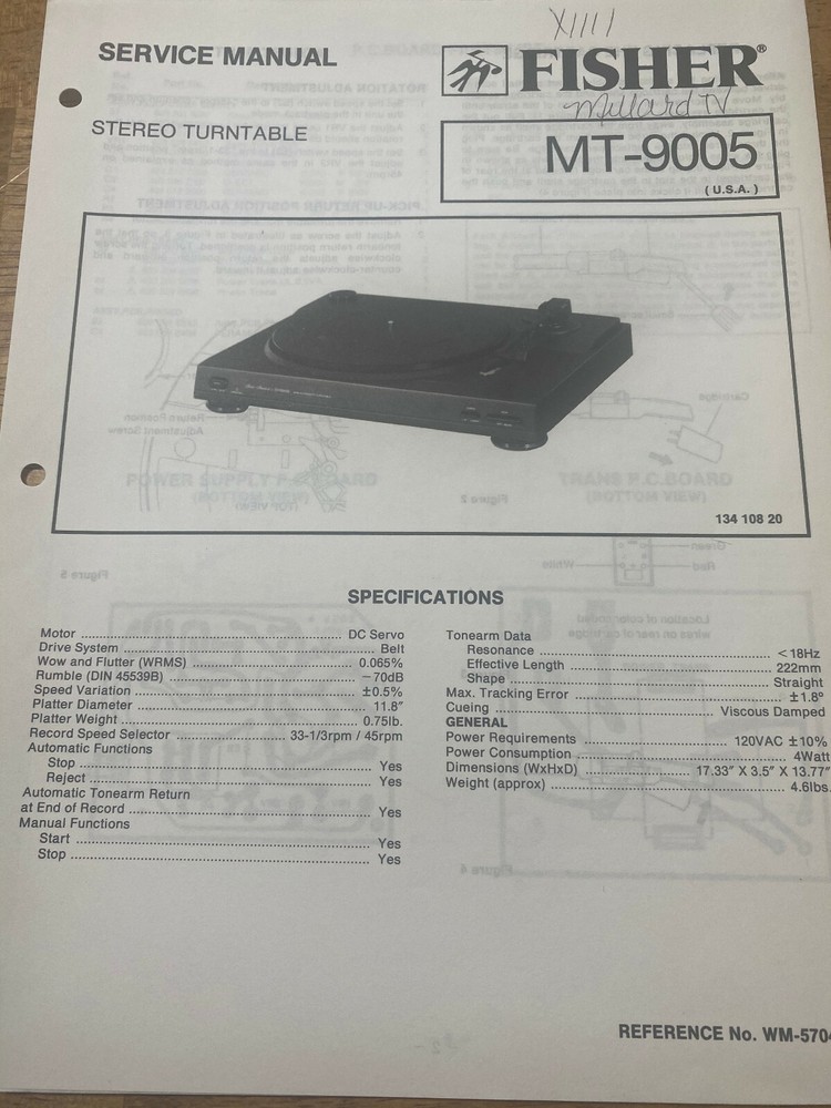 This is for an original FISHER service MANUAL, includes REPAIR INFO, part numbers and SCHEMATIC DIAGRAMS MODEL - MT-9005 STEREO TURNTABLE VERY GOOD CONDITION, Doesn't look like it was ever used. WE HAVE NO STEREO UNITS, OR AMPLIFIERS LEFT!!! THESE ARE ALL THE FISHER MANUALS WE HAVE LEFT. IF YOU DON'T SEE IT i DON'T HAVE IT. We closed out our electronic Service Shop a few years ago and are selling off the manuals we have left, some of which are manuals we acquired from other service centers that have closed.. Please check our other auctions for other closeout clearance items. I will be listing them as quick as I can but will probably take several months to list everything we have left. Item will be shipped in an envelope. Shipping is FREE in the 48 States only. $14.02 I nternational shipping. PLEASE check our other auctions. We Give free shipping in the U.S. for each additional manual purchased. Item will be shipped USPS economic shipping and may take 1-9 days. If you want faster shipping please let me know. ITEM IS SOLD "AS IS"! Thank You for the bid, and GOD BLESS THE U.S.A .