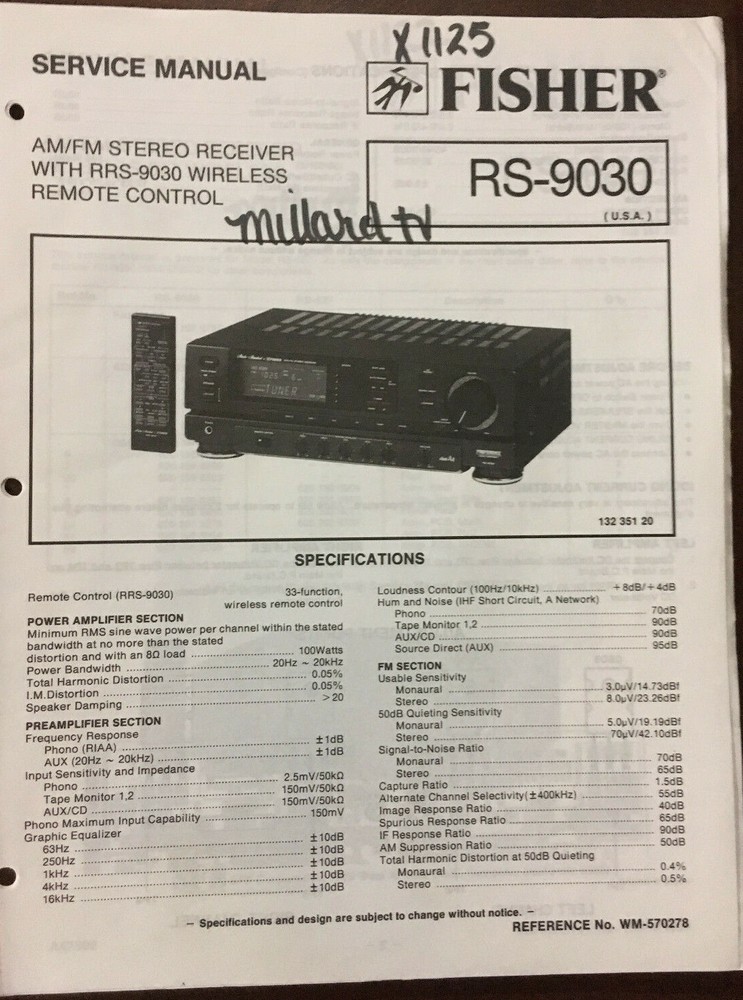 This is for an original FISHER service MANUAL, includes REPAIR INFO, part numbers and SCHEMATIC DIAGRAMS MODEL - RS-9030 AM / FM STEREO RECEIVER WITH RRS-9030 WIRELESS REMOTE CONTROL VERY GOOD CONDITION, Doesn't look like it was ever used. WE HAVE NO STEREO UNITS, OR AMPLIFIERS LEFT!!! THESE ARE ALL THE FISHER MANUALS WE HAVE LEFT. IF YOU DON'T SEE IT i DON'T HAVE IT. We closed out our electronic Service Shop a few years ago and are selling off the manuals we have left, some of which are manuals we acquired from other service centers that have closed.. Please check our other auctions for other closeout clearance items. I will be listing them as quick as I can but will probably take several months to list everything we have left. Item will be shipped in an envelope. Shipping is FREE in the 48 States only. $14.02 I nternational shipping. PLEASE check our other auctions. We Give free shipping in the U.S. for each additional manual purchased. Item will be shipped USPS economic shipping and may take 1-9 days. If you want faster shipping please let me know. ITEM IS SOLD "AS IS"! Thank You for the bid, and GOD BLESS THE U.S.A .