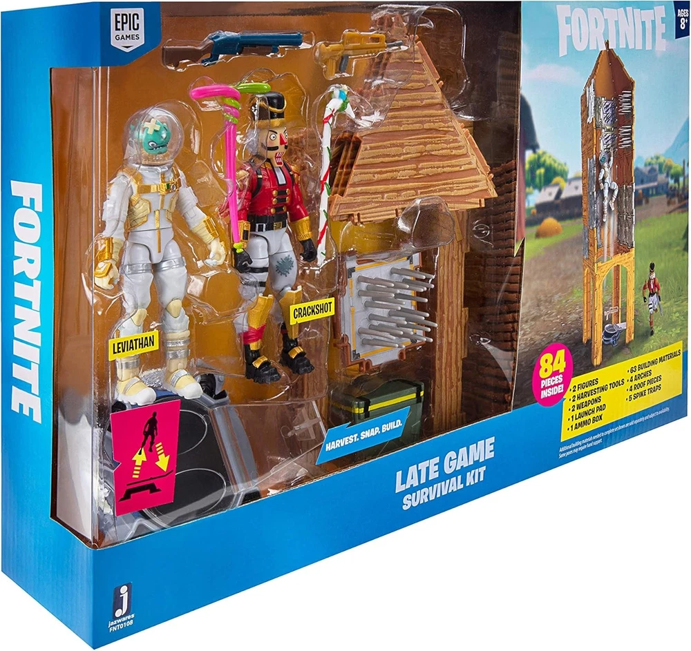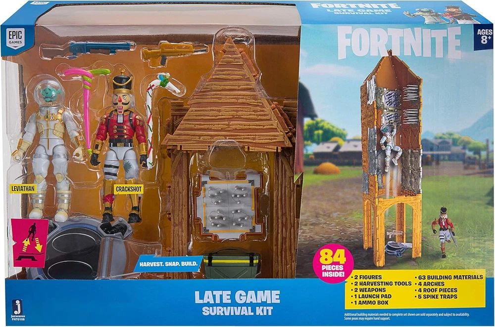 FORTNITE Late Game-Survival Kit Product Details Product Dimensions: 6 x 10 x 15 inches Item Weight: 3.52 ounces Item model number: FNT0108 Manufacturer recommended age: 8 years and up Release date: September 4, 2019 Manufacturer: Jazwares Each 4-inch action figure has 25+ points of articulation and highly detailed decoration inspired by one of the most popular outfits from Epic Games' Fortnite. The kit includes exclusive Pump Shotgun and Legendary Burst weapons, Balloon Axe and Candy Axe harvesting tools, and battle box and Launch Pad accessories. Roof, arch, and spike trap pieces allow you to take building to the next level! Additional building materials sold separately and subject to availability. Official Licensed Product. The Late Game survival kit includes 2 incredibly detailed 4-inch action figures featuring a weapon, umbrella, and a building material/stand.