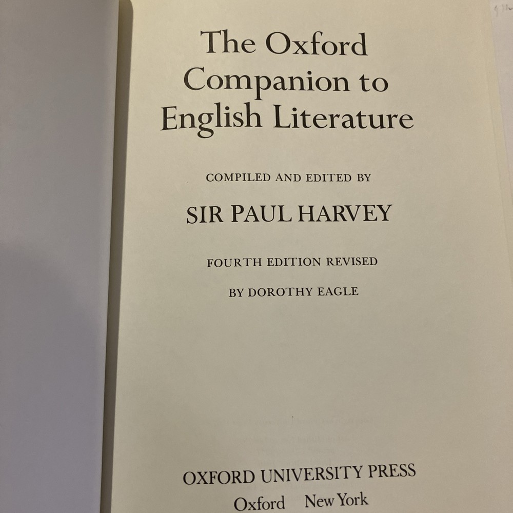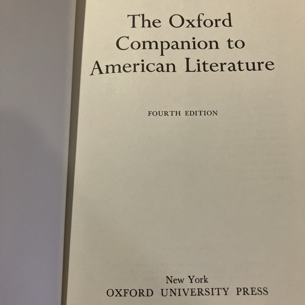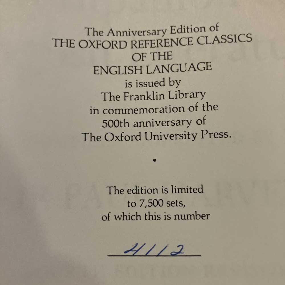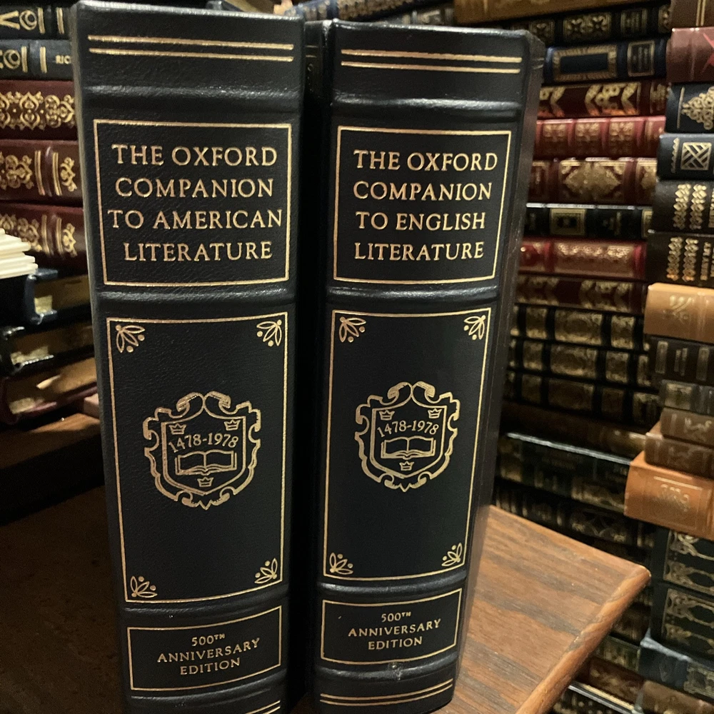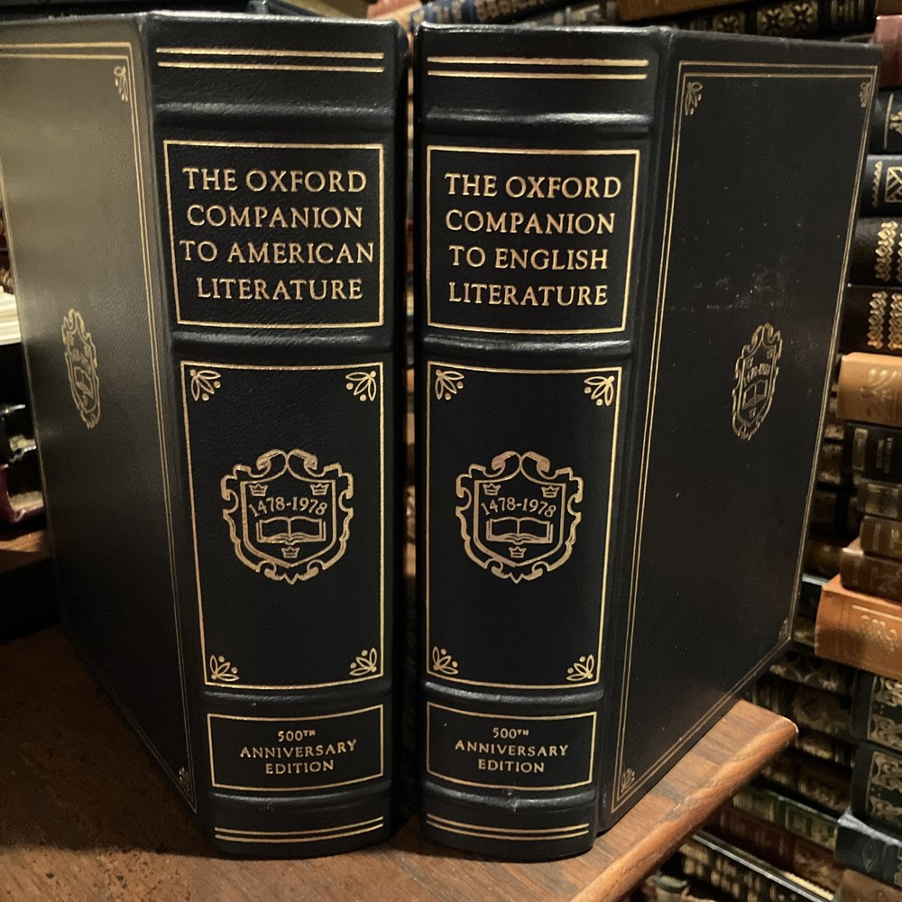 Fresh from a Fayetteville, Arkansas estate is this set of Franklin Library / Oxford University Press "Oxford Companion to American Literature," Edited by James D. Hart, and "Oxford Companion to English Literature," Edited by Sir Paul Harvey. Bound in premium dark blue leathers, the books have navy blue moire silk end leaves, satin book markers, gold gilt on three edges, hubbed spine and Symth-sewn binding. The set is beautifully illustrated and printed on archival-quality, acid neutral paper. In commemoration of 500th anniversary of the Oxford University Press, this set was produced and limited to 7500. These two volumes are 4112. American Literature has 991 pages, with entries from Edwin Abbey to the Zuni Indians. The book has a Chronological Index, Literary History, and Social History. Authors include some of my favorites: Anne Bradstreet, Bertolt Brecht, George Washington Cable, John Donne, William Faulkner, Emily Dickinson, Ford Madox Ford, Robert Frost, Nathaniel Hawthorne, Ernest Hemingway, Langston Hughes, Flannery O'Connor, O'Henry, Henry David Thoreau, Eudora Welty, Booker T. Washington, John Greenleaf Whittier, Walt Whitman, Tennessee Williams, and William Carlos Williams. "The Oxford Companion to English Literature" was compiled and edited by Sir Paul Harvery, the Fourth Edition Revised by Dorothy Eagle. Entries range from Gilbert Abbot A Beckett to Ulrich Zwingli, 961 pages, including an Appendix, The History of English Copyright, The Calendar, and Saints' Days Used in Dating Documents and Tables. Some of my favorite English authors include: Jane Austen, Emily Bronte, John Bunyan, Willa Cather, Geoffrey Chaucer, Oliver Goldsmith, Aldous Huxley, Richard Lovelace, John Milton, Homer, George Orwell, Bertrand Russell, John Keats, Mary Shelley, Percy Bysshe Shelley, Socrates, Alfred Lord Tennyson, William Makepeace Thackeray, and William Wordsworth. Both volumes are in near FINE condition. These two books will become primary references for both American and English literature. I offer combined shipping.