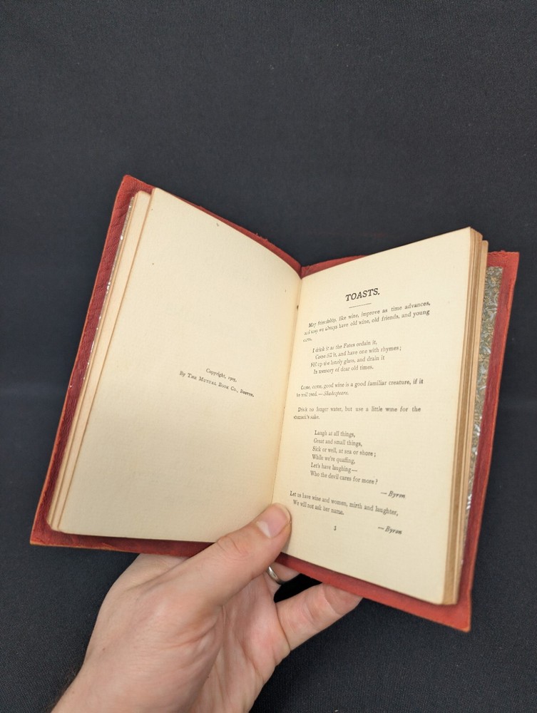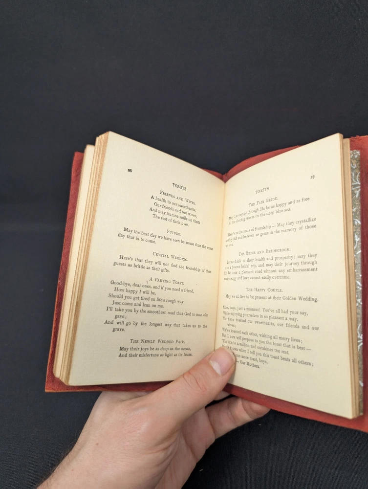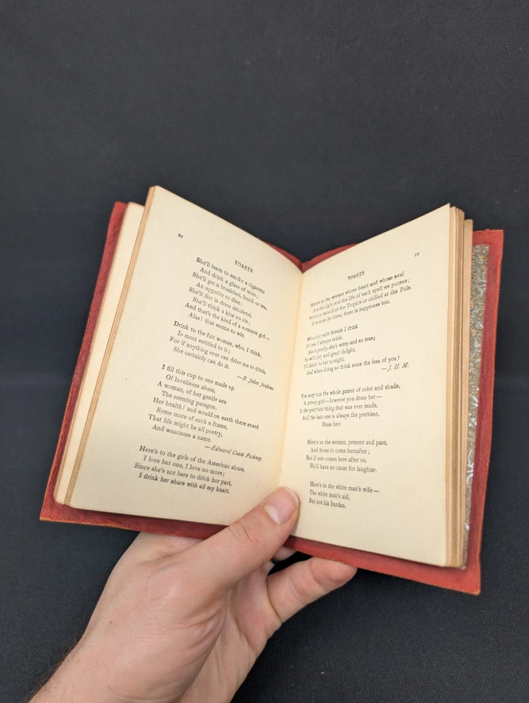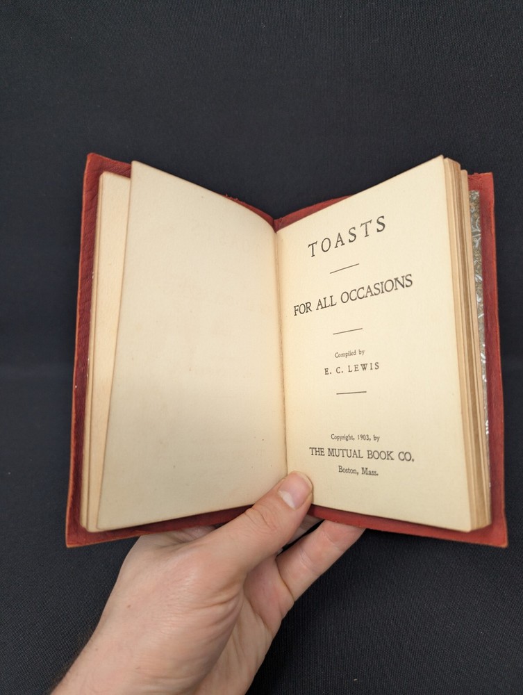 Toasts , a 100+ Year Old Book with Great Quotes with a toast for most all occasions! Be a point of inspiration at your next gathering with this 100+ year old toast pocketbook! From endearing to slightly bawdy, a toast for any occasion can be found in this gilt leather book! For instance: Here’s a turkey when you are hungry, Champagne when you are dry, A pretty girl when you need her, And heaven when you die . This little pocket book has been compiled by E.C. Lewis and published by The Mutual Book Company 1903. Condition: This book is in VERY GOOD (+) condition! It has some light wear to the front cover and a few spots of discoloration. The pages inside are clean with no missing or torn pages. A great gift for the toastmaster in your life! Measurements (approx): Dimensions: 4 by 5¾ in I offer a 30-day money-back refund if you are not satisfied with your purchase for any reason if the item is returned in the same condition as to how it was sent. Thank you for looking, and I hope to have your purchase and satisfaction! A Bit About from Whom You Are Buying: I have 100% positive feedback and have been selling on eBay since 2006. Your item will come from a pet and smoke-free home. I hope that your experience with the item you purchase is as satisfactory as my joy in obtaining and listing the item. I would appreciate positive feedback if you are satisfied with your purchase. If you are not satisfied, please let me know and allow me the opportunity to make it right. Thank you for looking and I look forward to having your business! My Hours I will respond to requests, returns, concerns, and questions Monday through Friday, 10 am – 6 pm Eastern Time. Friday and weekend orders usually ship out the following Monday. Returns: I accept a no-questions-asked money back return policy granted the request is made up to 30 days after the item arrives. I refund only the purchase price of the item and, if free return shipping is offered on the listing, the full return shipping. It is your responsibility to return the item to me in the same condition it was sent to you. If the item is returned in an inferior condition as to how it was sent, a full return might not be granted. New items that come back in an inferior condition or are removed from their original packaging will not be granted a full refund. ***International Customers Only: Unless otherwise stated, I do not accept international returns at this time.*** Payment: Payment must be received no later than 7 days after the auction closes. If you cannot pay within this time, please contact me with detailed instructions on how you would like to purchase the item. If payment is not received, and/or contact has not been made within this time, the sale will be canceled. International Bidders: I ship through the Global Shipping Program. All international shipping quotes reflect import taxes and duties, as well as total shipping cost.